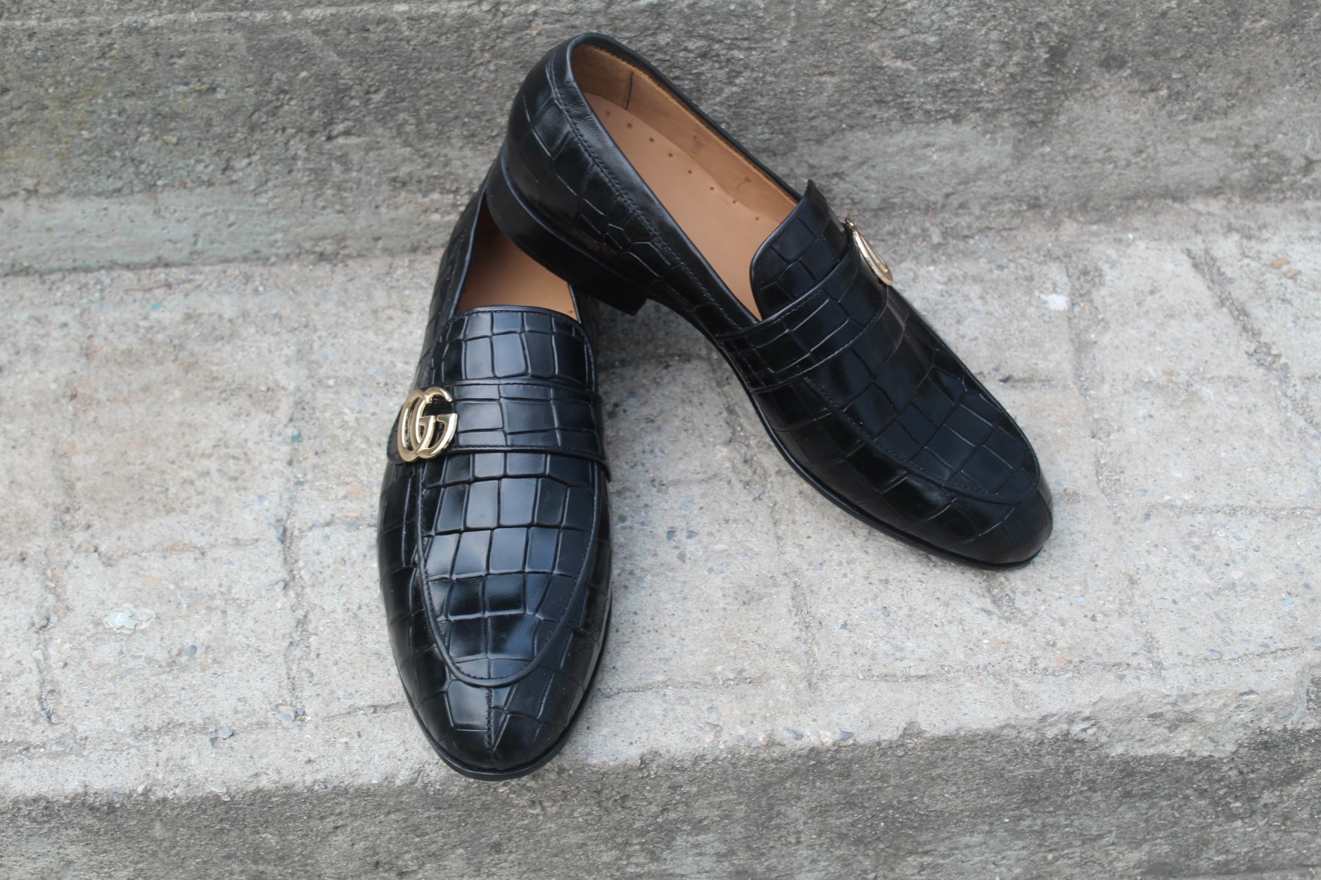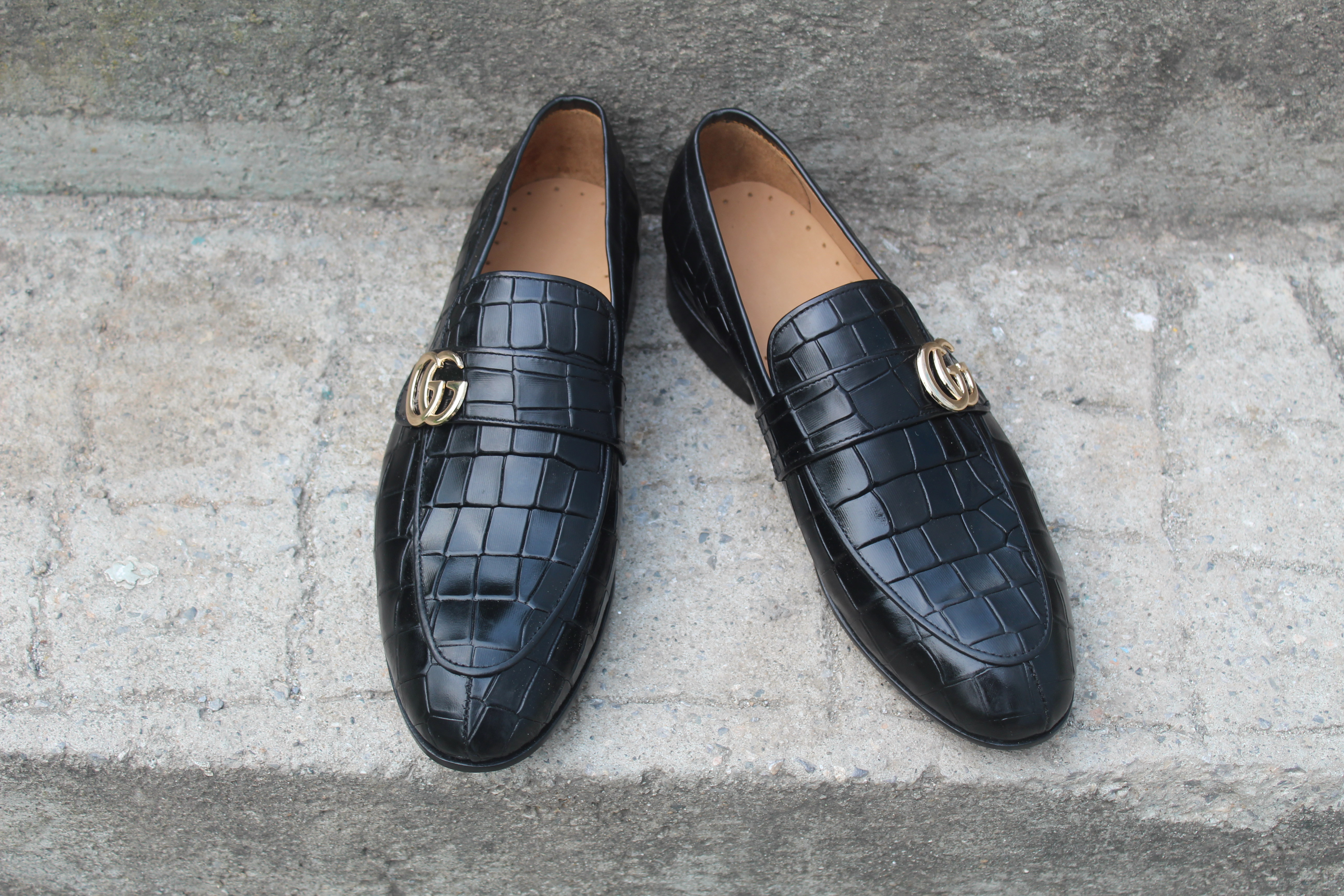 Crafted Leather Black Genuine Embossed Crocodile Texture Leather Loafers Dress Shoes
