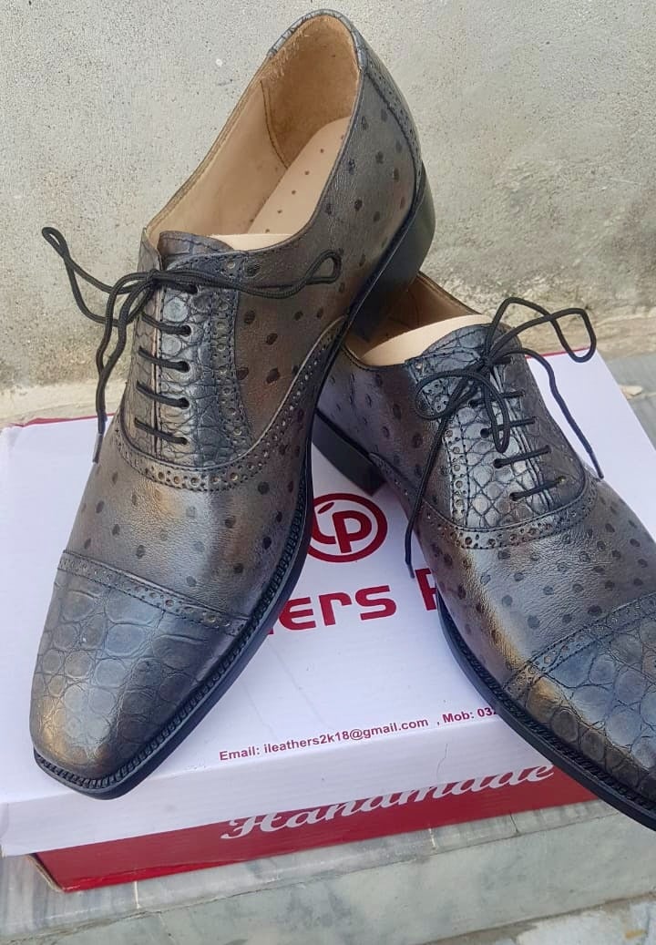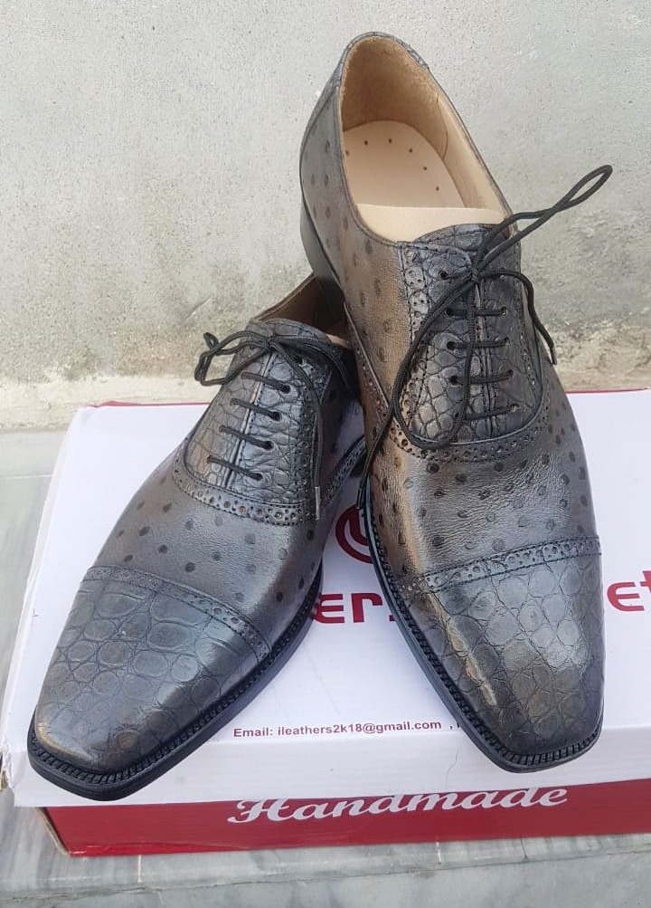 Crafted Leather Mens Gray Classic Ostrich and Crocodile Texture Leather Lace up Alligator Dress Oxford Shoes