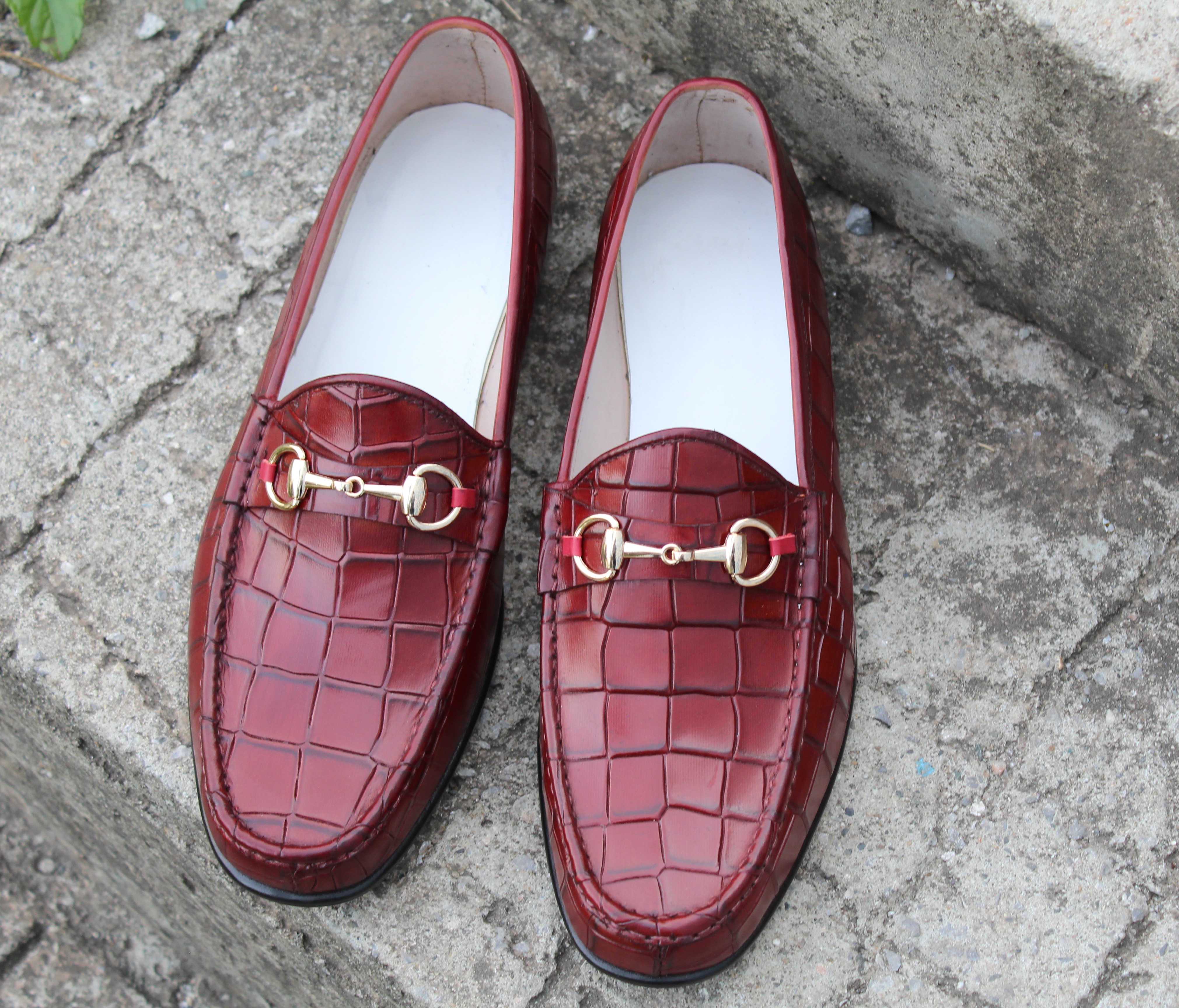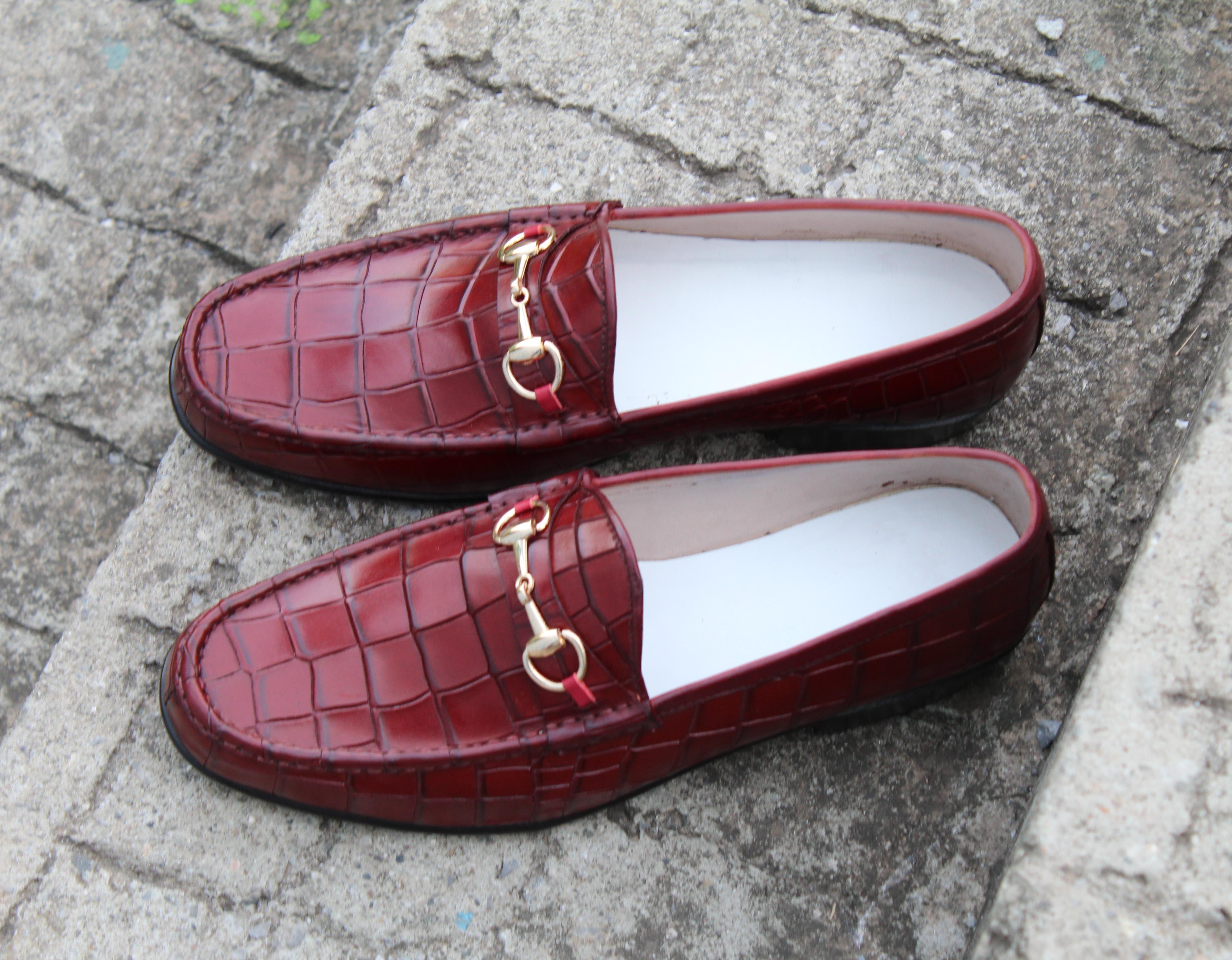 Crafted Leather Burgundy Color Crocodile Texture Horse bit Loafers Dress Shoes