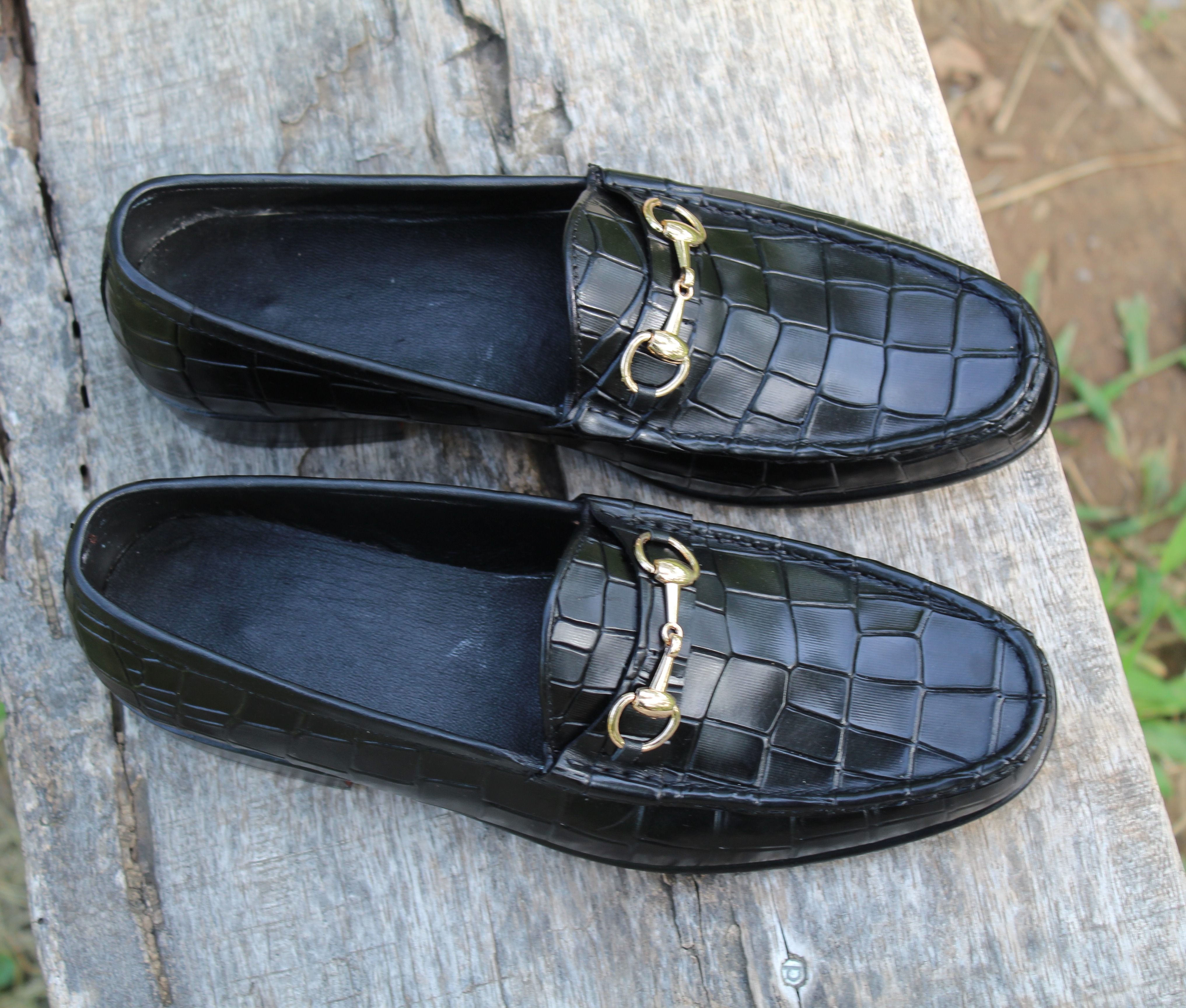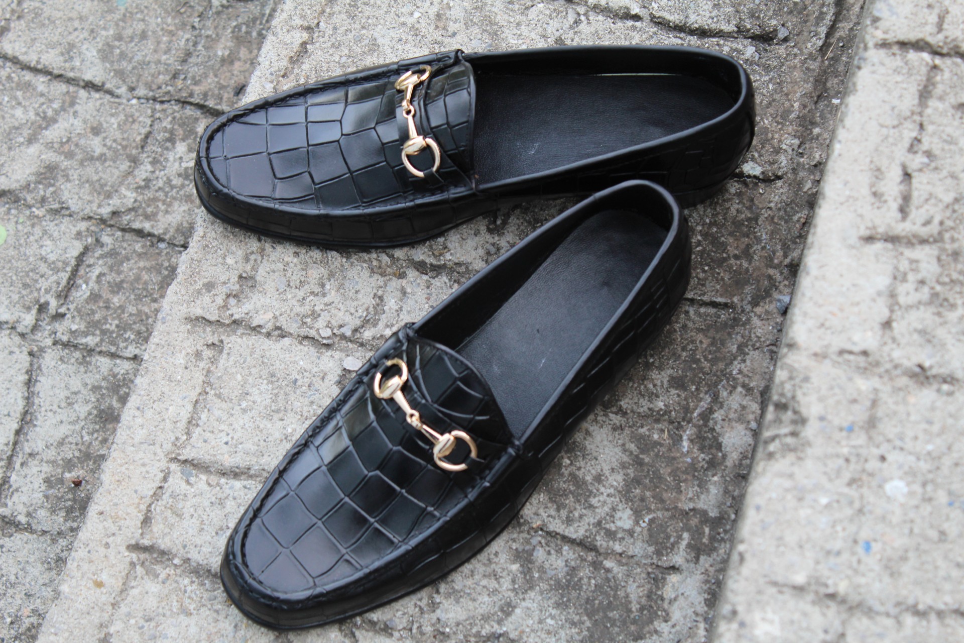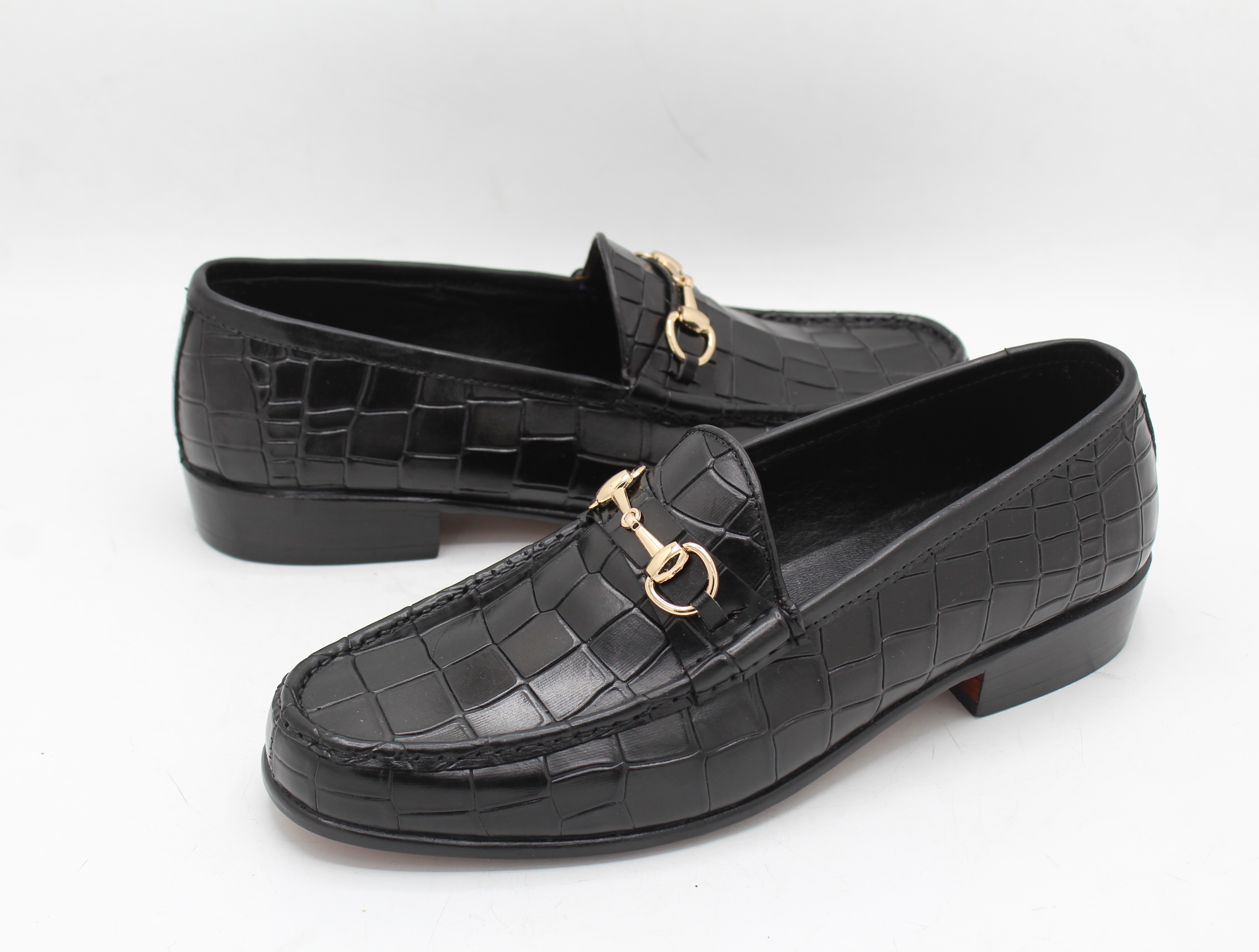 Crafted Leather Black Crocodile Texture Leather Horsebit Moccasin Loafer Dress Shoes