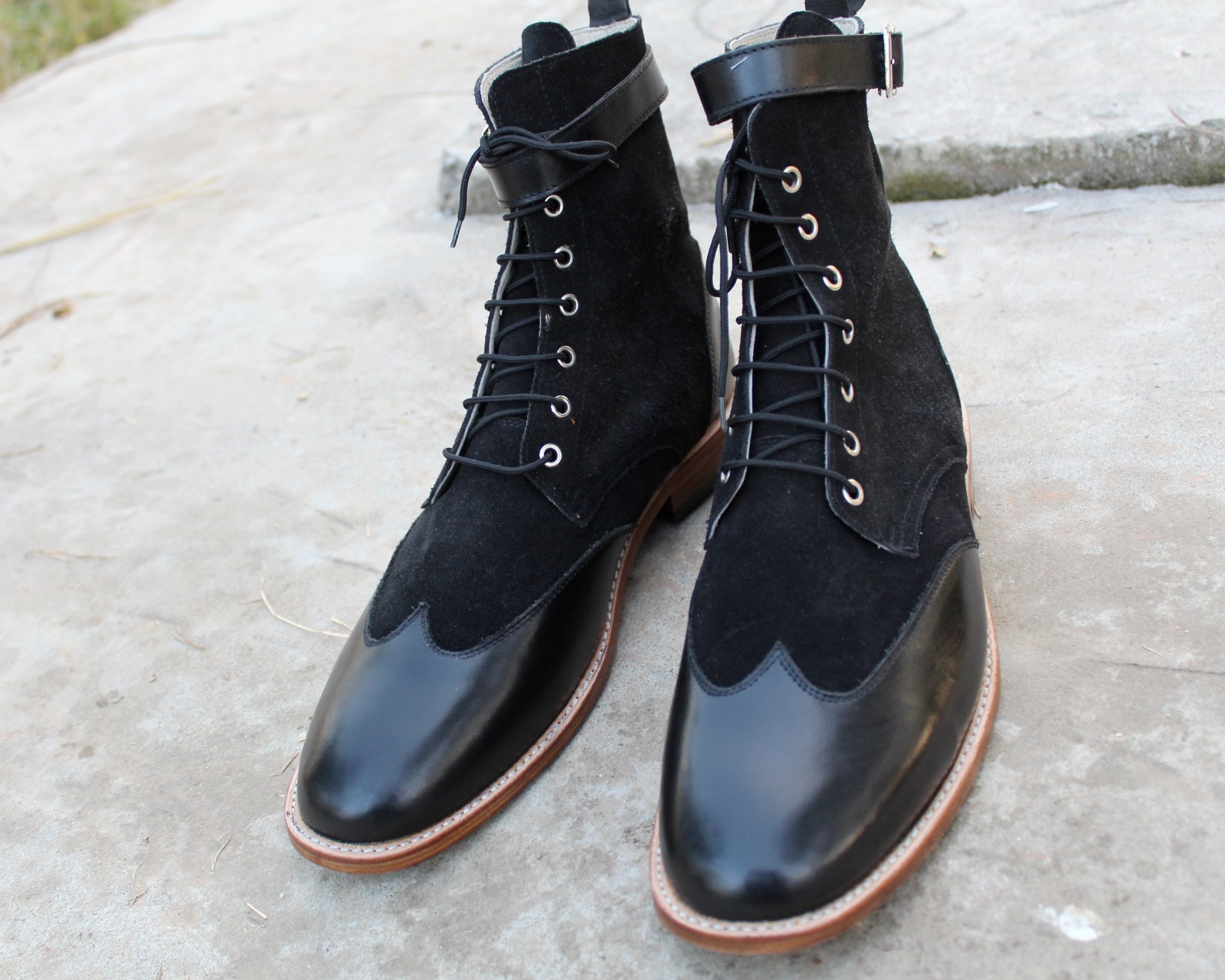 Crafted Leather Black Calf and Black Suede Leather Shoes Ankle High Wingtip Buckle Strap Lace up Dress Boot