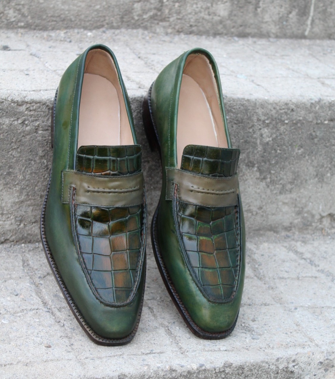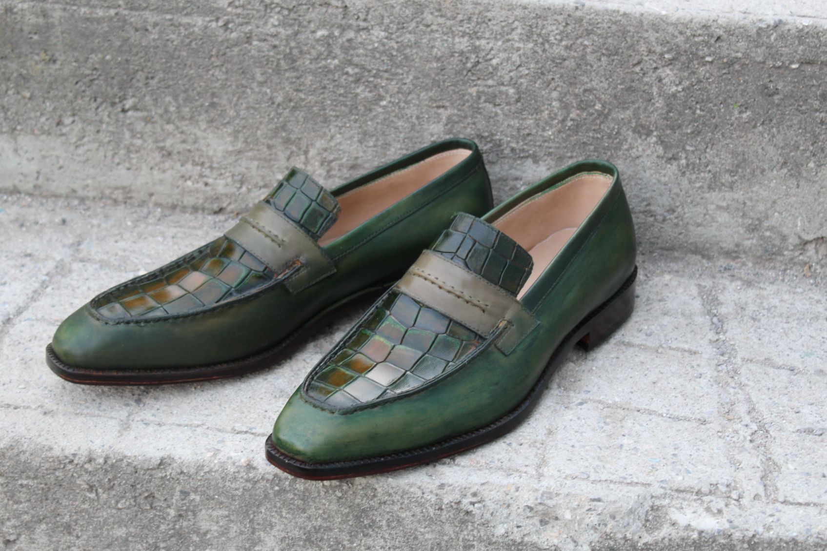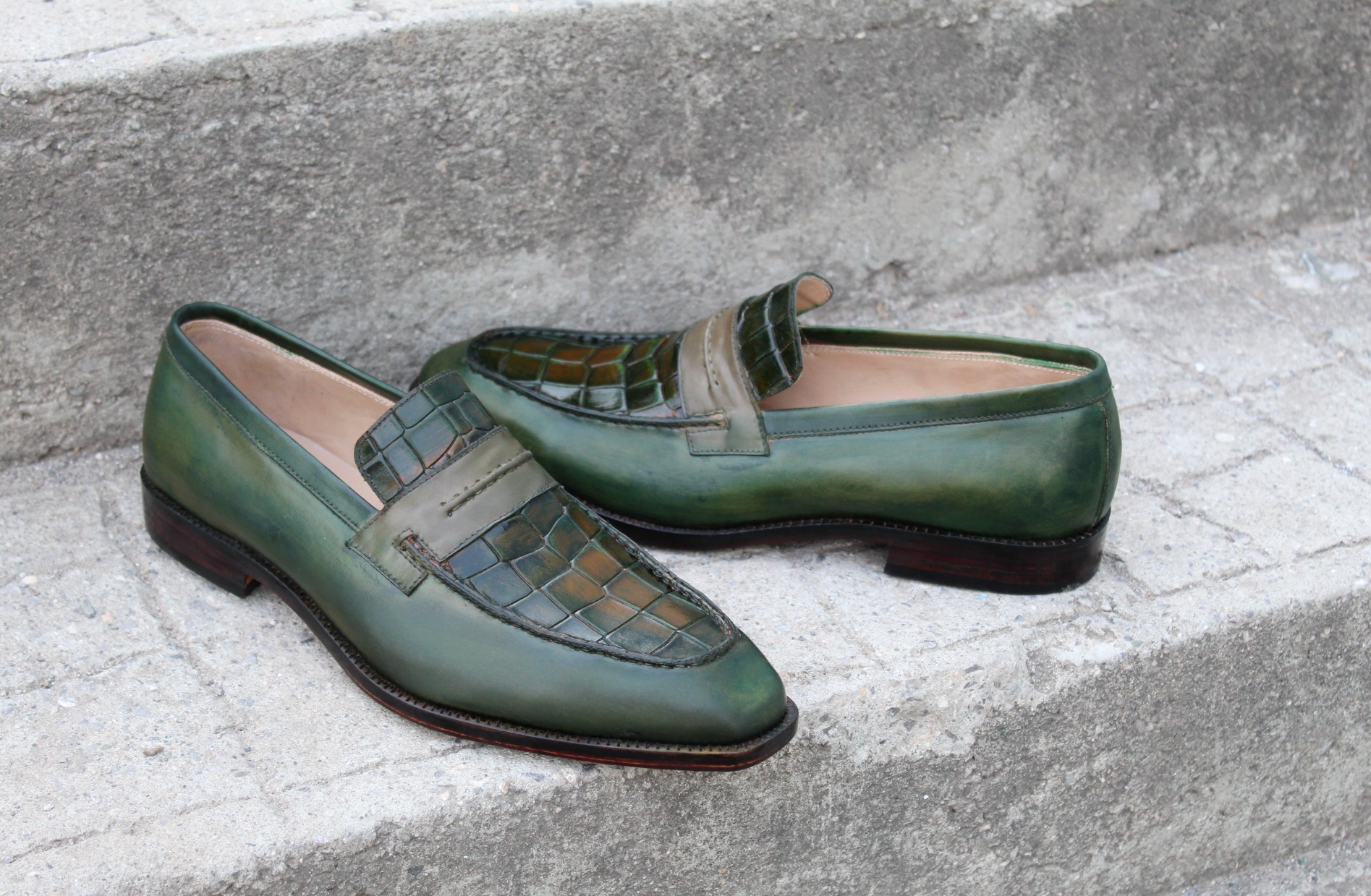 Crafted Leather Classic Men Alligator Dress Shoes Green Patina Exotic Crocodile Leather Moccasin Loafers