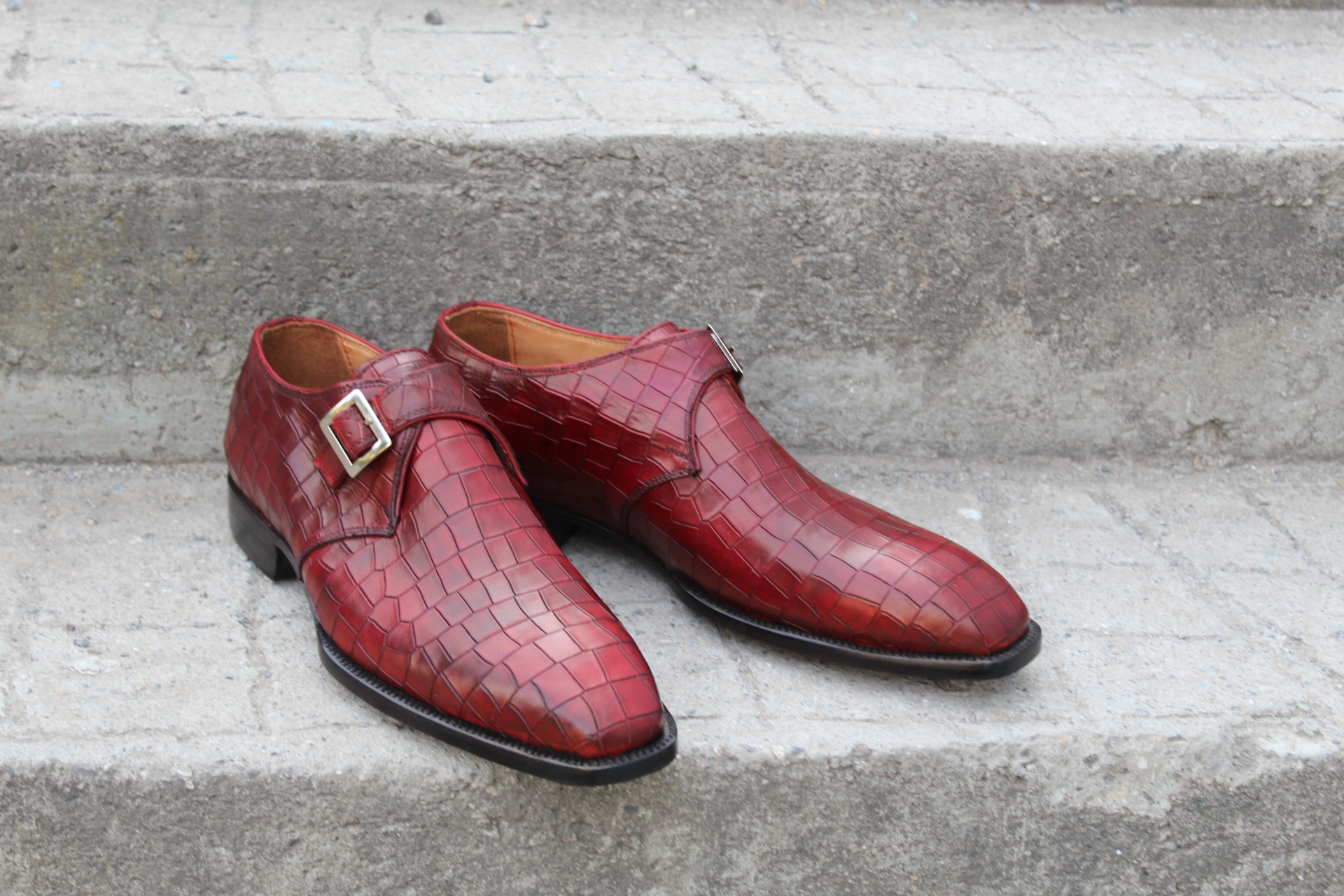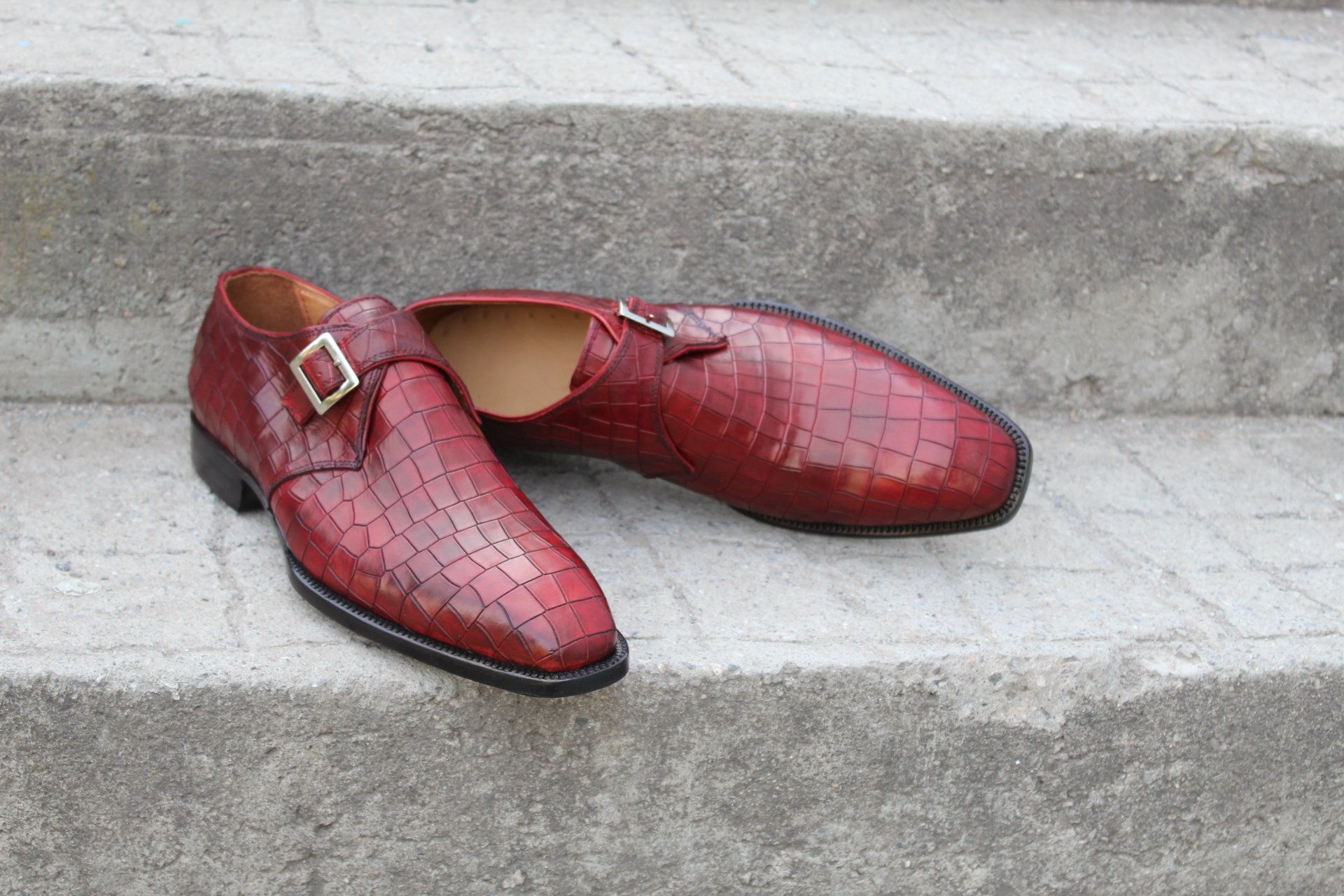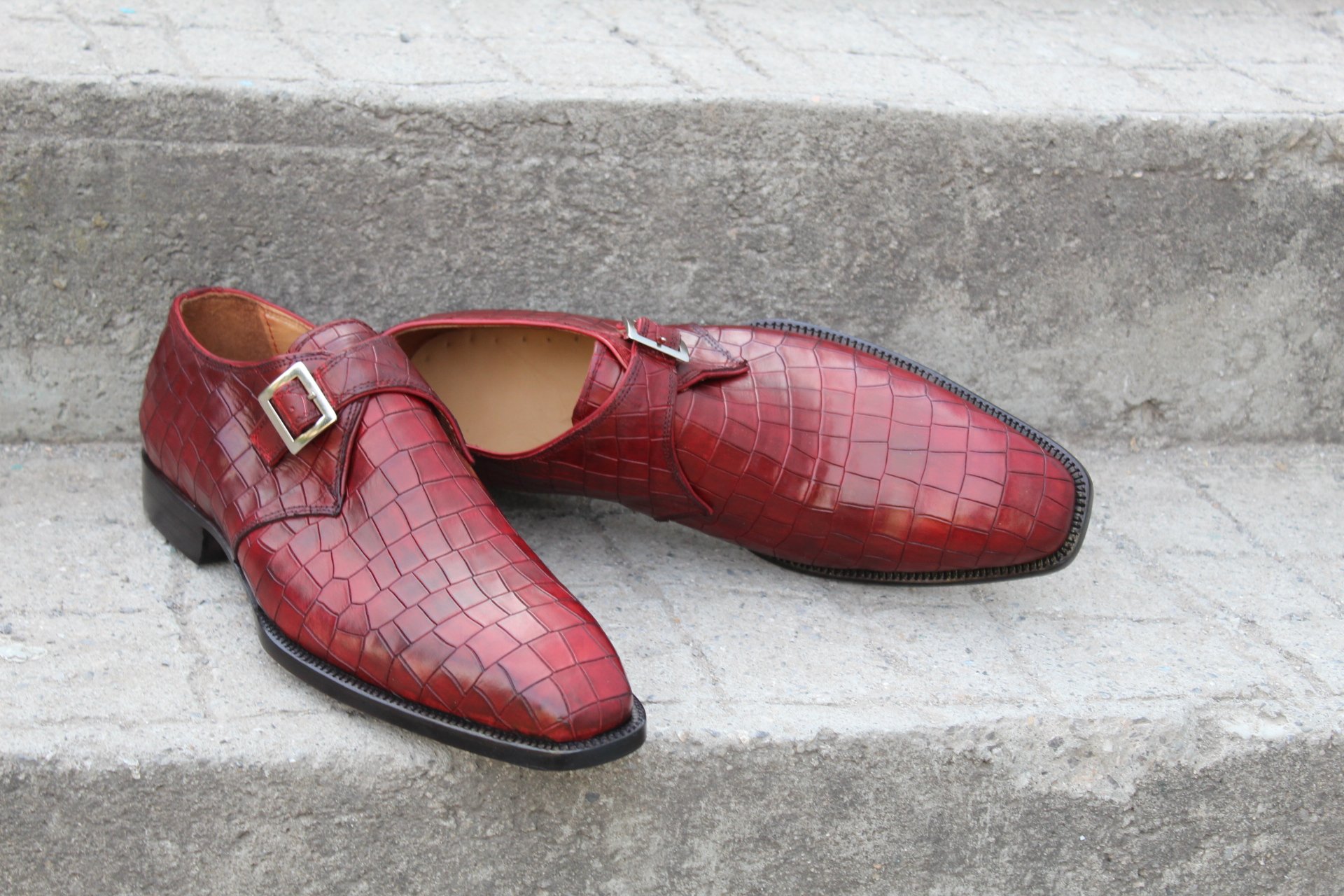 Crafted Leather Classic Red Crocodile Leather Monk Strap Alligator Dress Shoes