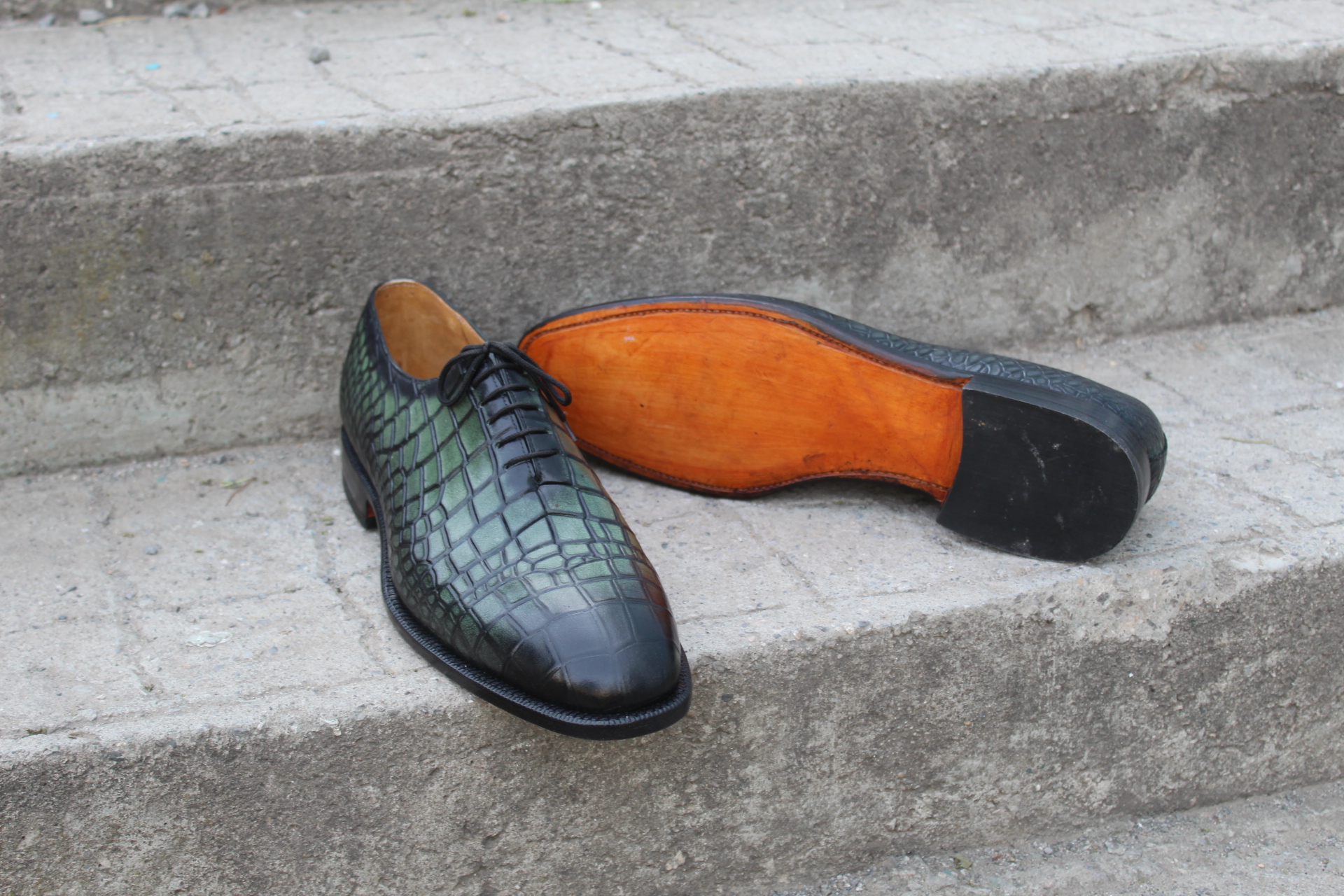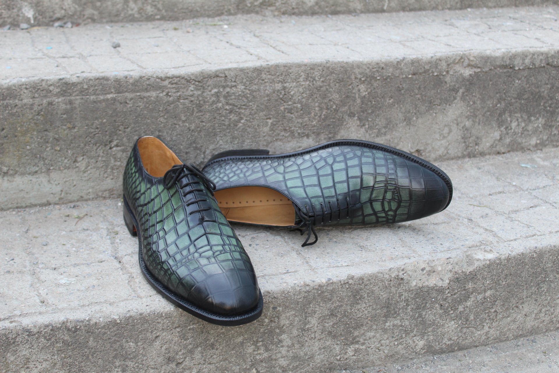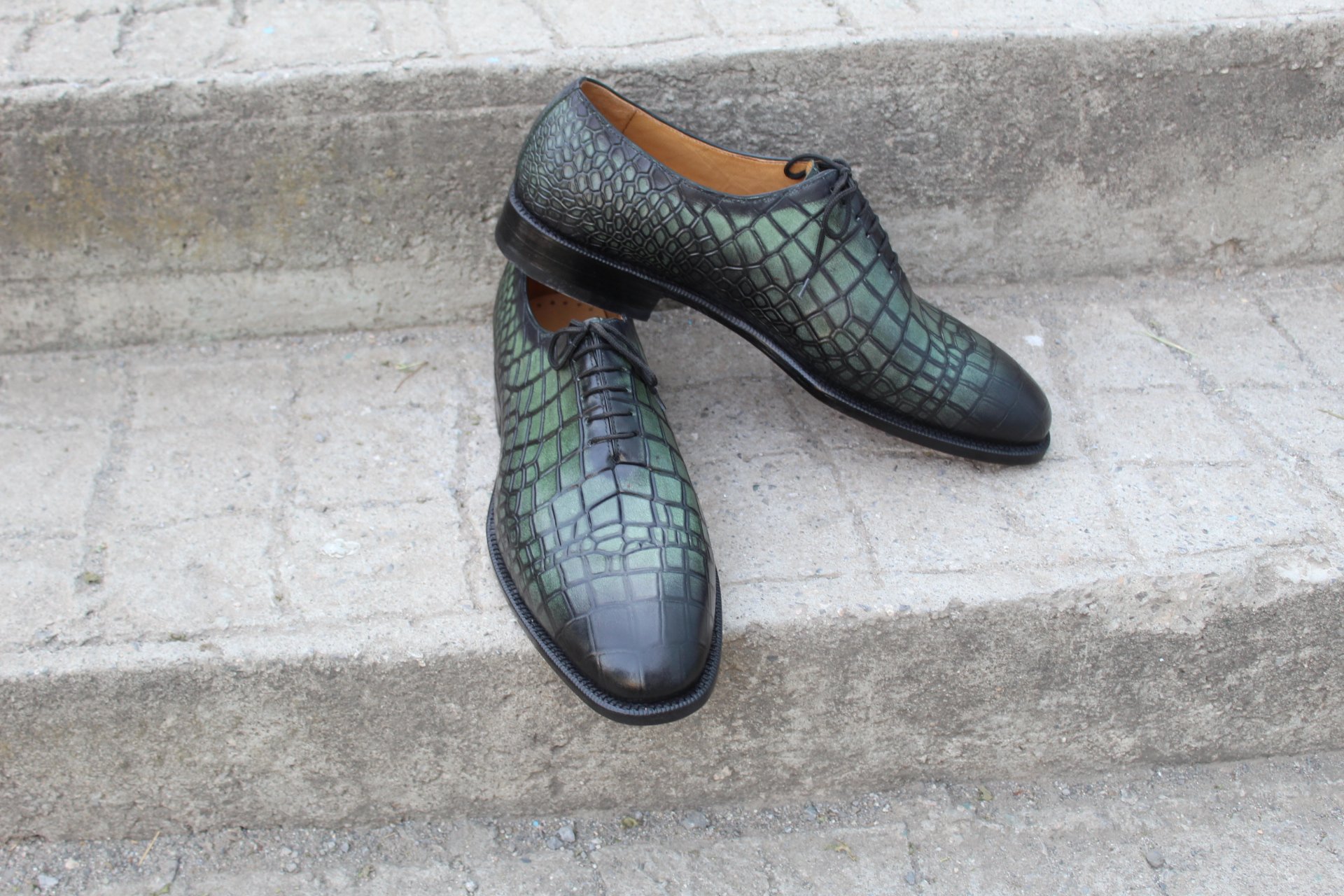 Crafted Leather Black Green Classic Crocodile/Alligator Oxford Dress Shoes