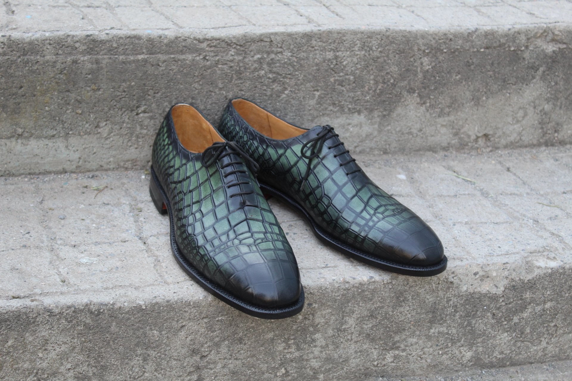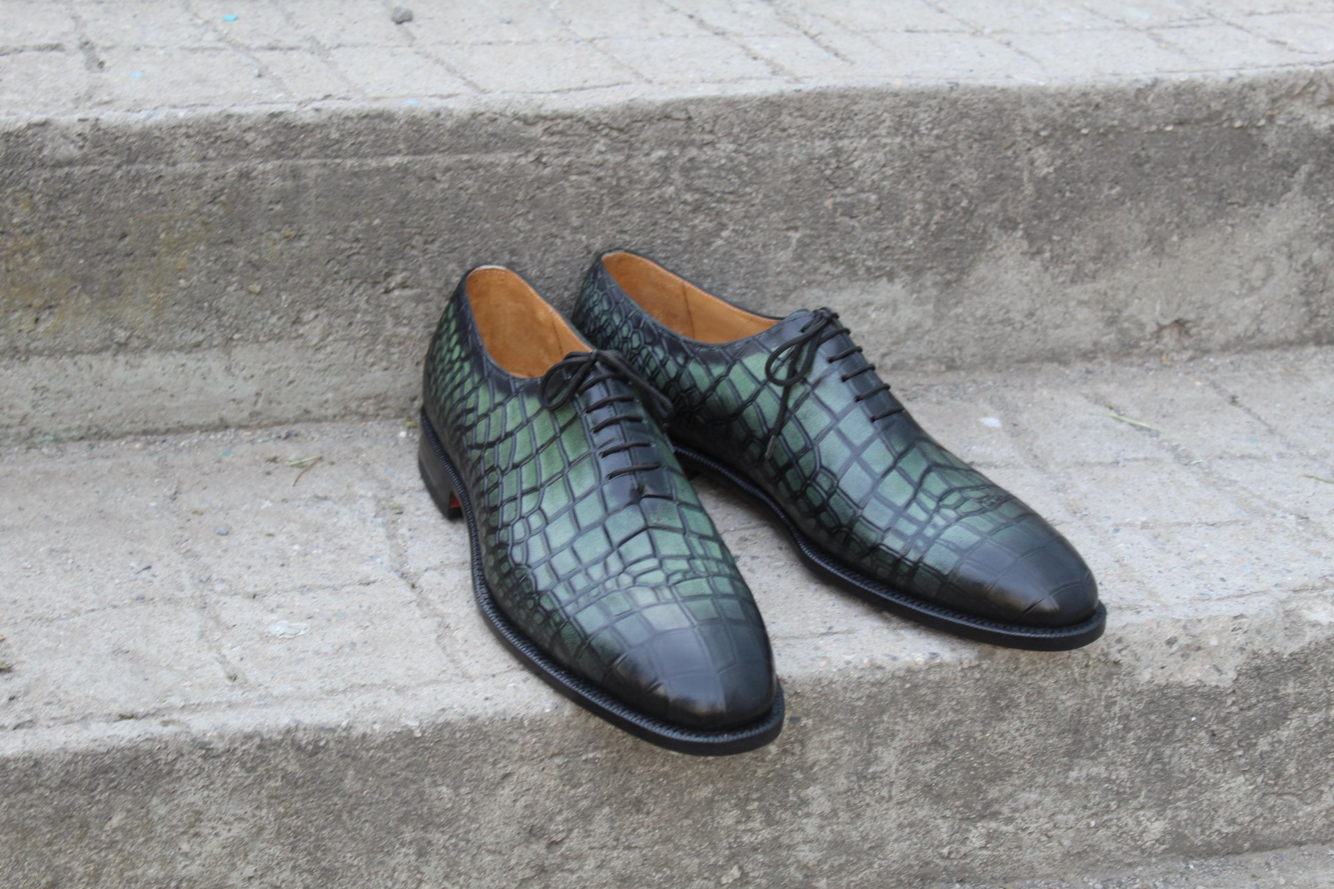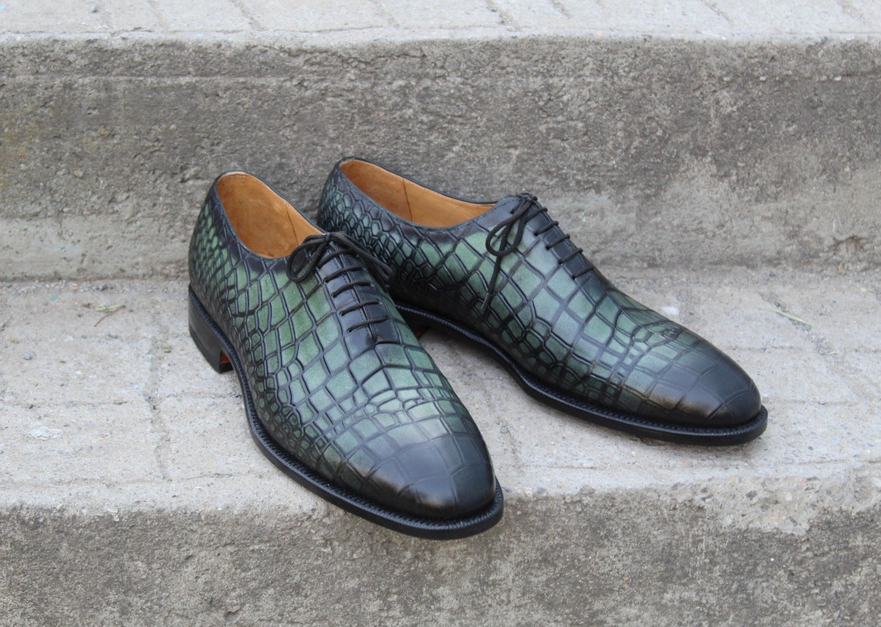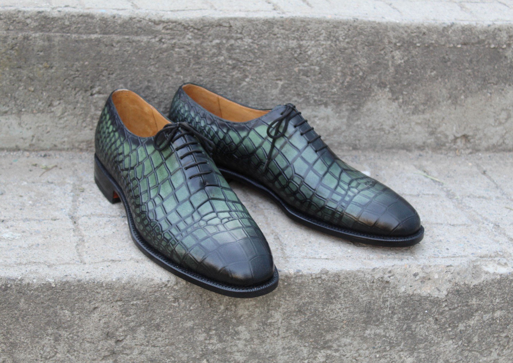 Crafted Leather Green Black Crocodile/Alligator Oxford Lace up Dress Shoes