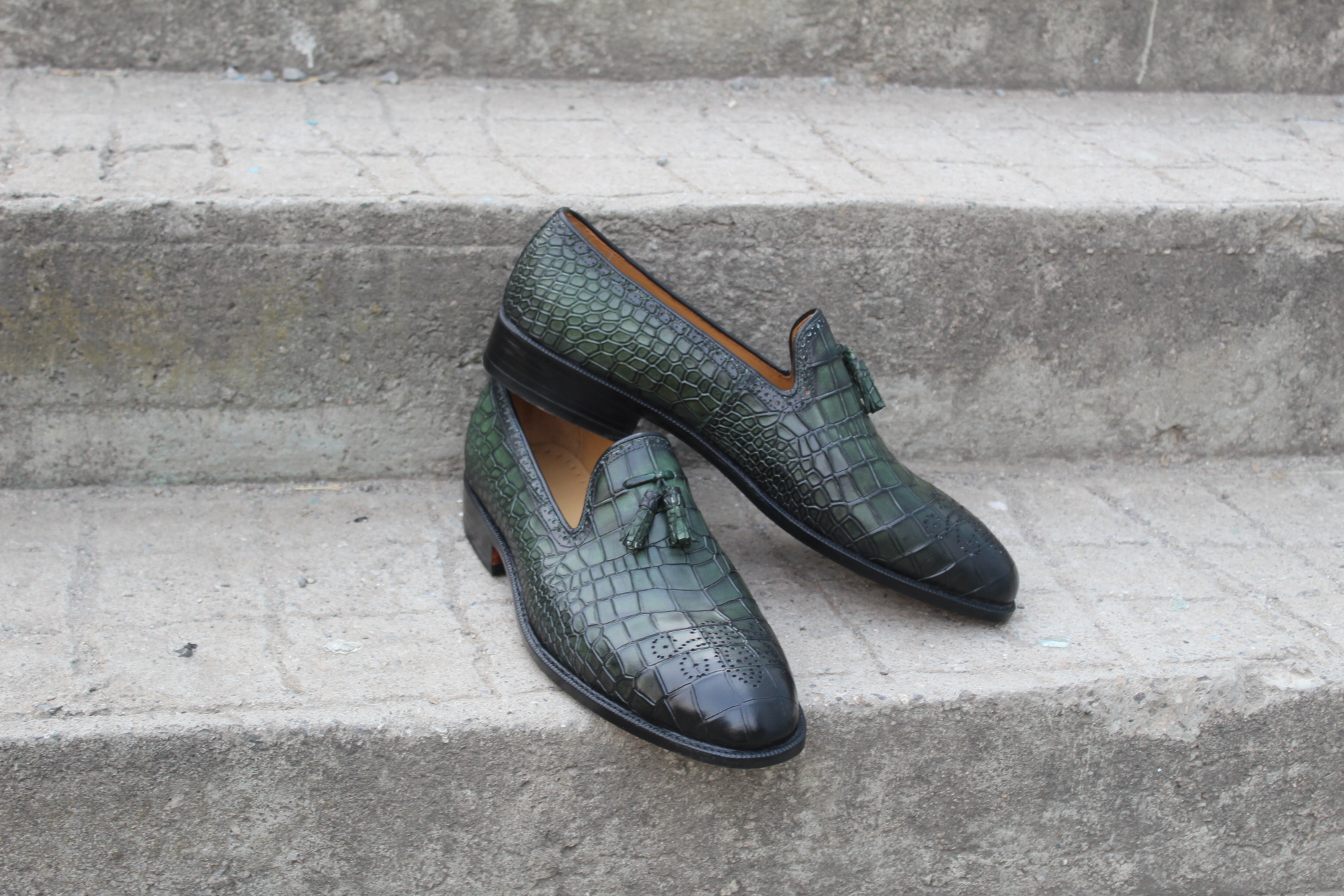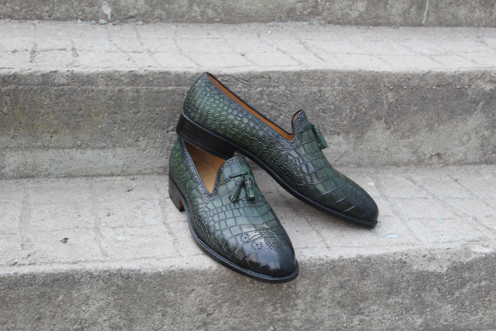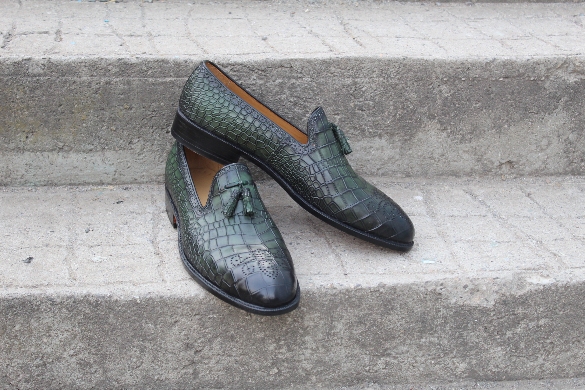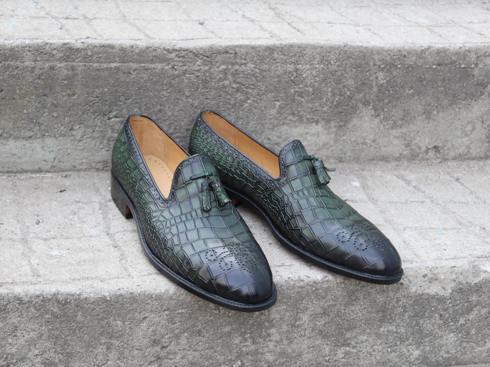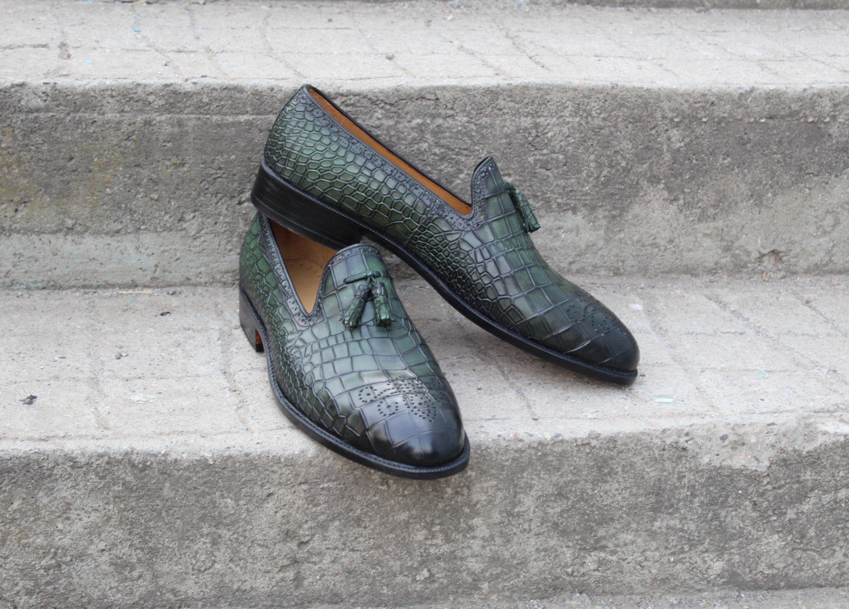 Crafted Leather Classic Men Green Crocodile/Alligator Tassel Loafers Dress Shoes