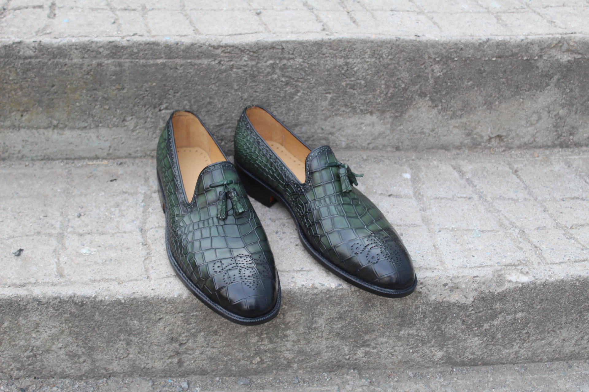 Inner: Soft Leather Sole: Leather Gender : Male Heel: Leather Color: Green Style: Tassel Loafers Shoes Lining Soft Calf Leather Lining Totally Hand stitched Manufacturing time 7-10 business days If you can’t find your Size/Colorjust send us message we will make for you.