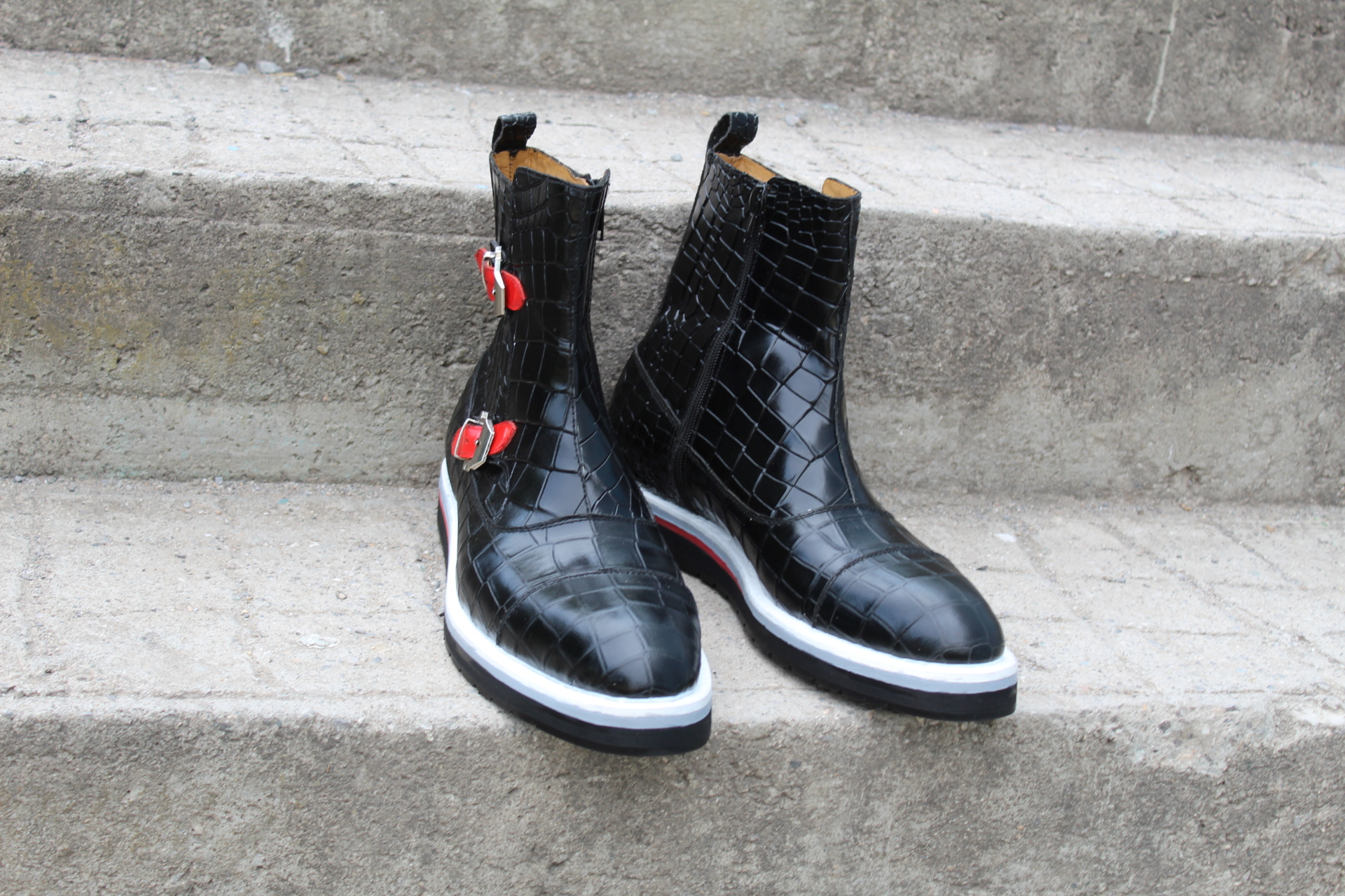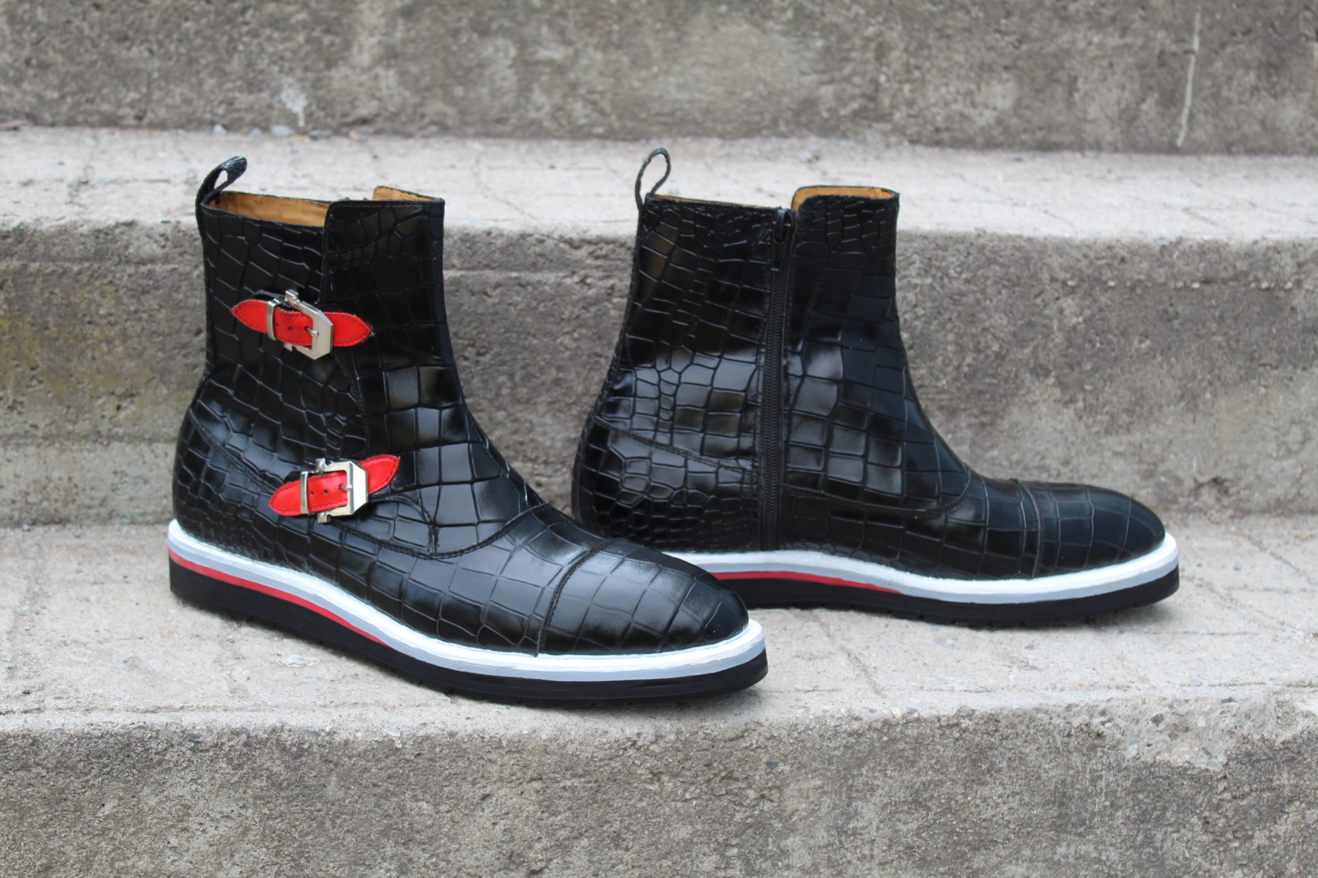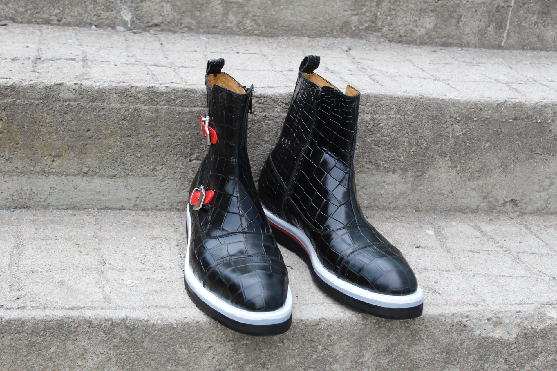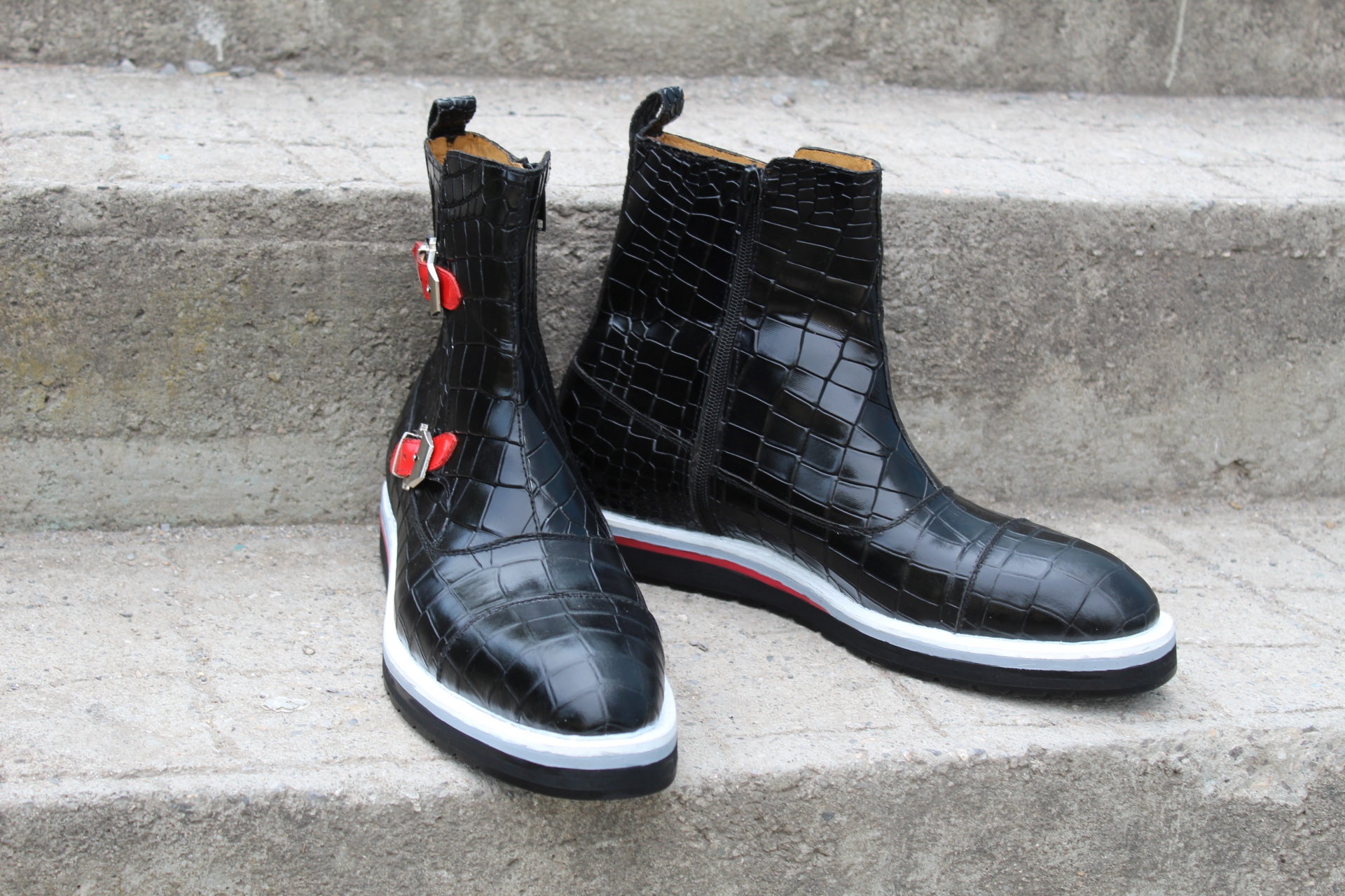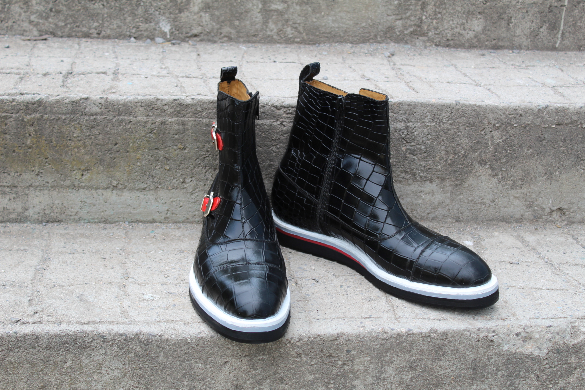 Crafted Leather Bespoke Dress Shoes Tri Rubber Sole Black Crocodile/Alligator Leather Side Zipper Ankle Boot