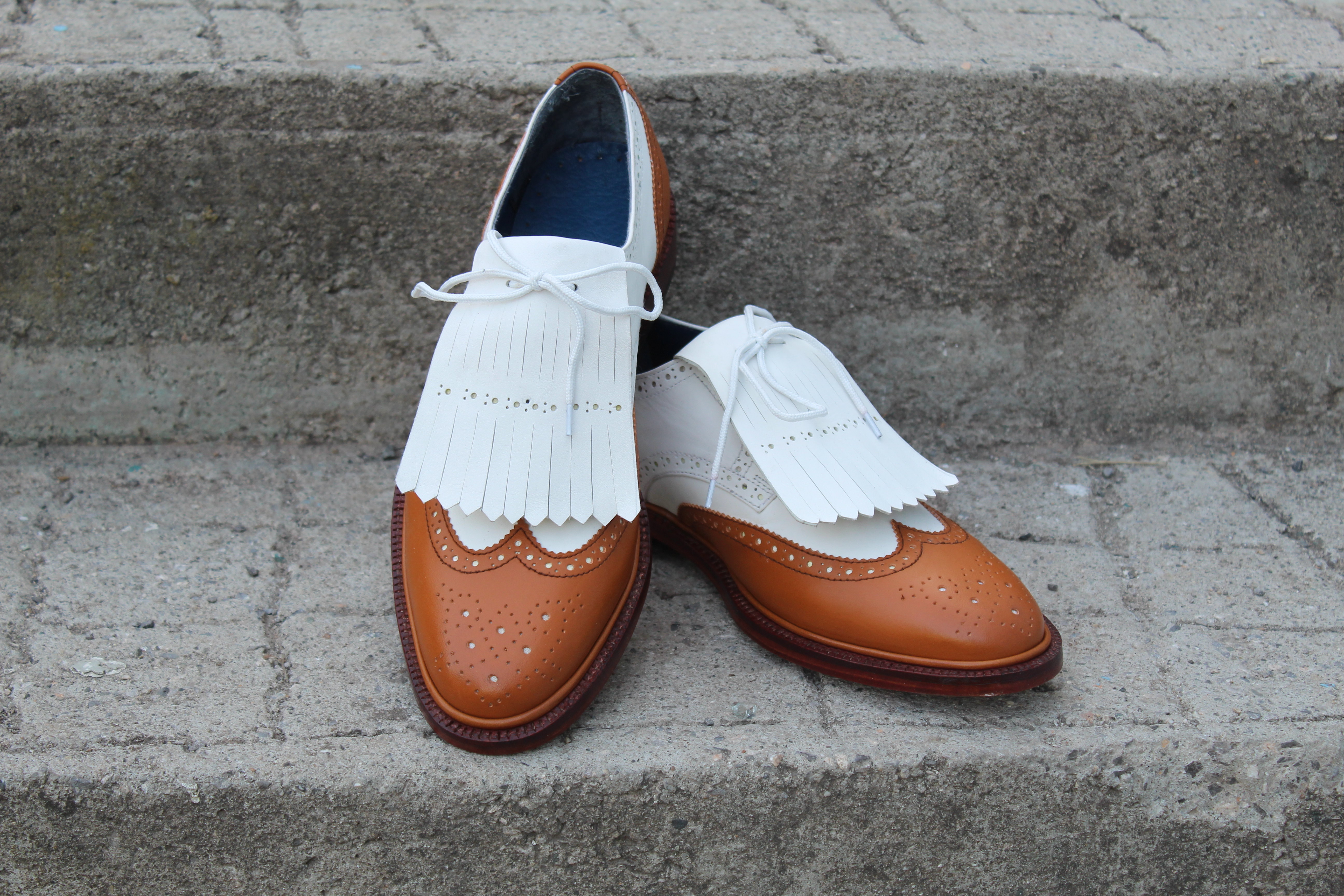 Crafted Leather Classic Brown/White Leather Tassel Loafers Style Wingtip Fringes Dress Shoes