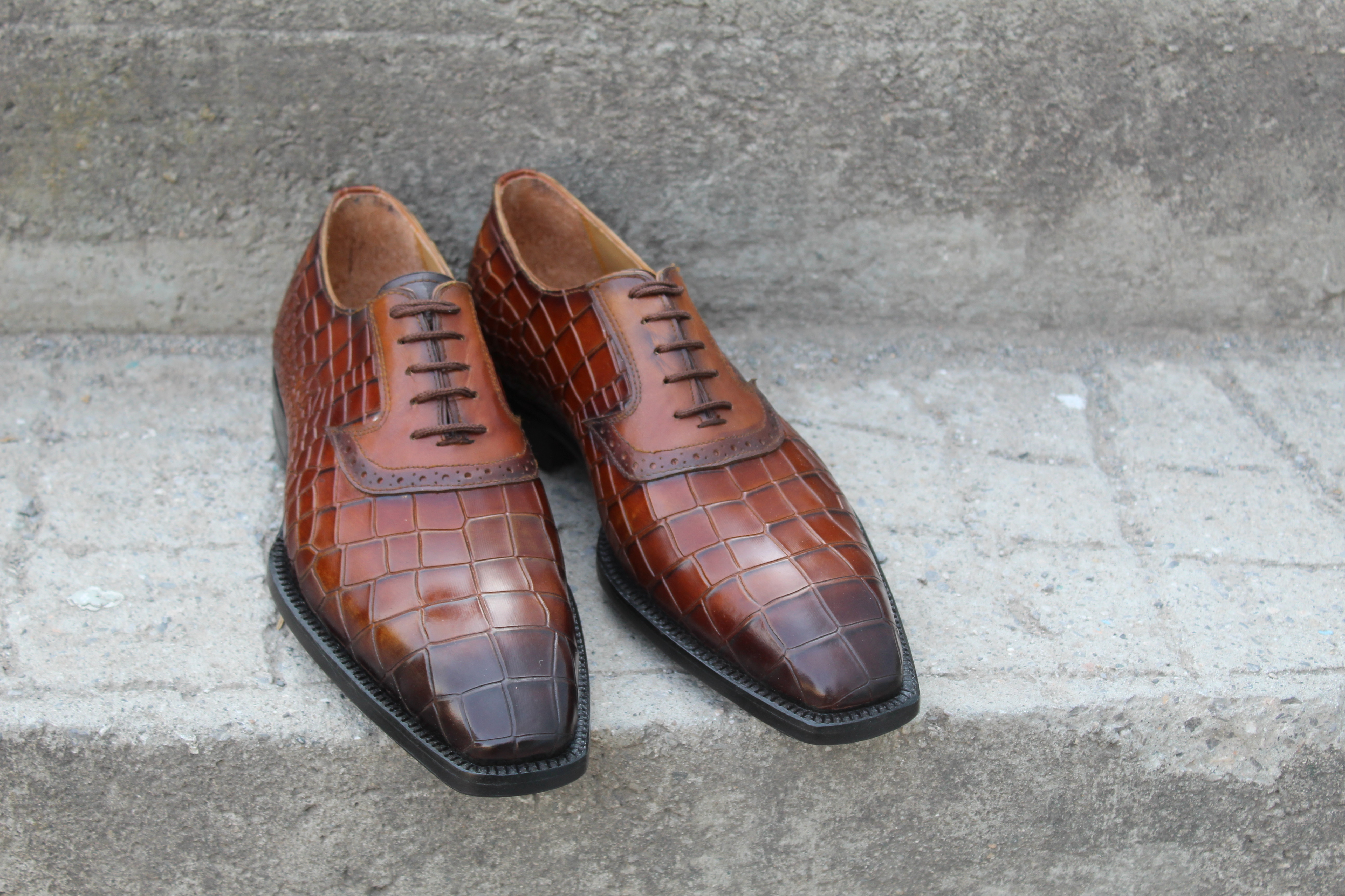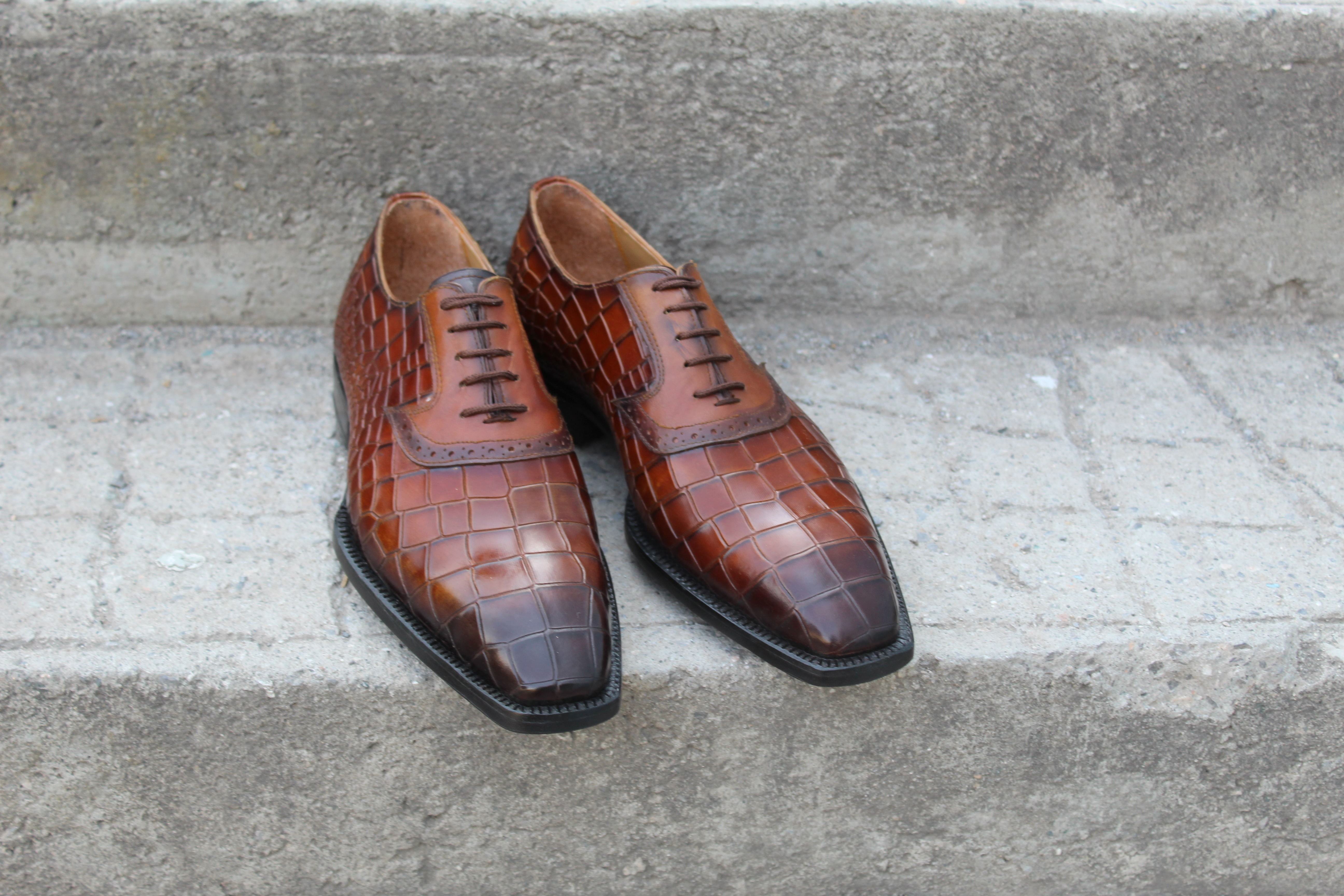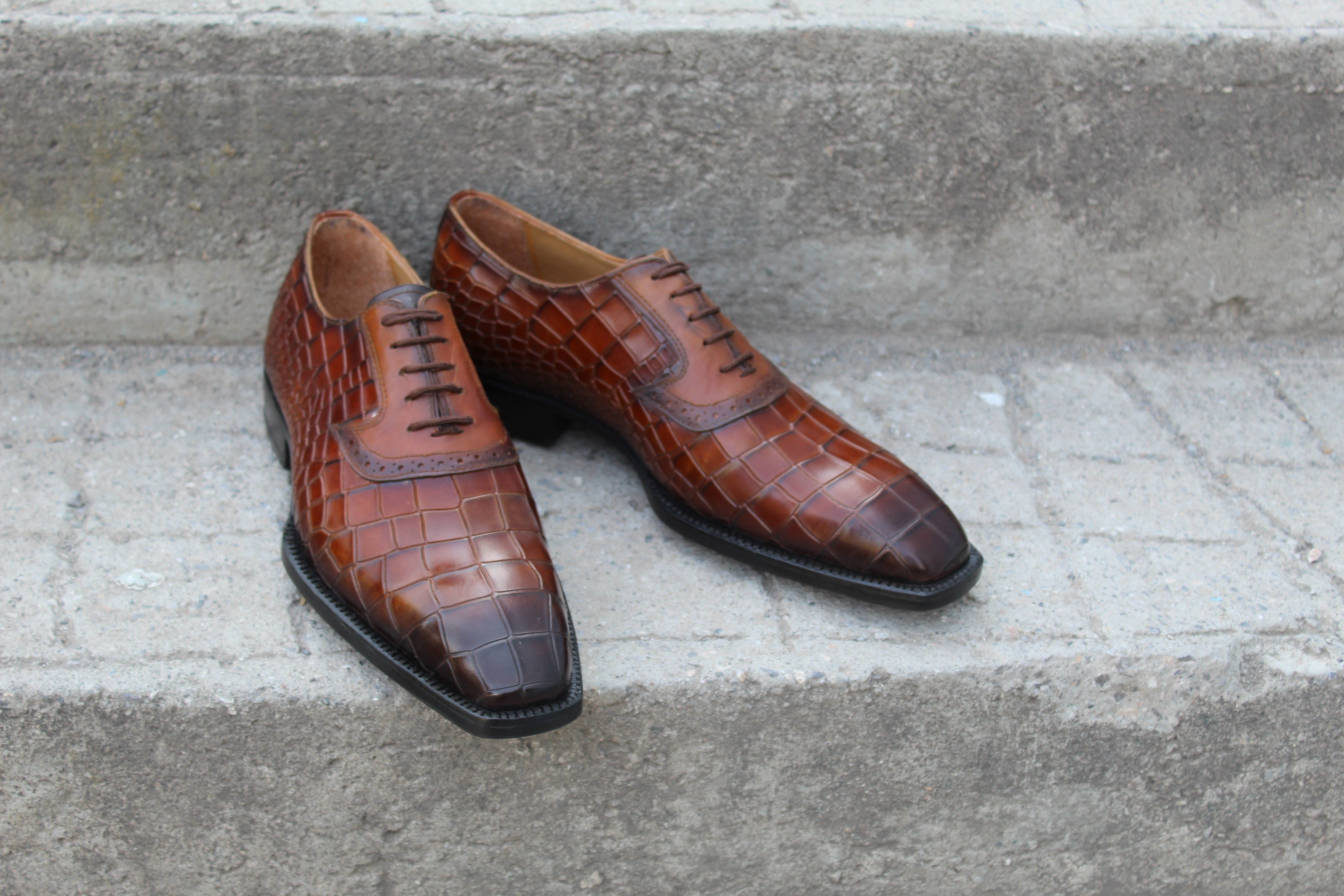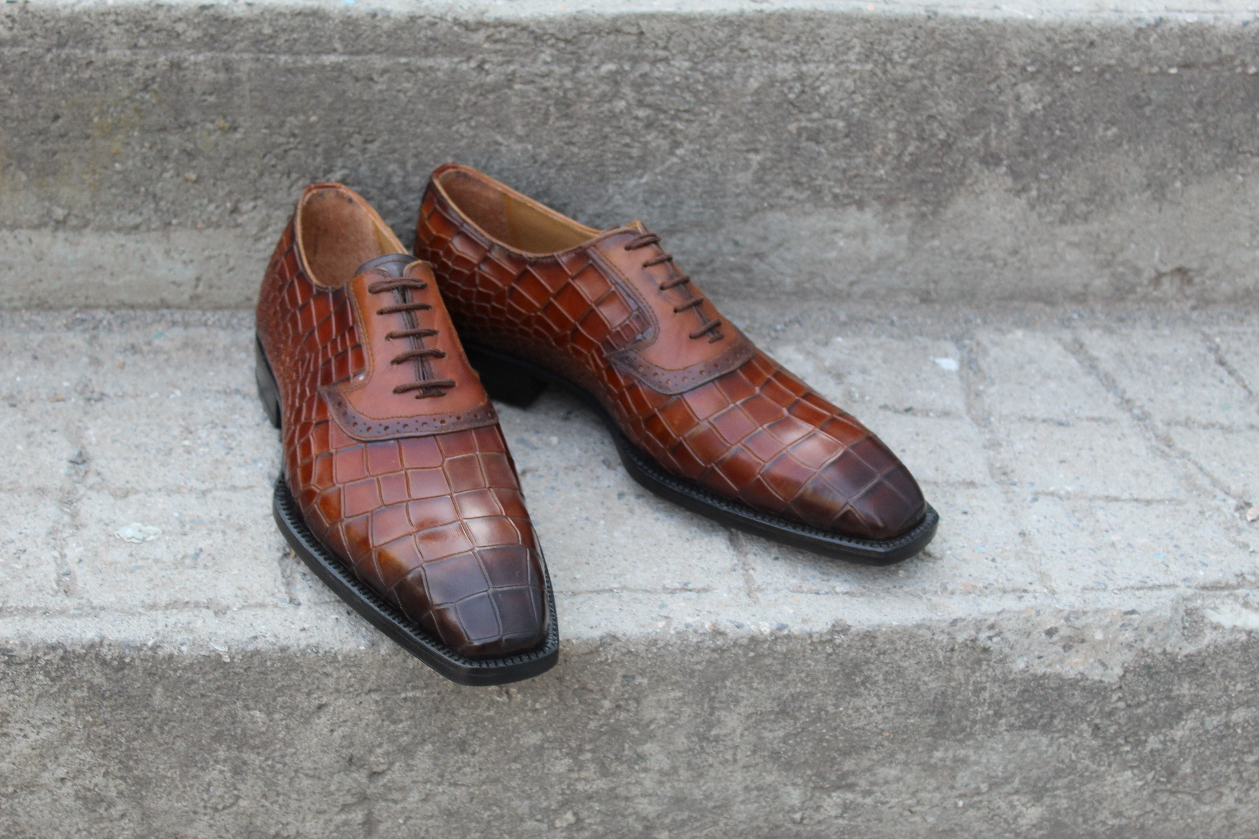 Crafted Leather Classic and Luxury Brown Patina Leather Crocodile/Alligator Dress Shoes
