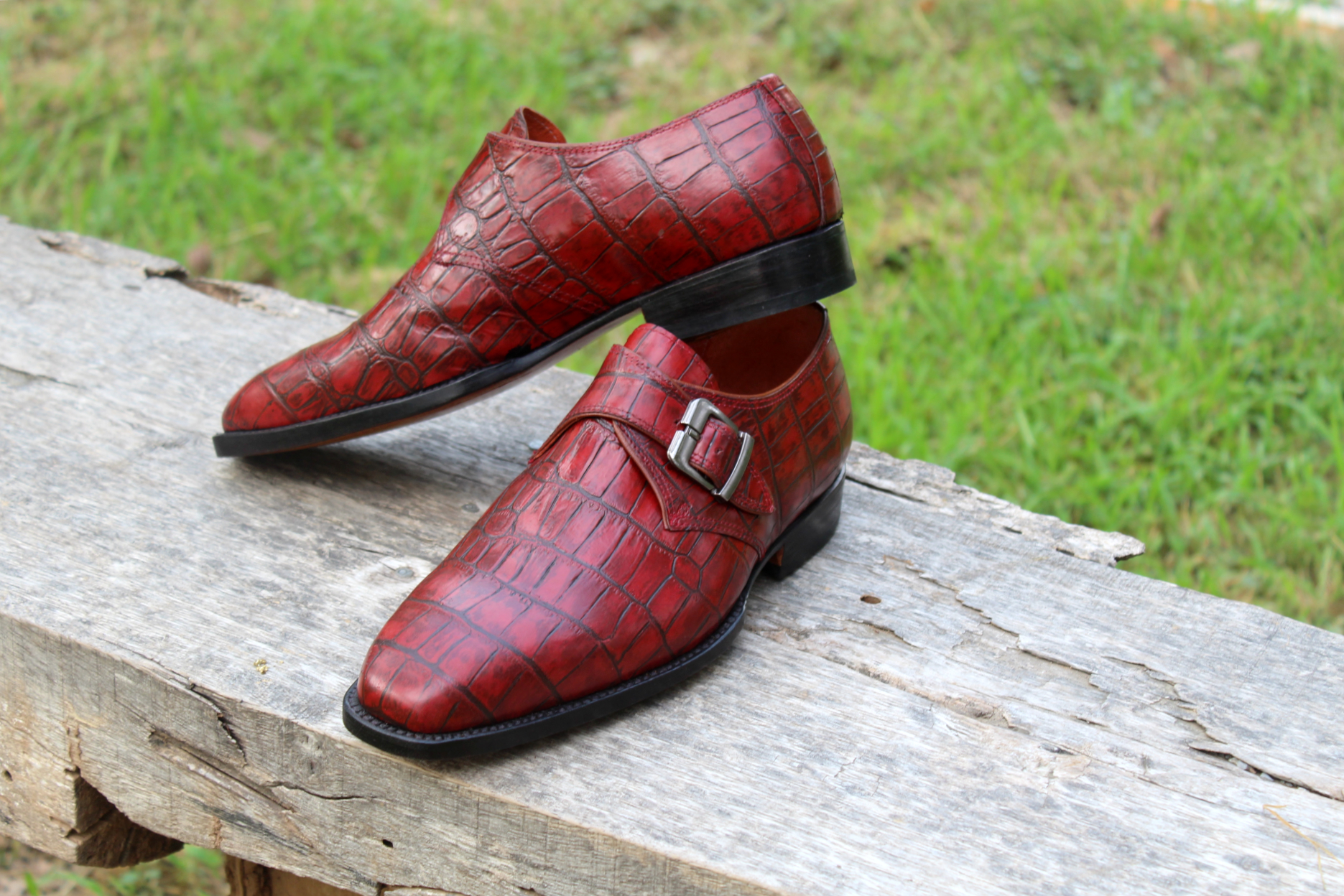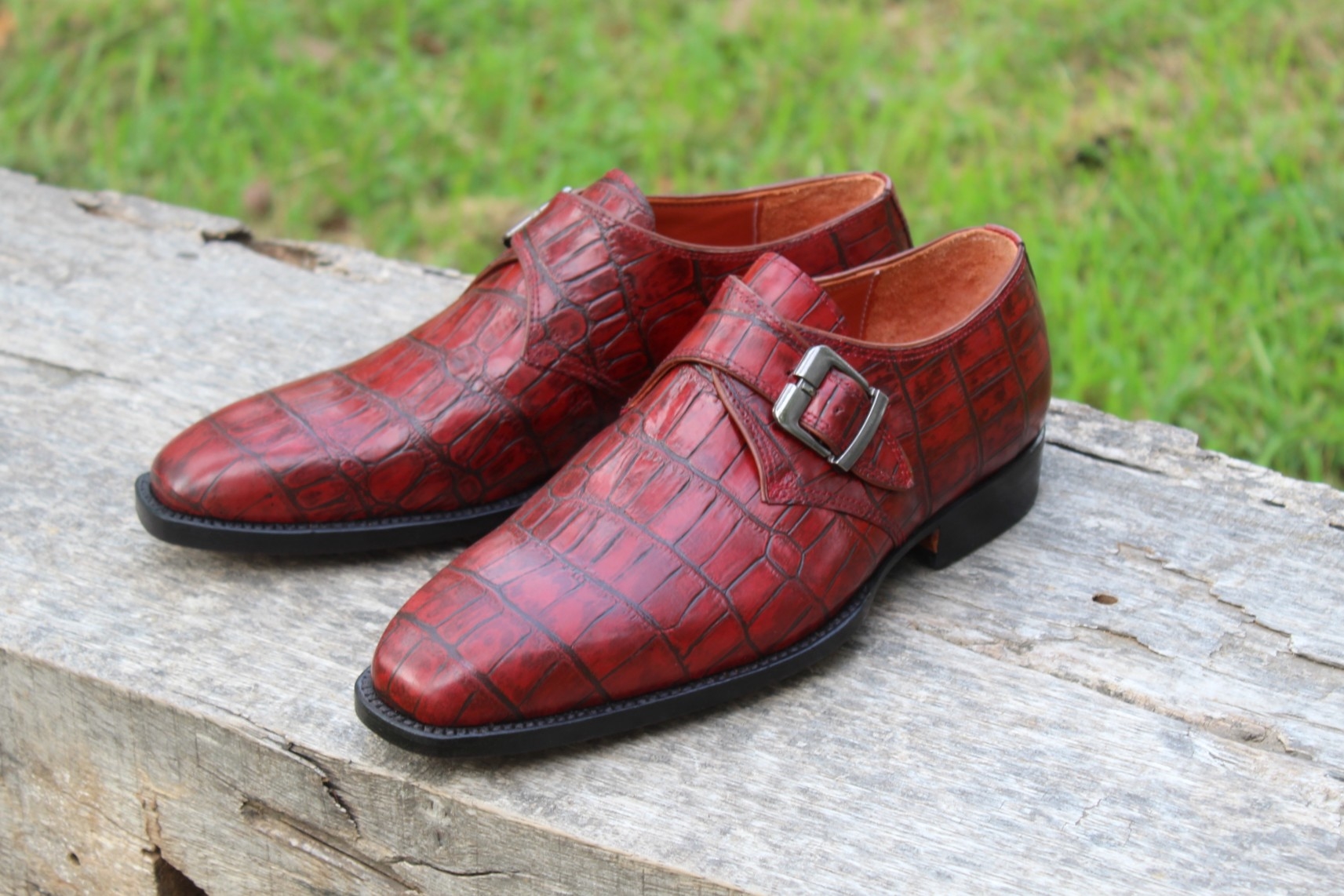 Crafted Leather Classic Red Crocodile/Alligator Monk Strap Dress Shoes