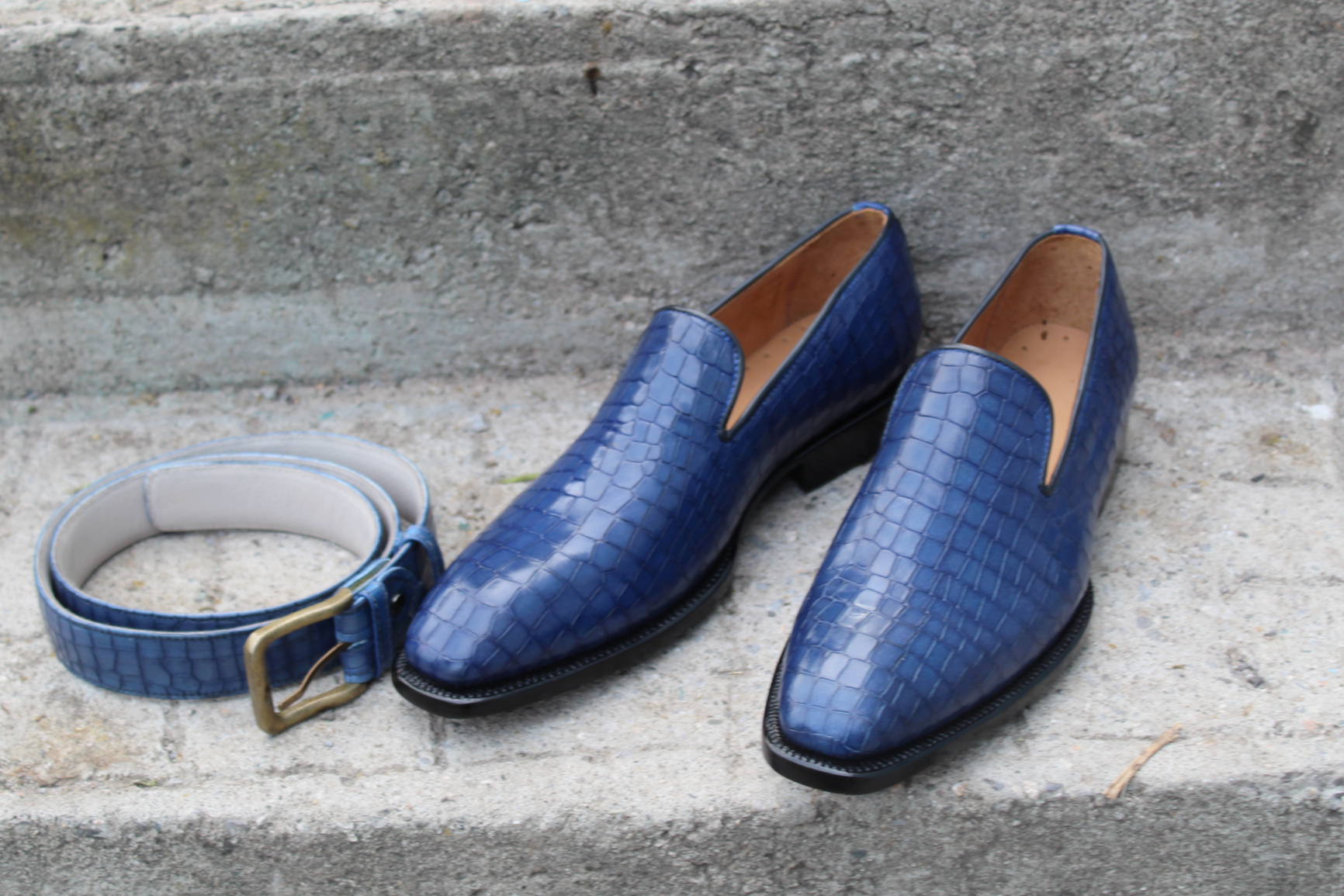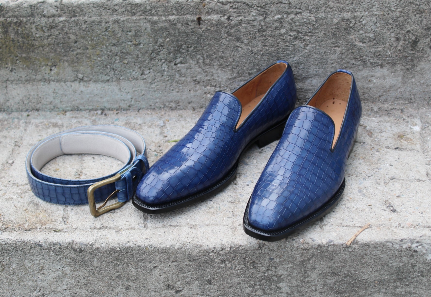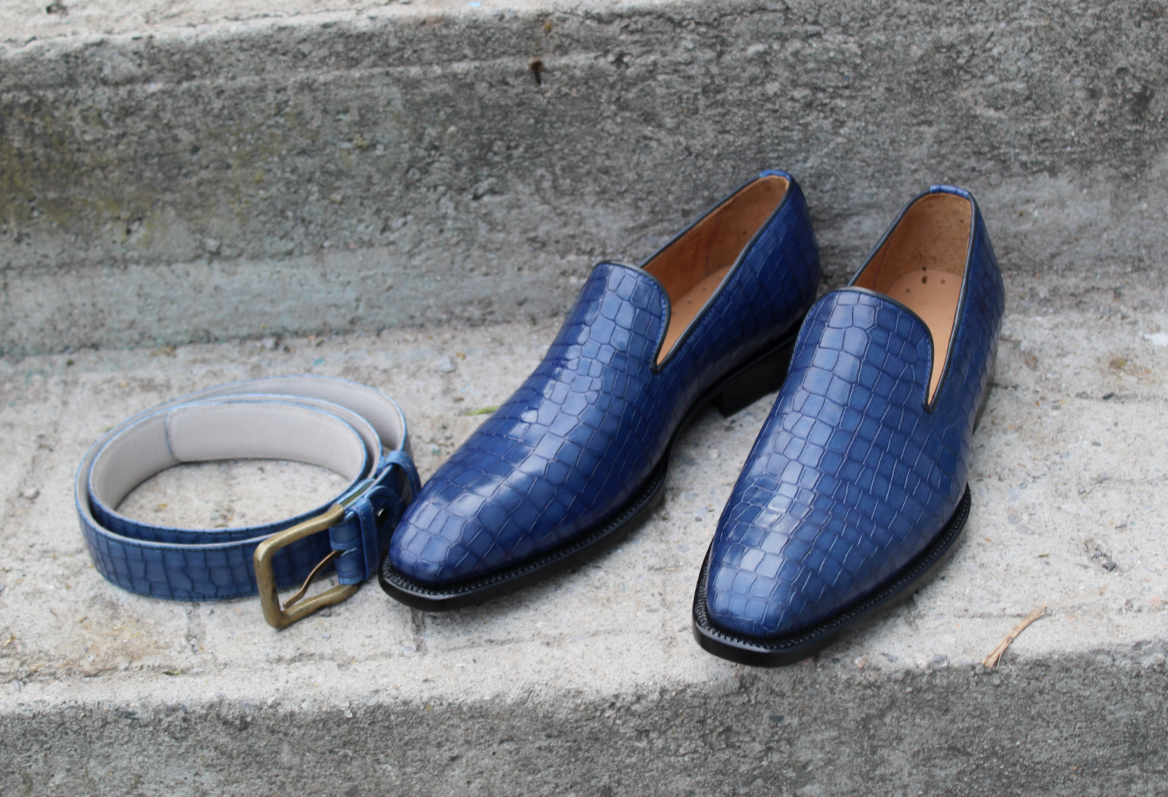 Crafted Leather Elegant and Classic Blue Crocodile Leather Alligator Loafers Dress Shoes with Matching Belt