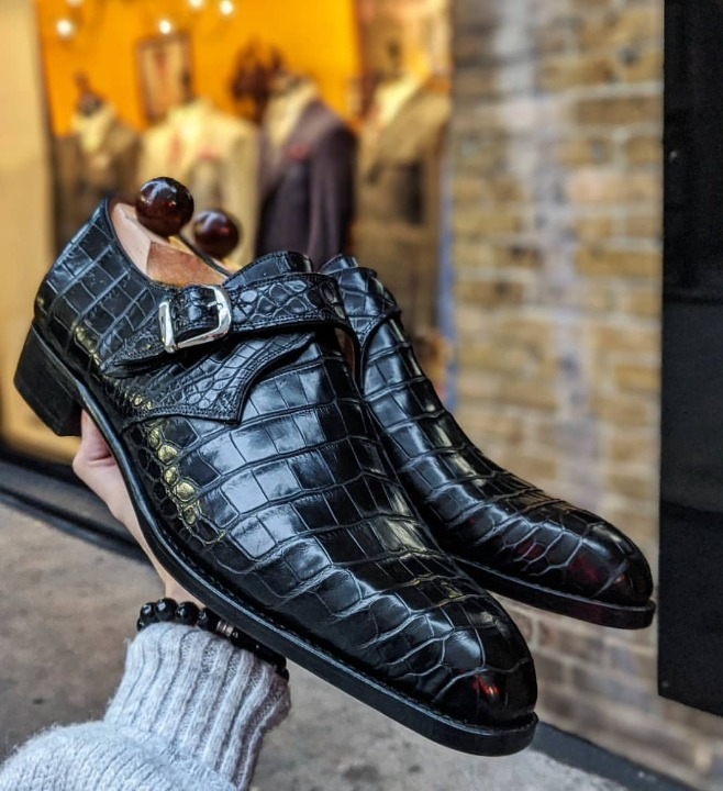 Handmade Men Black Crocodile/Alligator Leather Monk Strap Dress Shoes