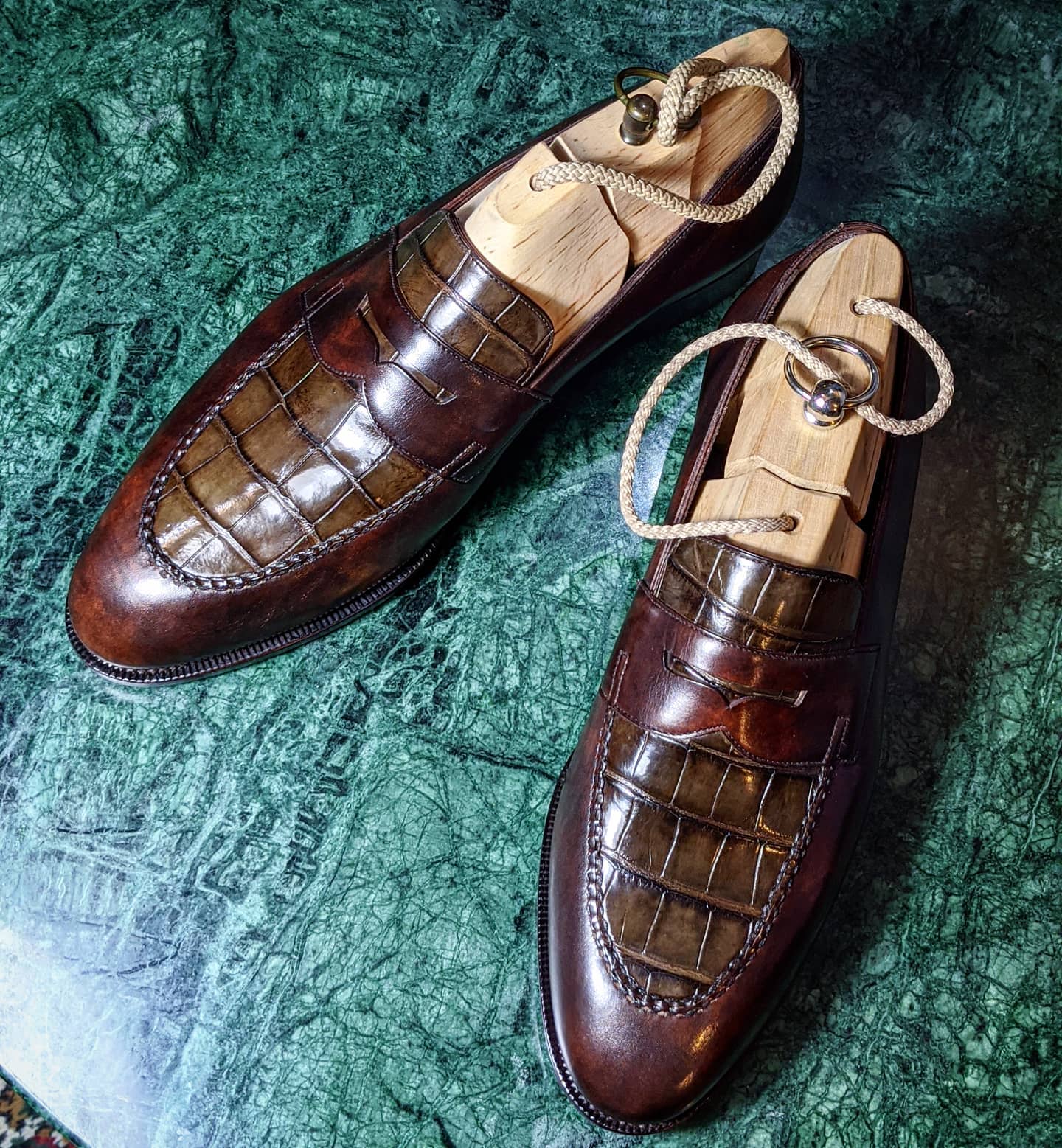 Handmade Men Brown Crocodile Leather Loafers Dress Shoes