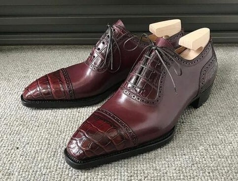 Handmade Men Burgundy Calf Crocodile Leather Lace up Dress Shoes
