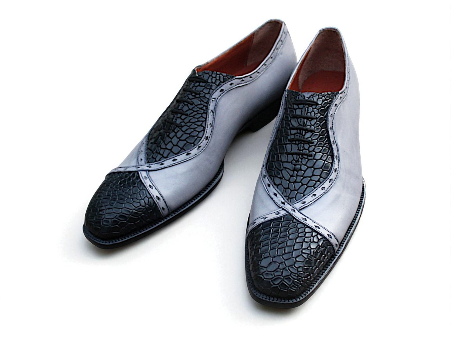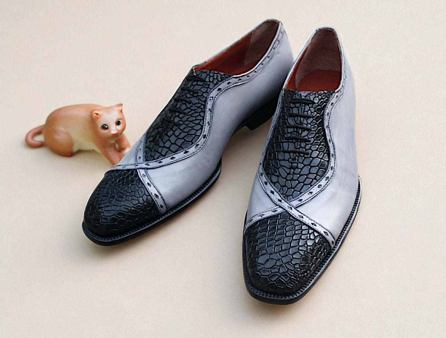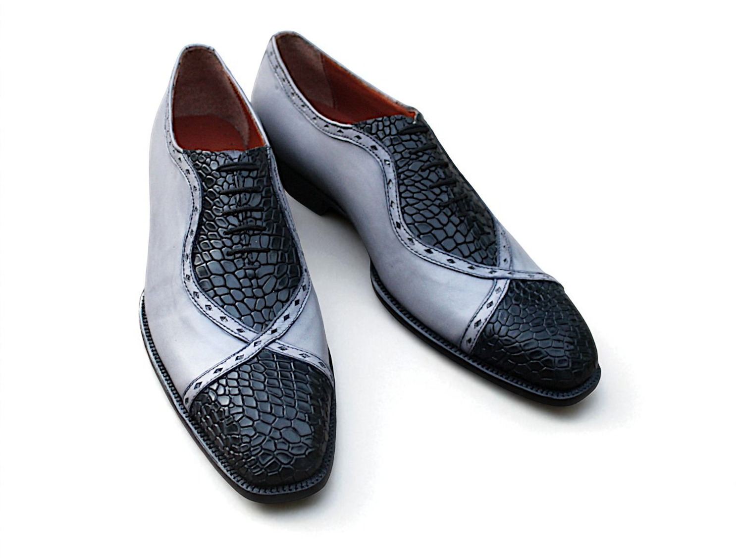 Crafted Leather Classic Gray Calf Black Crocodile Leather Lace up Dress Shoes