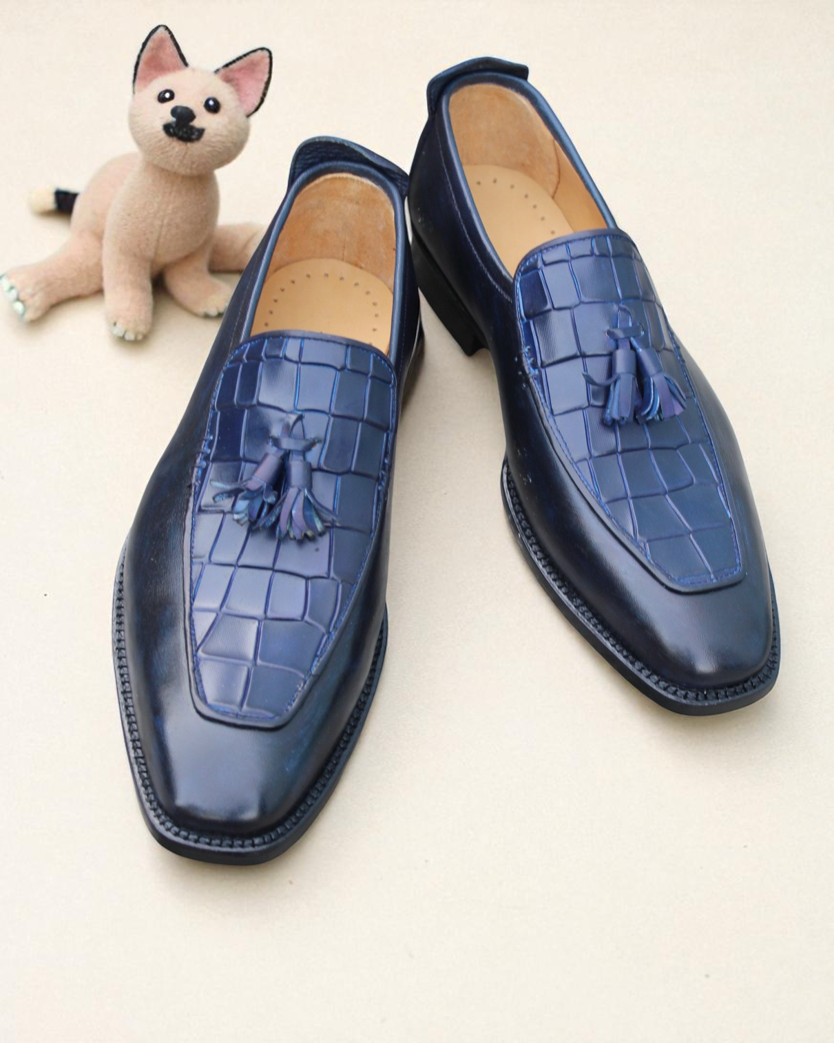 Inner: Soft Leather Sole: Leather Gender : Male Heel: Leather Color: Blue Style: Tassel Loafers Shoes Totally Hand stitched Manufacturing time 7-10 business days If you can’t find your Size/Color just send us message we will make for you.