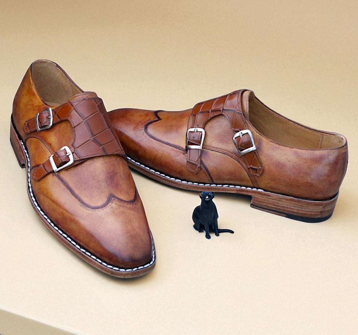 Crafted Leather Handmade Brown Leather Crocodile Alligator Monk Strap Wingtip Dress Shoes