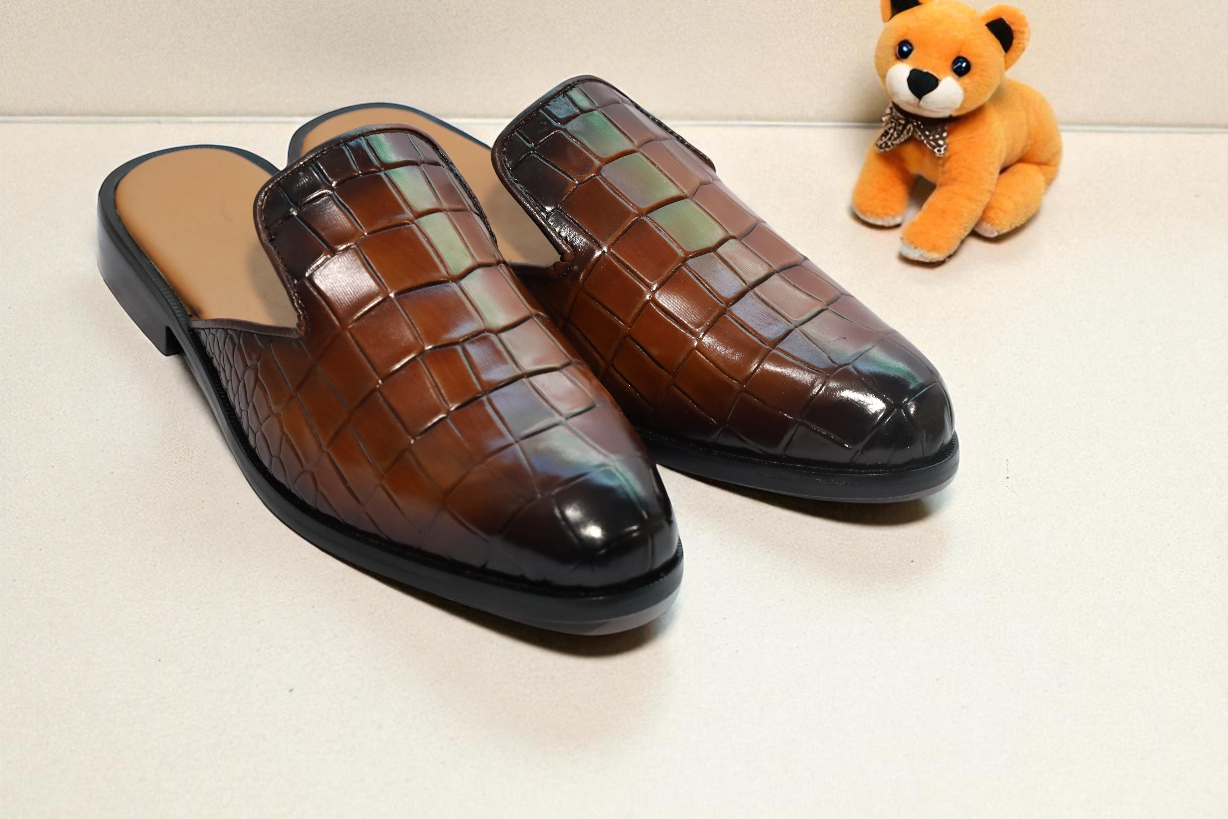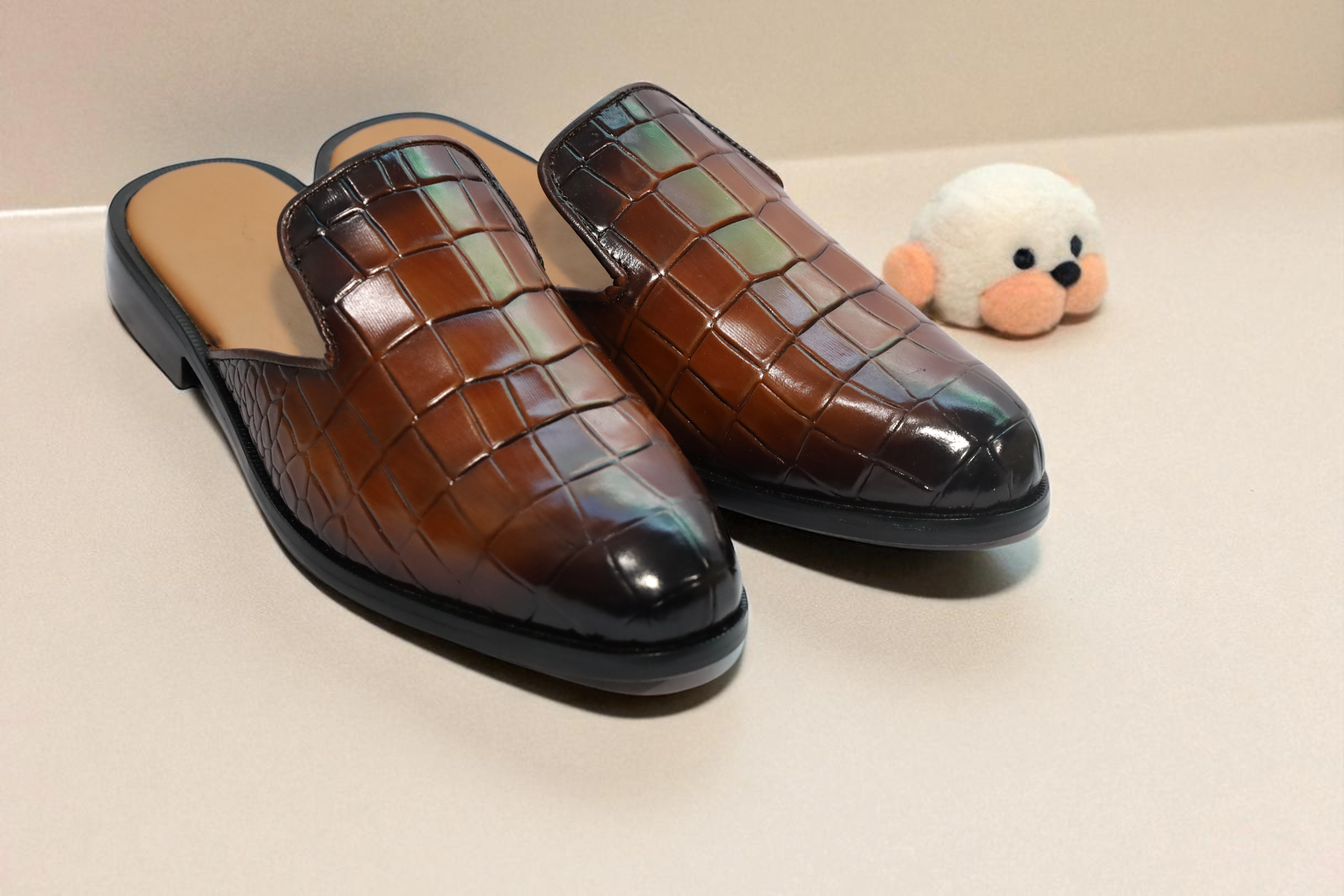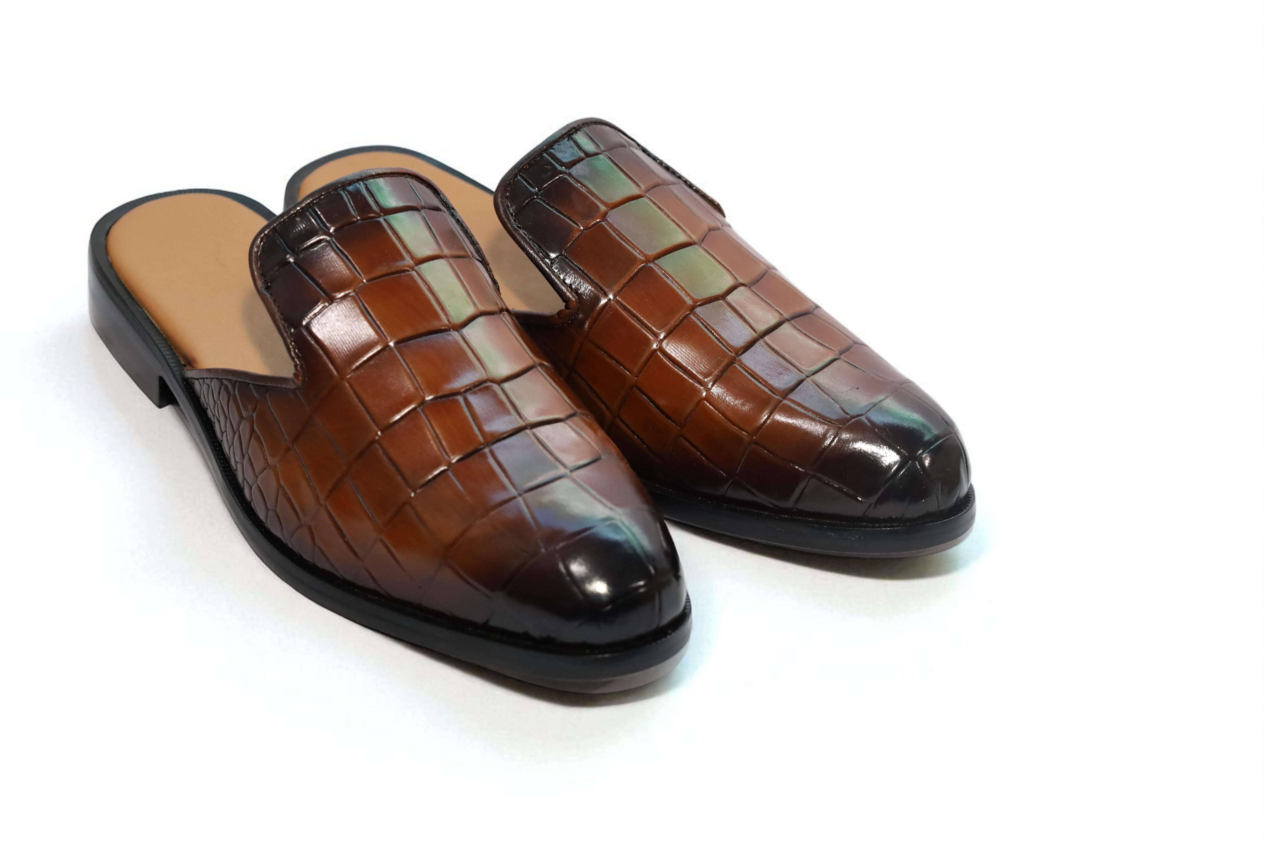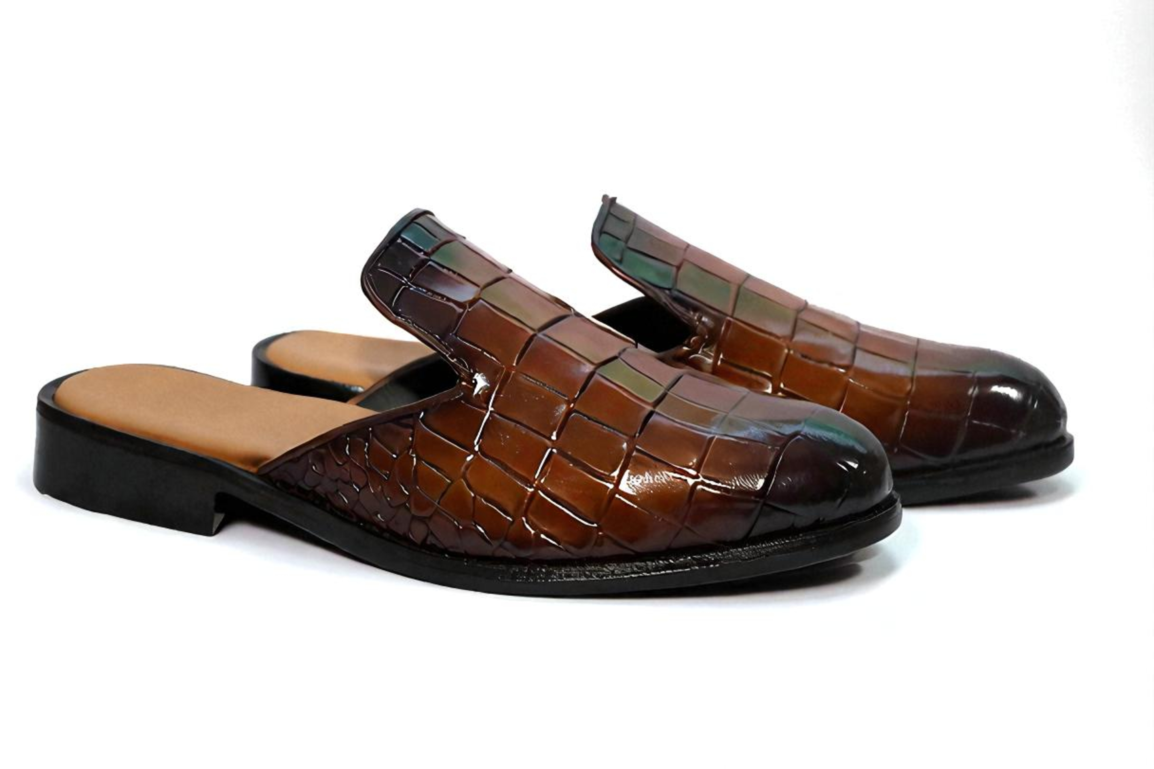 Crafted Leather Classic Brown Crocodile/Alligator Leather Mules Dress Shoes