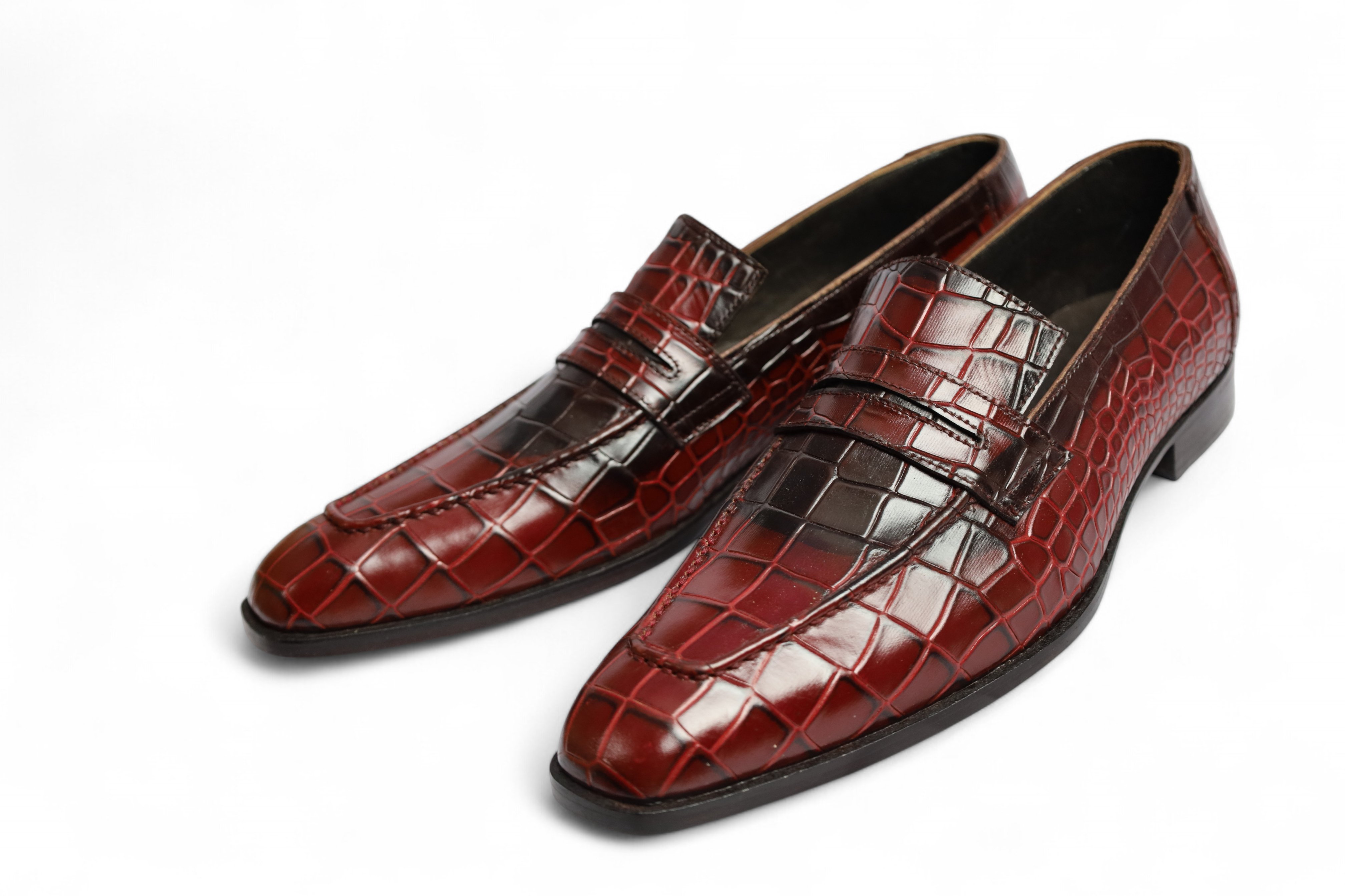 Crafted Leather Handmade Men Burgundy Black Crocodile Leather Moccasin Loafers Dress Shoes