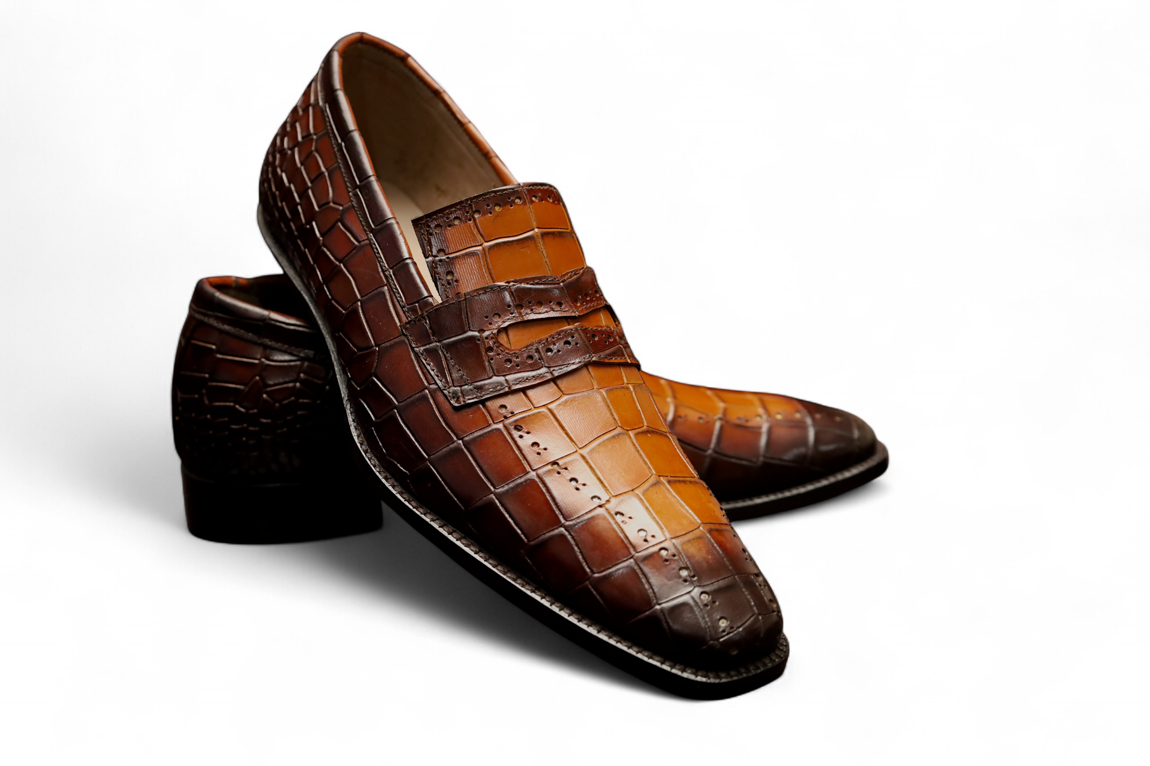 Crafted Leather Handmade Men Brown Crocodile Leather Loafers Dress Shoes with Matching Belt