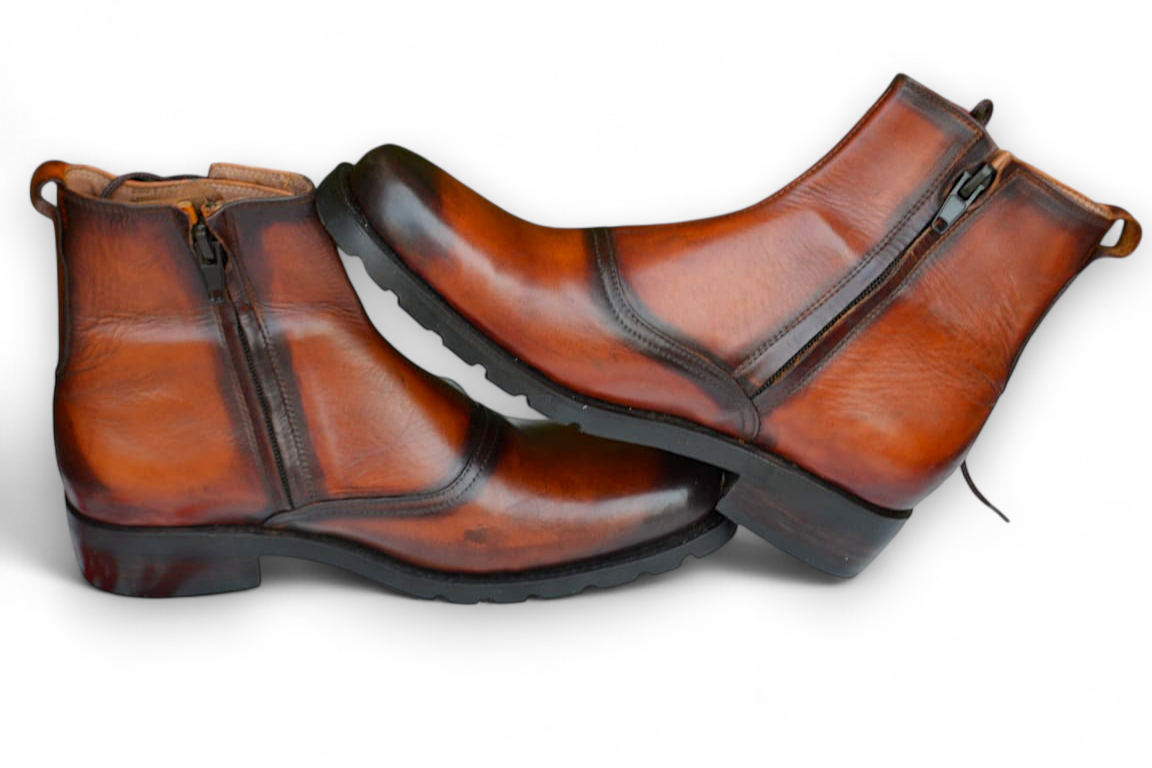 Crafted Leather Classic Men Handmade Two Tone Brown Leather Ankle High Zigzag Style Side Zipper Boot