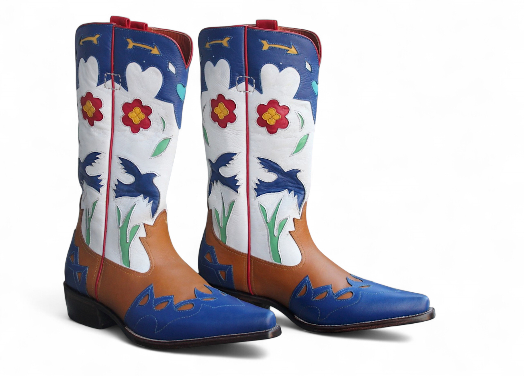 Inner: Soft Leather Sole: Leather Gender : Male Heel: Leather Color: Brown / White / Blue Style: Cowboy Boot Lining Soft Calf Leather Lining Totally Hand stitched Manufacturing time 7-10 business days If you can’t find your Size/Colorjust send us message we will make for you.