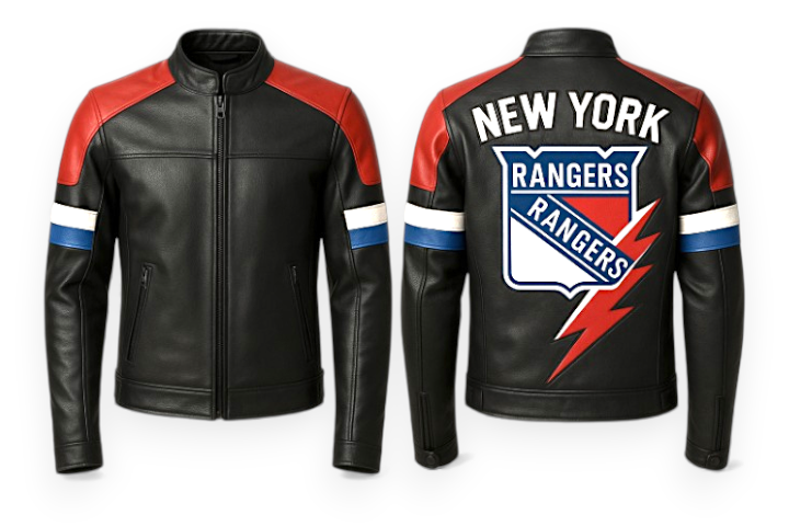 Crafted Leather Men’s Designer Black Red with Blue White Stripe Leather Jacket Motorcycle