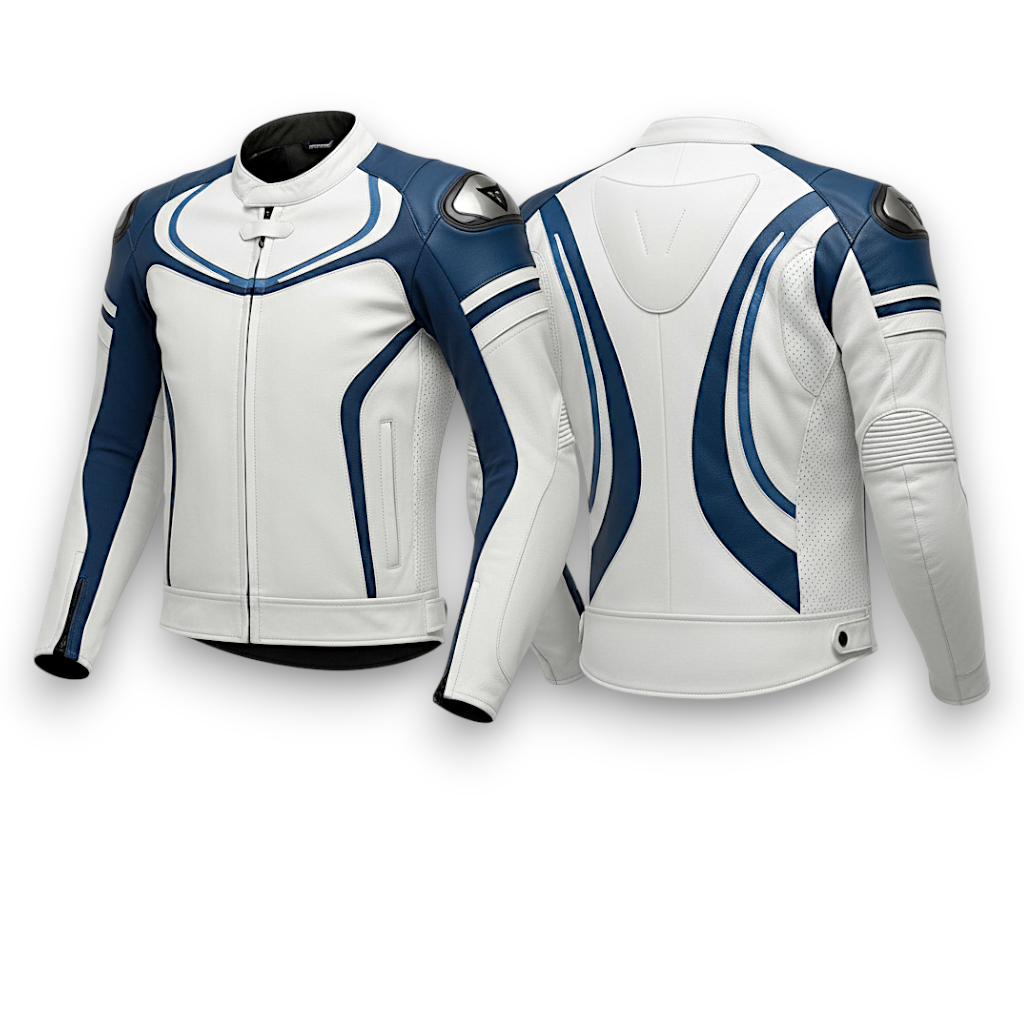 Crafted Leather Design Blue White Leather Racing Jacket Motorcycle