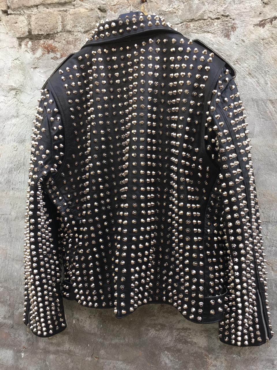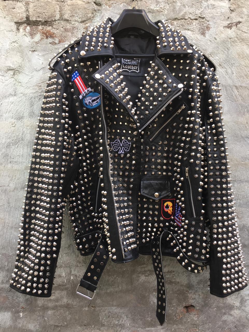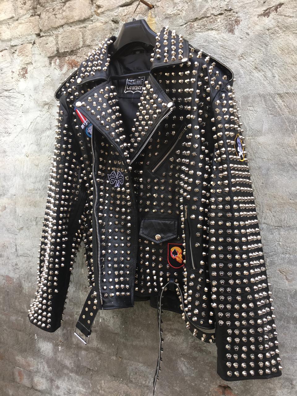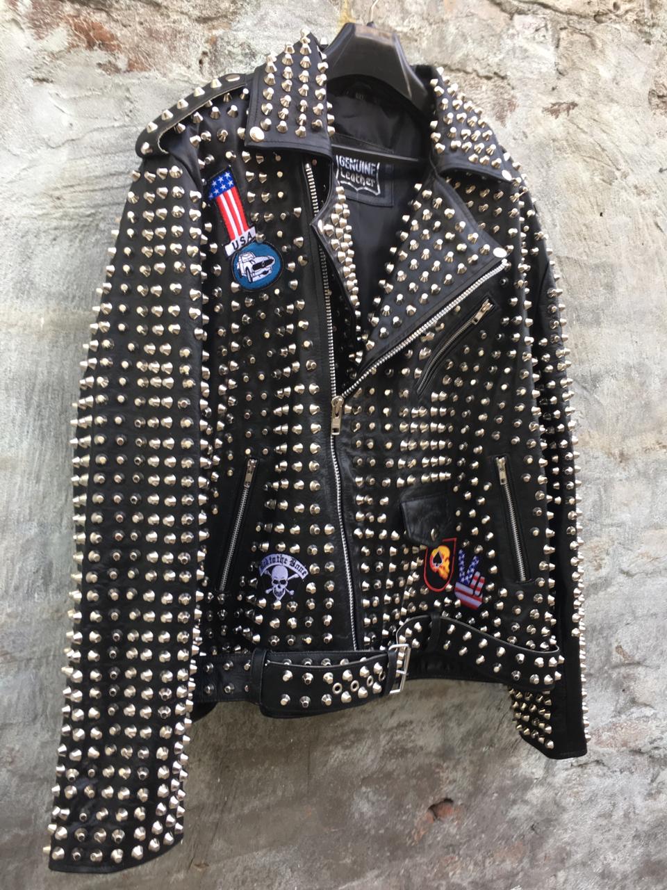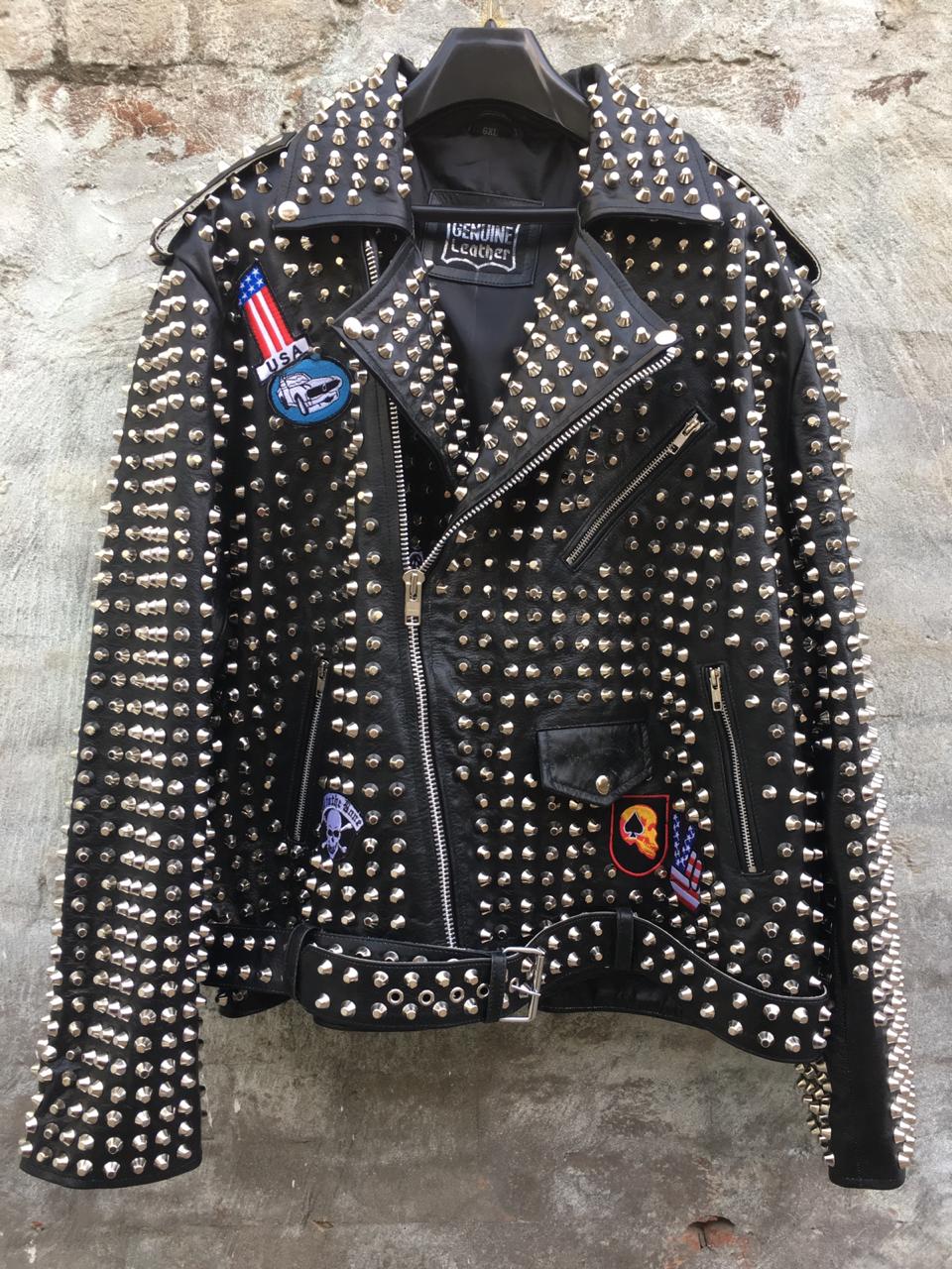New Mens Punk Rock Full Silver Studded Patches Black Leather Jacket