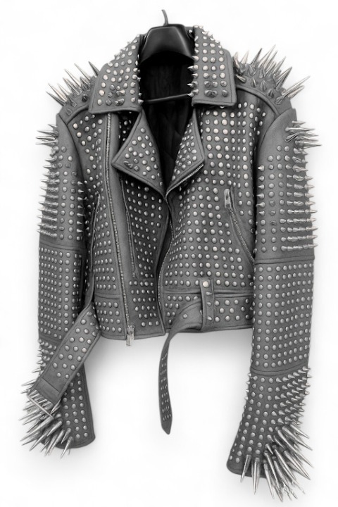 Crafted Leather New Classic Awesome Handmade Women's Gray Leather Studded Brando Metal Spiked Leather Round Studs Jacket