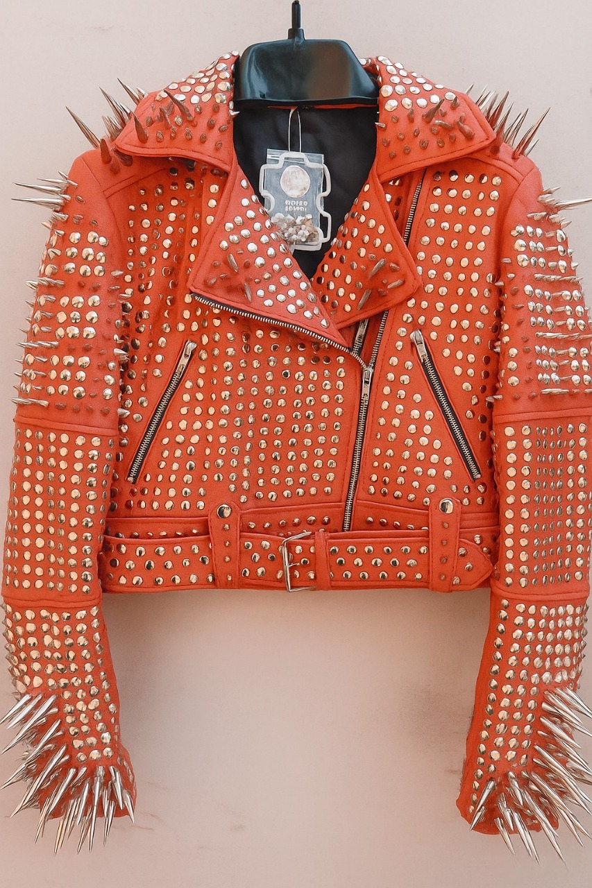 Crafted Leather Classy Women Orange Red Leather Studded Jacket with Silver Studs and Spikes