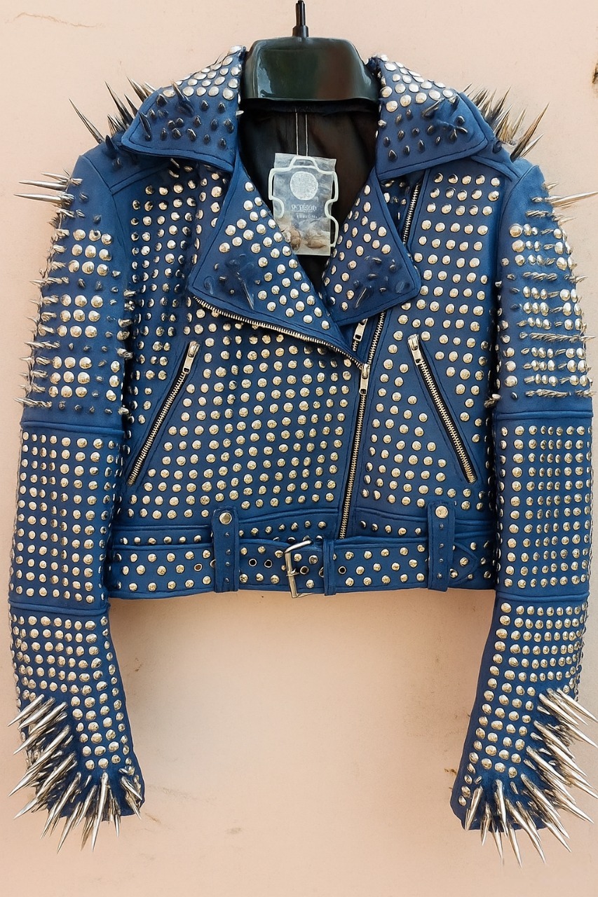 Crafted Leather Classy Women Inkstorm Blue Leather Studded Jacket with Silver Studs and Spikes