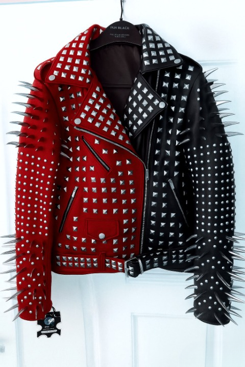 Crafted Leather New Handmade Women's Punk Full Long Spiked Studded Brando Red Black Adorable Leather Jacket