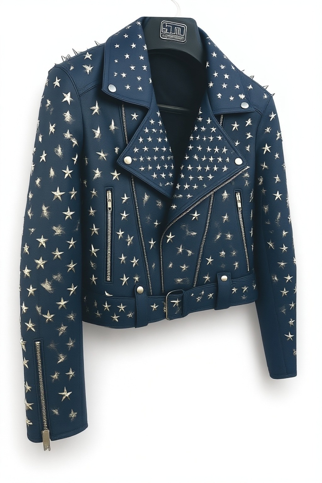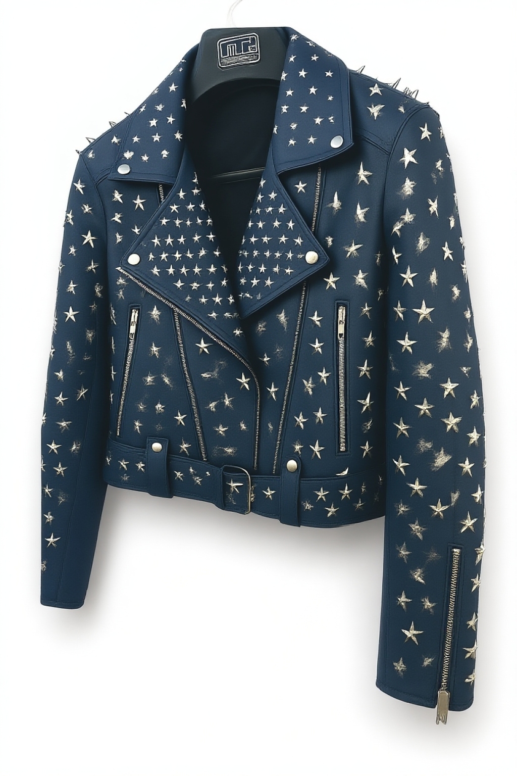 Crafted Leather Women Studded Blue Leather Jacket Silver Star Punk Brando Style