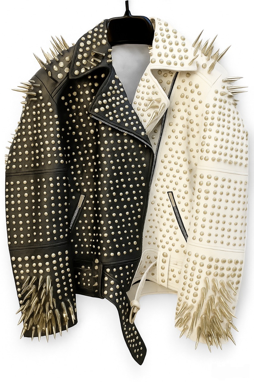 Crafted Leather Black White Punk Silver Spiked Studded Leather Brando Style Jacket