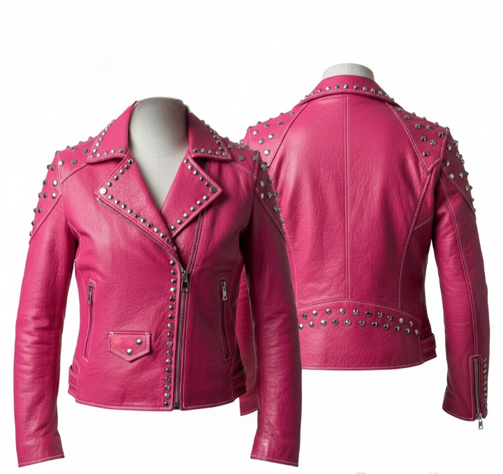 Crafted Leather Women Pink Punk Studded Leather Jacket