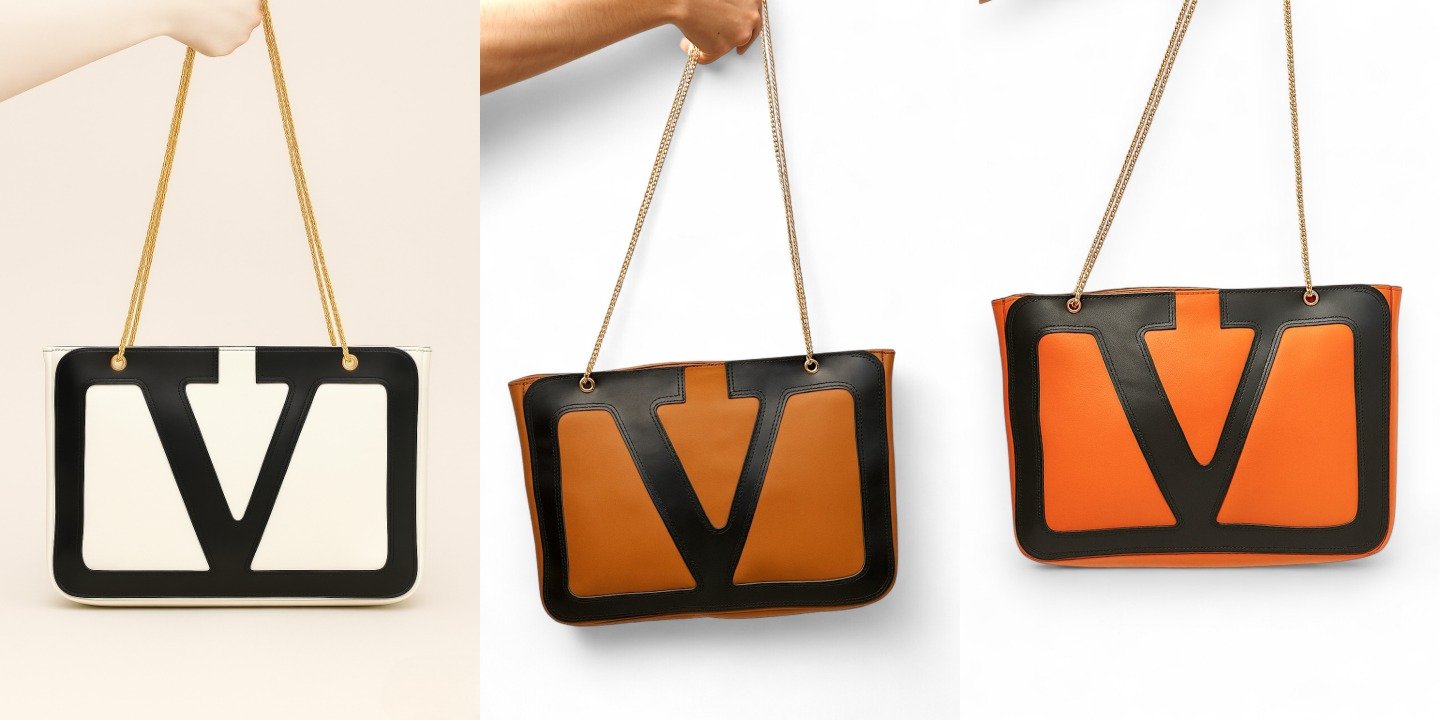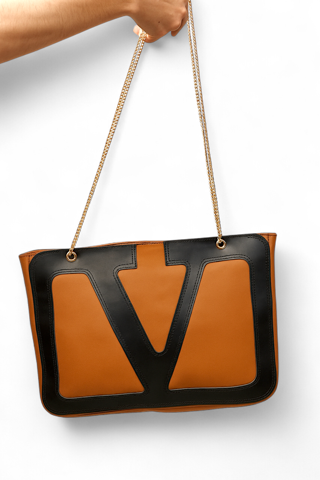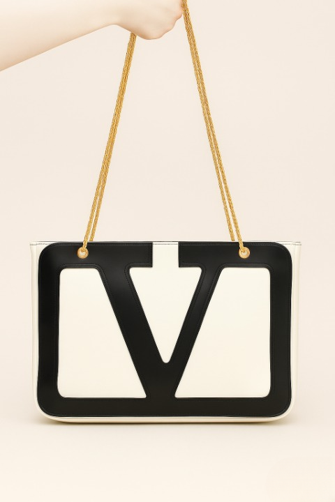 Crafted Leather Classic and Luxury Design Black / White V Logo Shopping Bag For Women