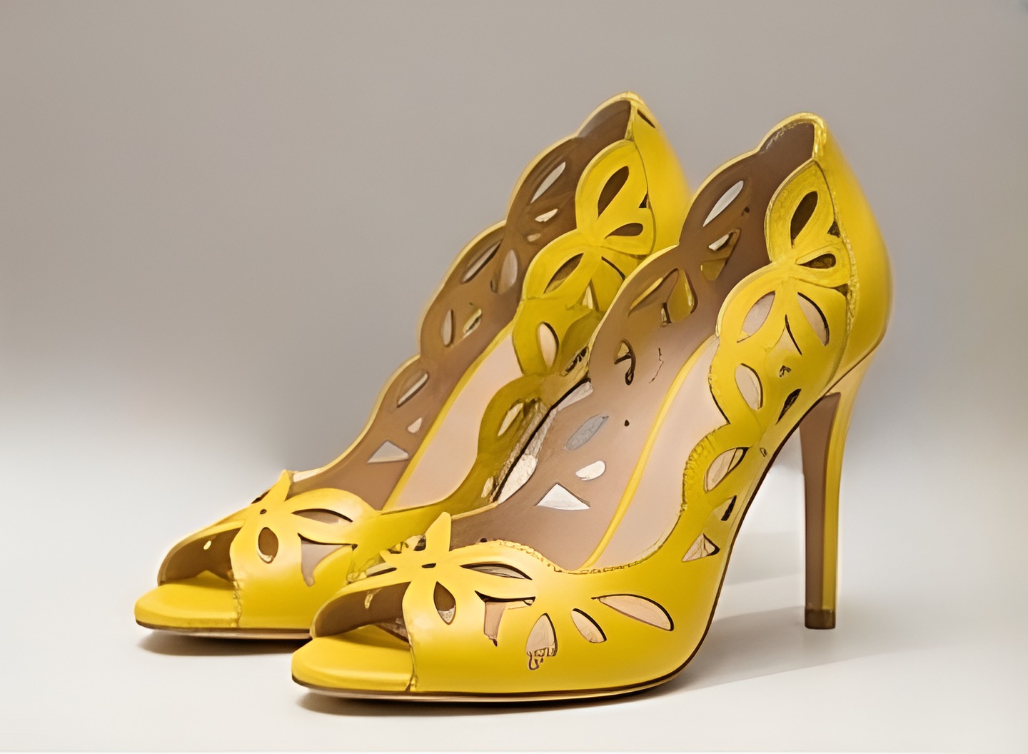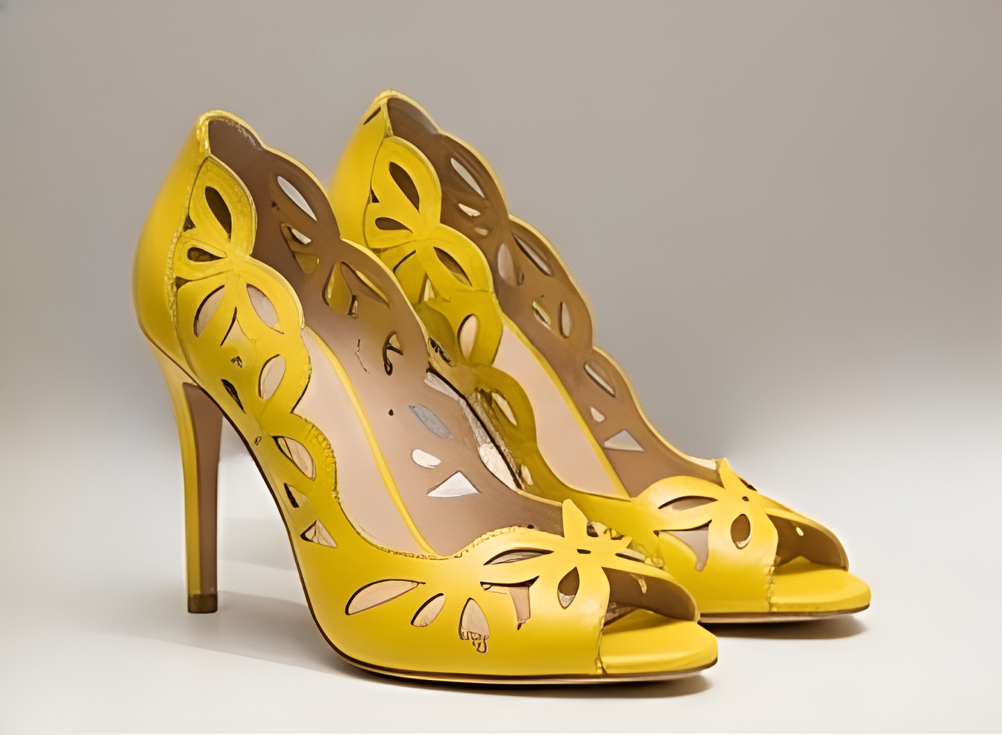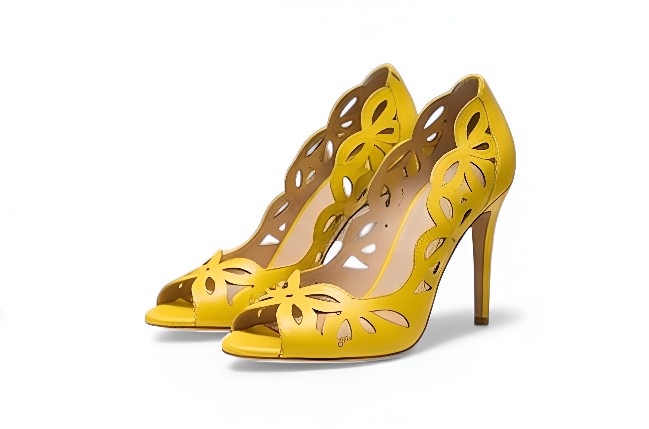 Crafted Leather Classic Women Yellow Leather High Heel Dress Shoes Open Toe with Elegant Cut Out Design