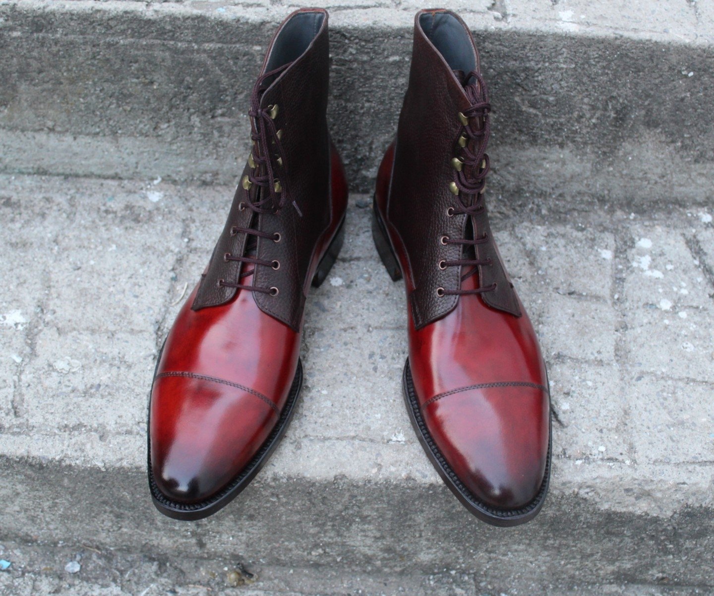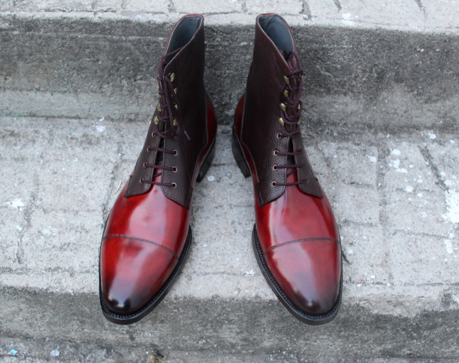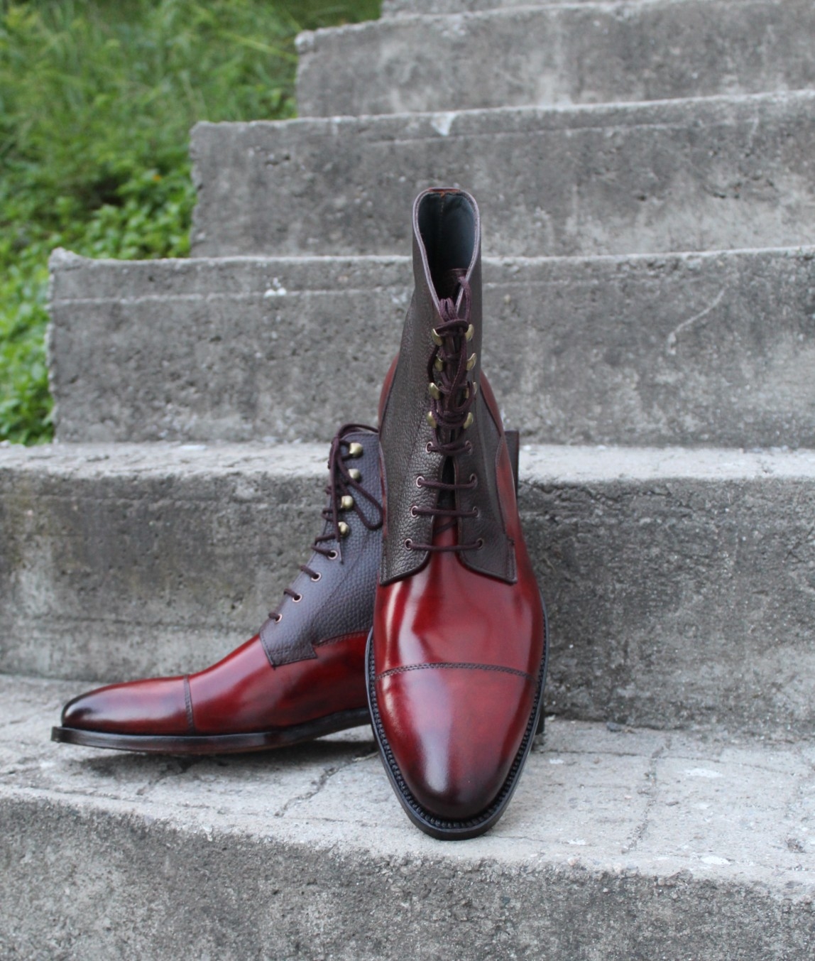 Crafted Leather Men's Red Patina Brown Grain Leather High Ankle Lace up Boots