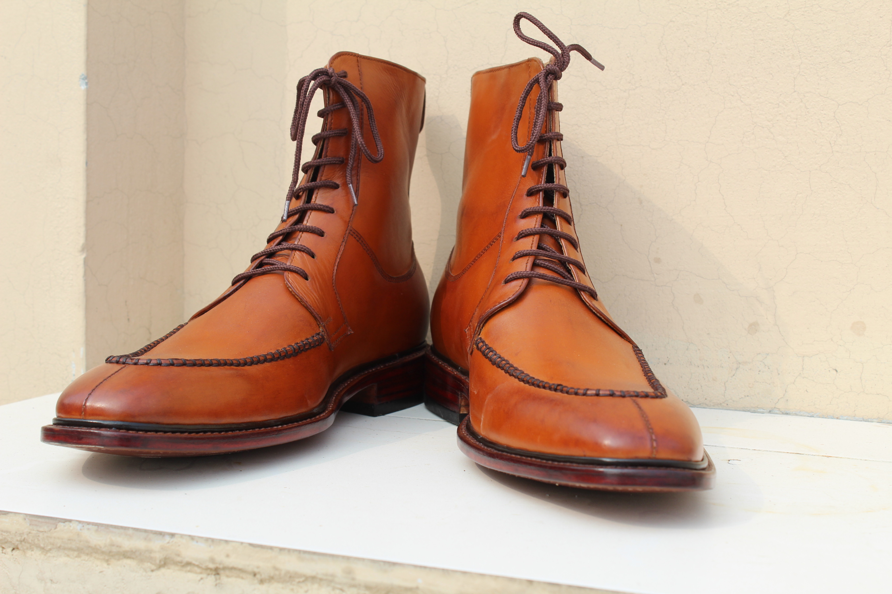Inner: Soft Leather  Sole: Leather  Gender : Male Heel: Leather Color: Brown  Style: High Ankle Lace up Boot Totally Hand stitched Manufacturing time 7-10 business days If you can’t find your Size/Color just send us message we will make for you.