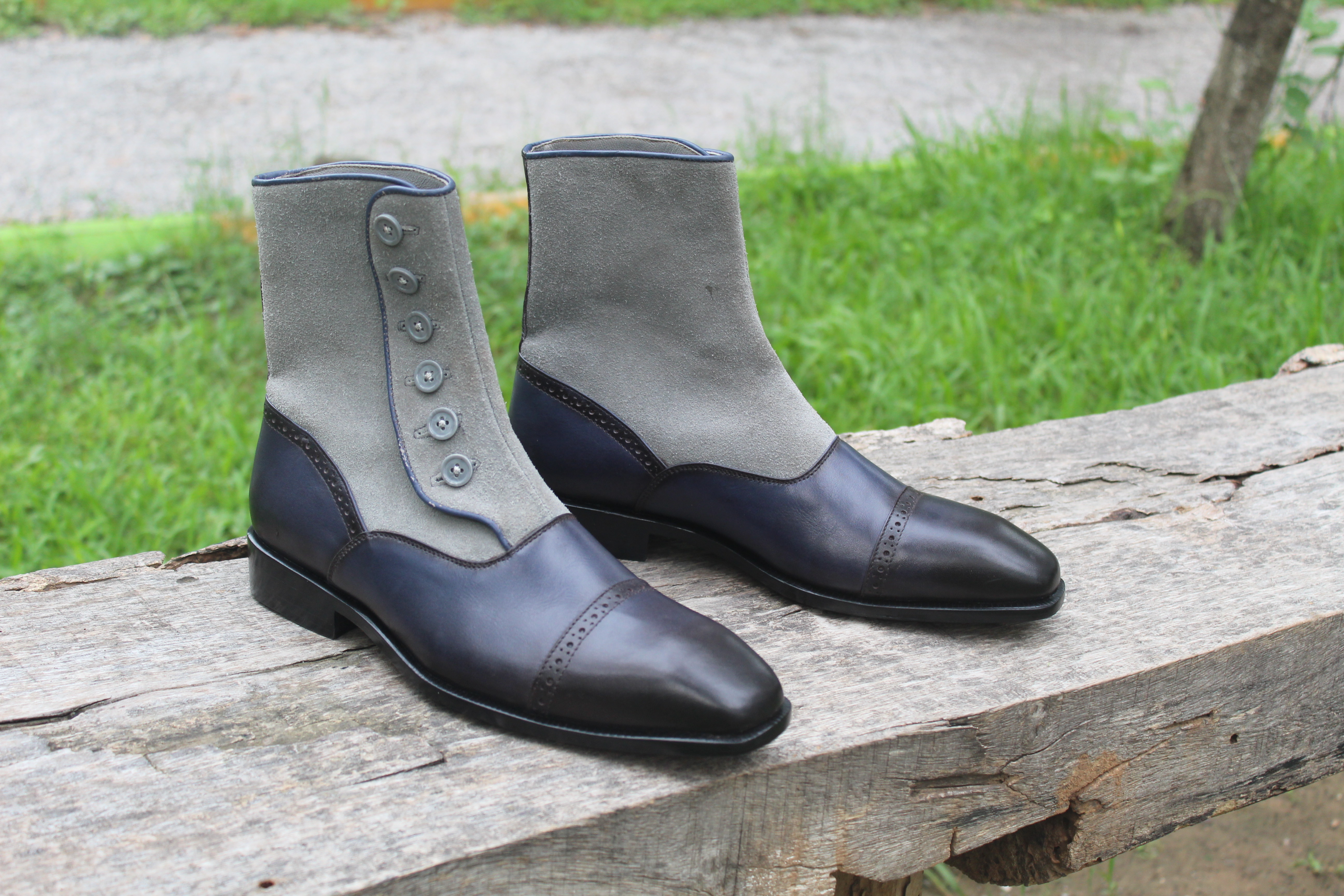Crafted Leather Classic Mens Blue Leather Gray Suede Button Ankle High Dress Style Men's Long Boot