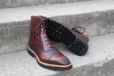 Crafted Leather Handmade Ankle High Burgundy Calf Leather Lace up Boot