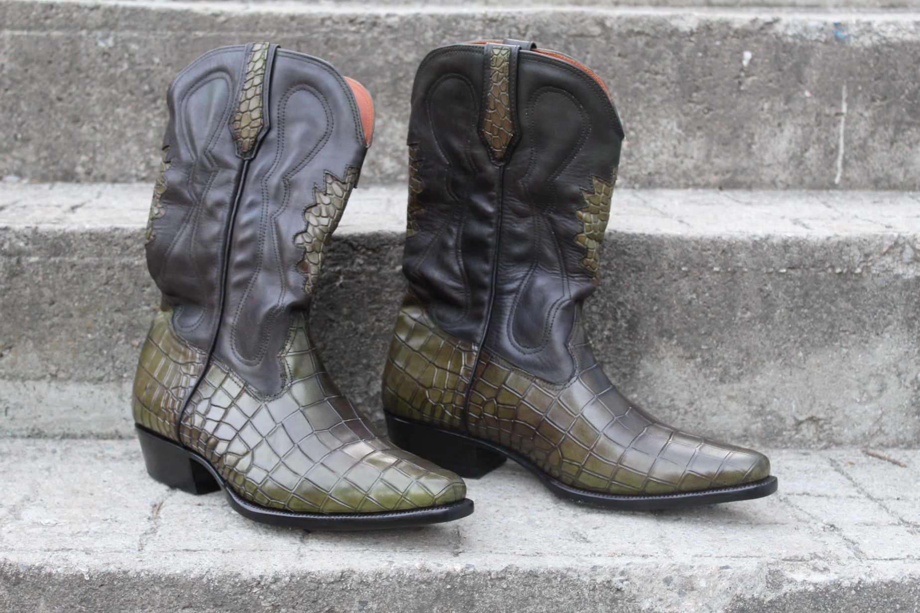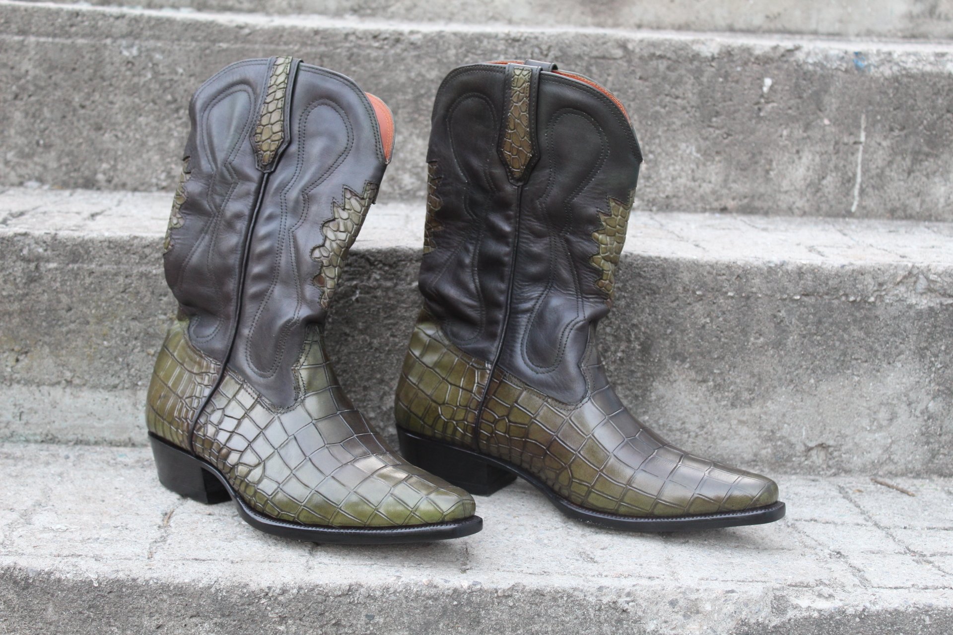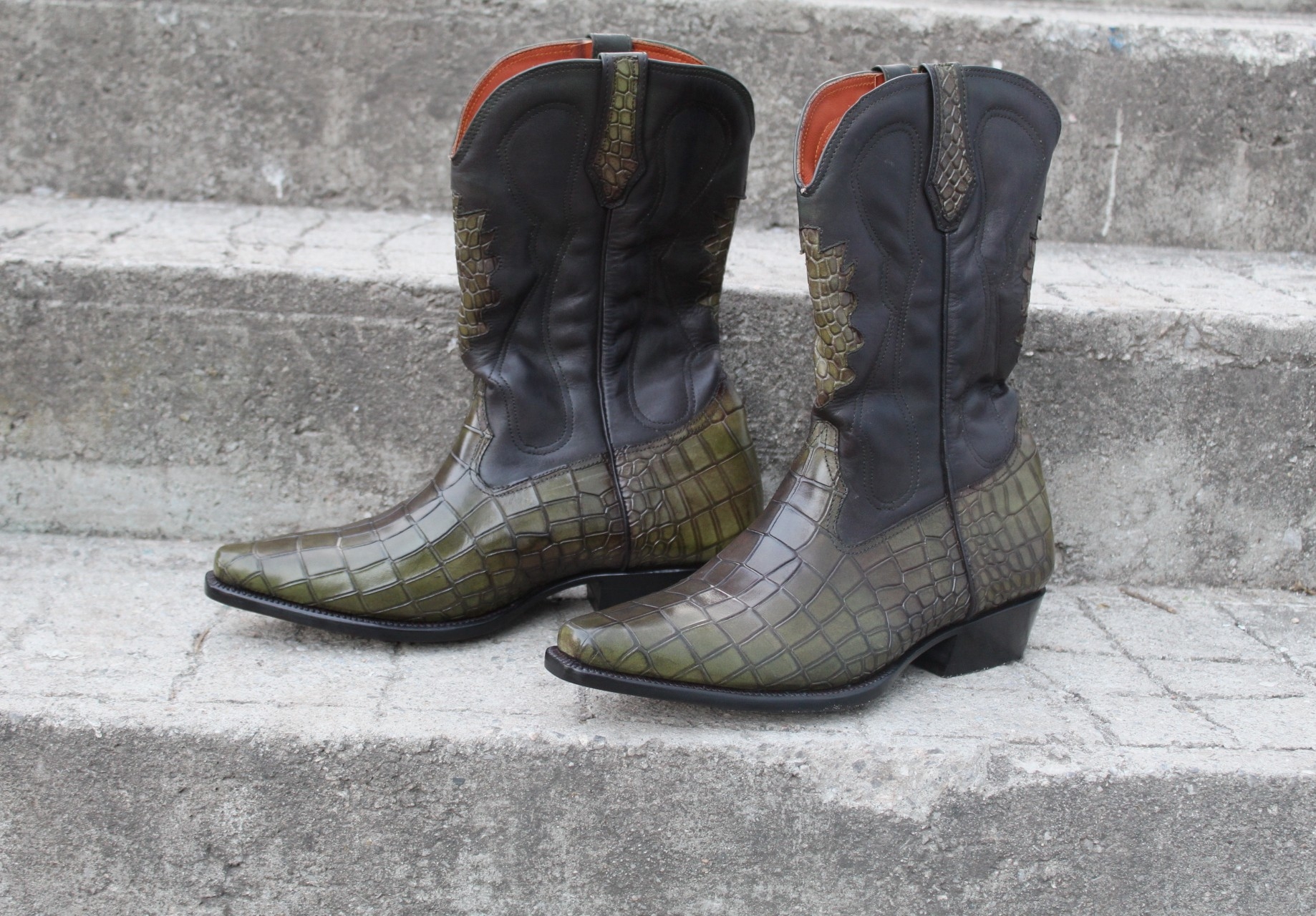 Crafted Leather Classic Men Fashion Green Crocodile/Alligator Patina Cowboy Ankle Long Boot