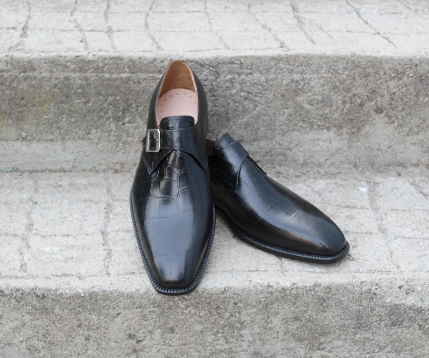 Crafted Leather Classic Black Crocodile/Alligator Leather Single Monk Strap Shoes