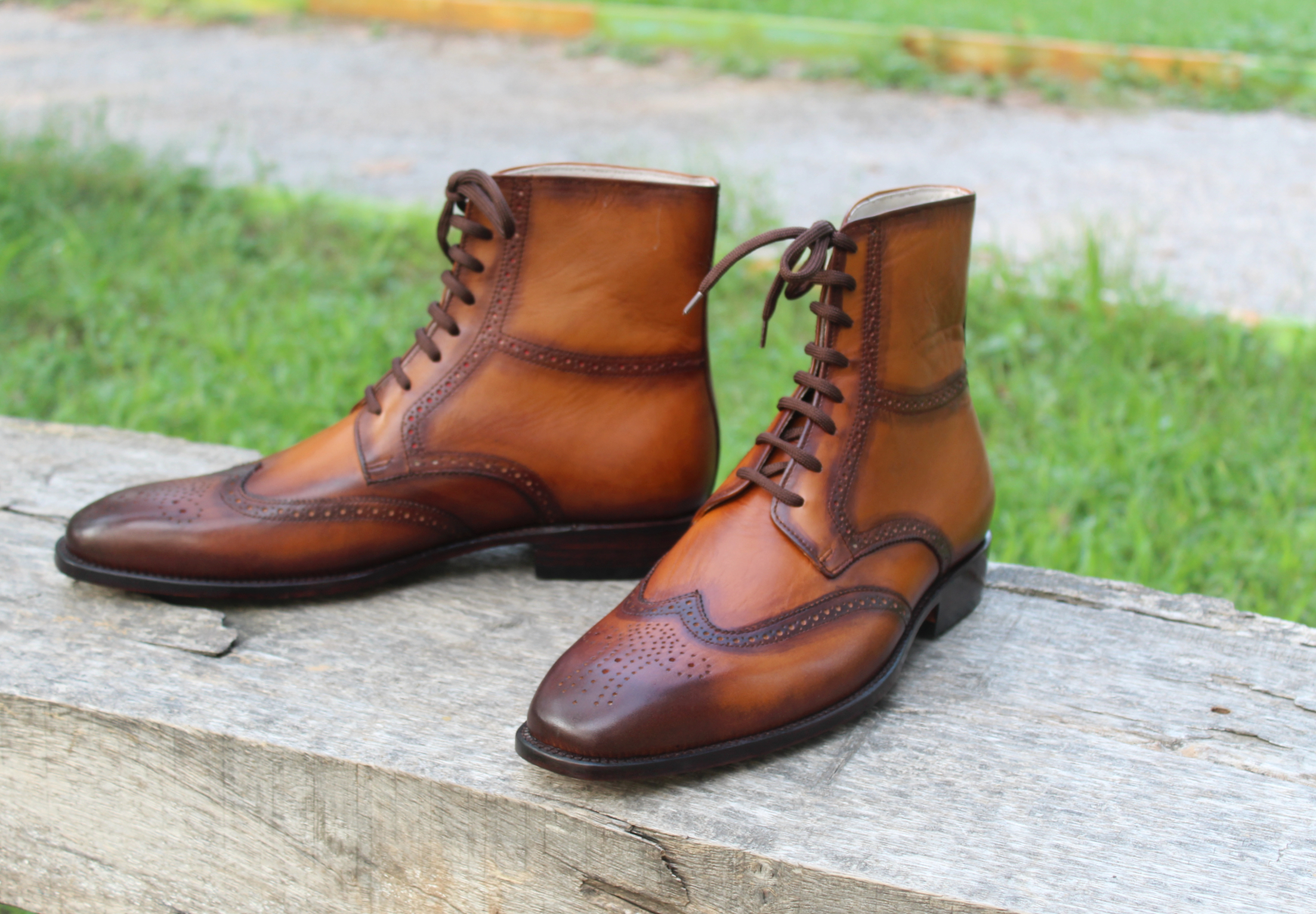 Inner: Soft Leather Sole: Leather Gender : Male Heel: Leather Color: Brown Style: Ankle High Lace up Boot Lining Soft Calf Leather Lining Totally Hand stitched Manufacturing time 7-10 business days If you can’t find your Size/Colorjust send us message we will make for you.