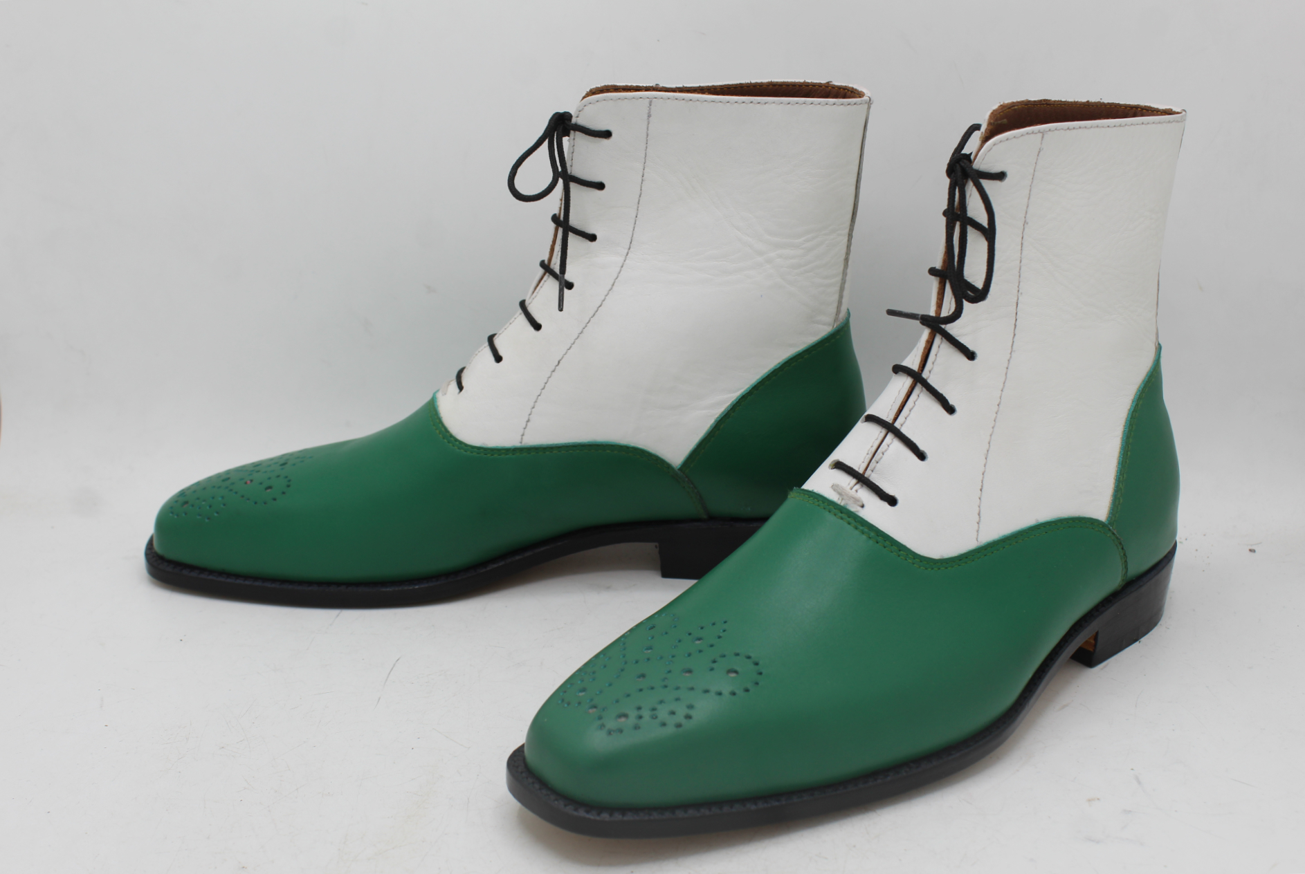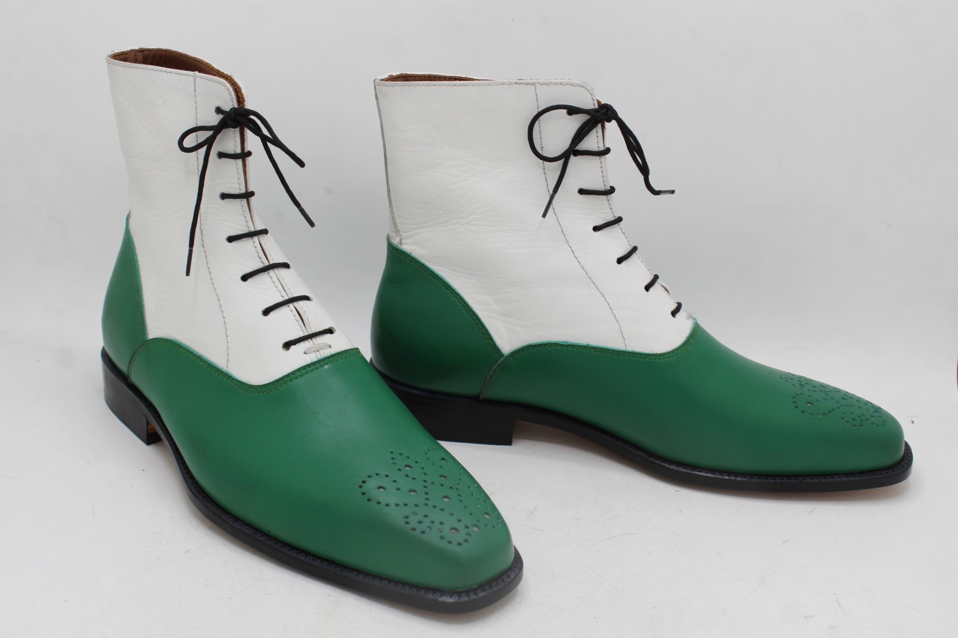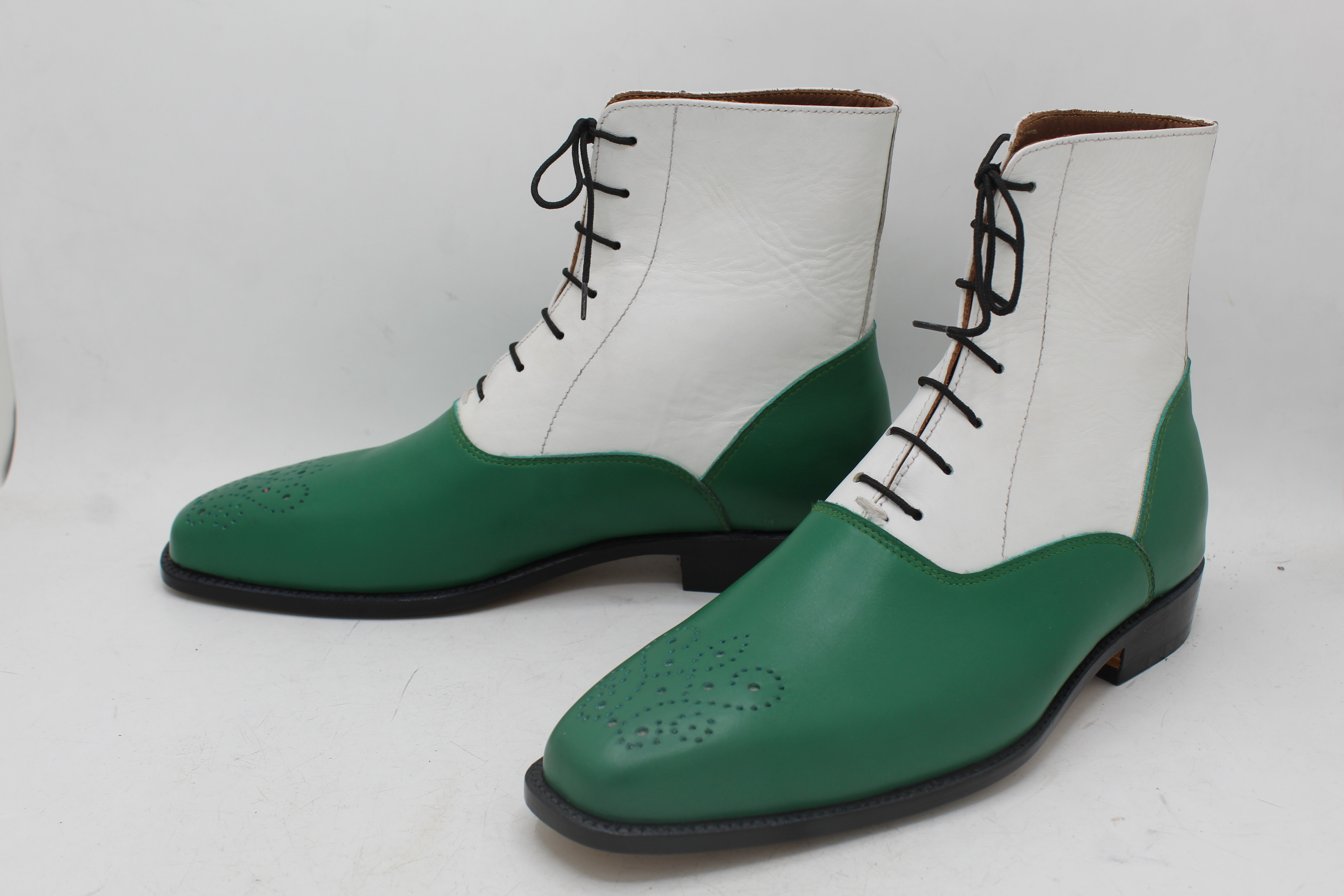 Inner: Soft Leather Sole: Leather Gender : Male Heel: Leather Color: Two Tone Green & White Style: Lace Up Ankle High Boots Lining Soft Calf Leather Lining Totally Hand stitched Manufacturing time 7-10 business days If you can’t find your Size/Color just send us message we will make for you.