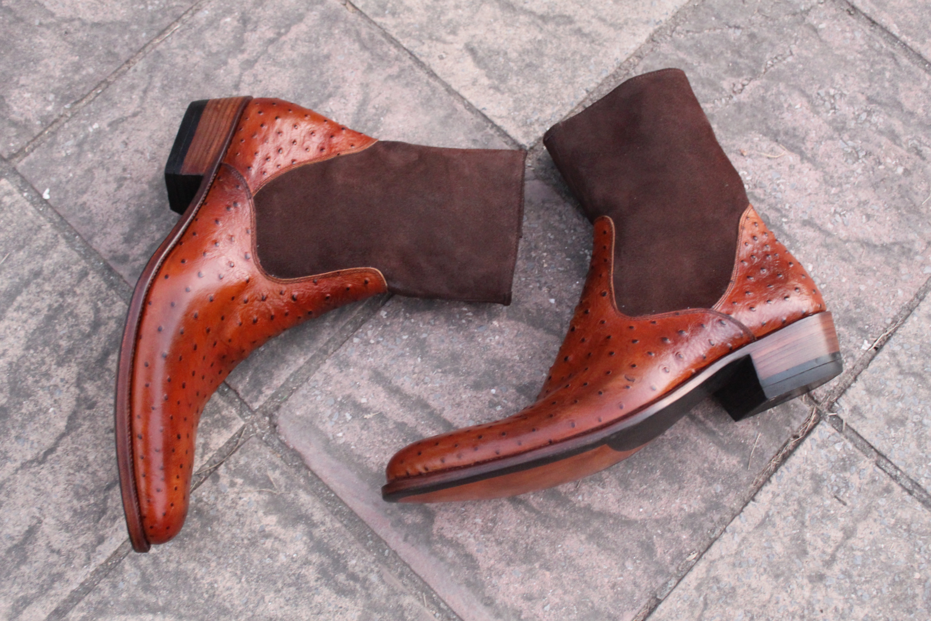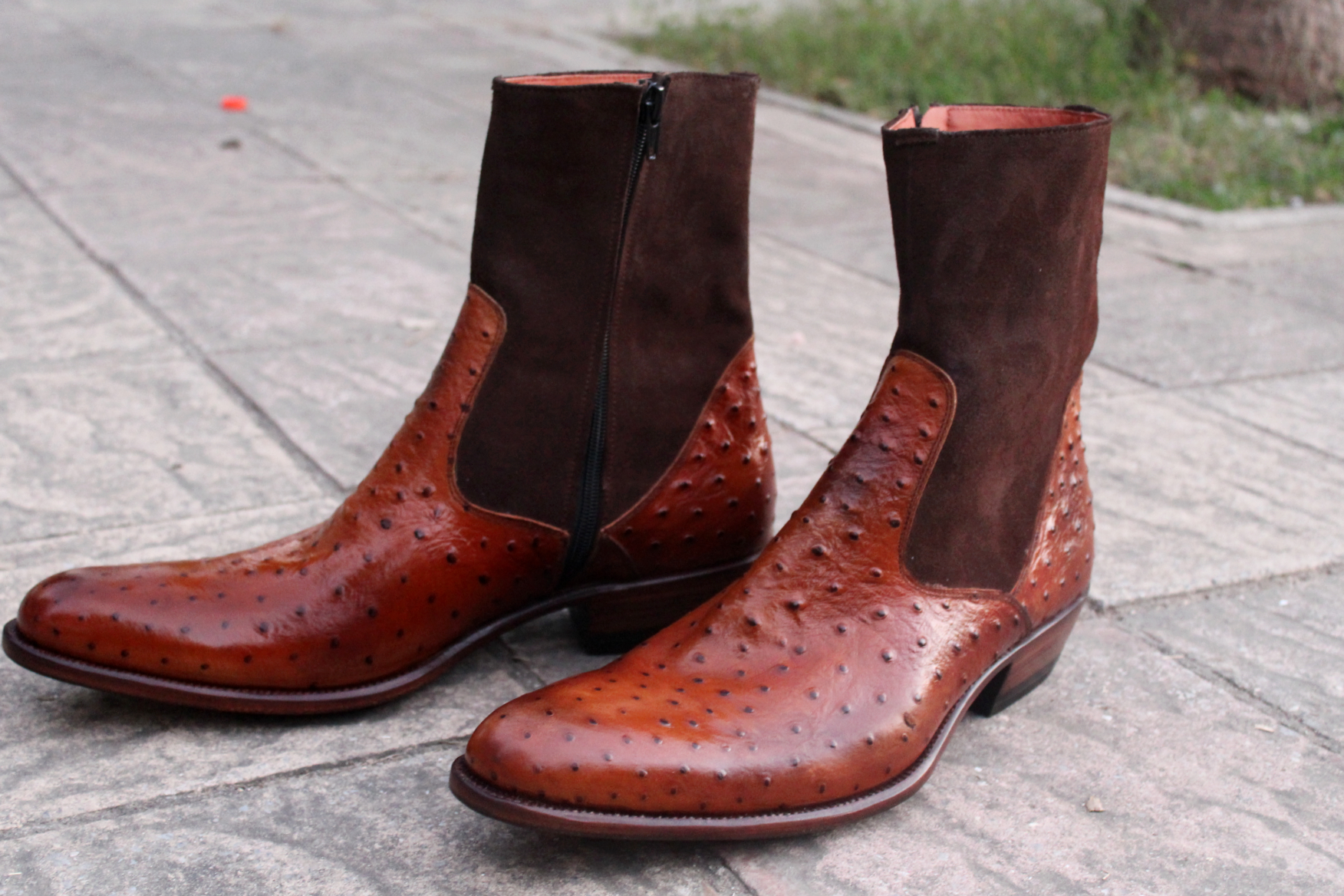 Crafted Leather Classic Brown Ostrich Suede Leather Ankle High Cowboy Boot