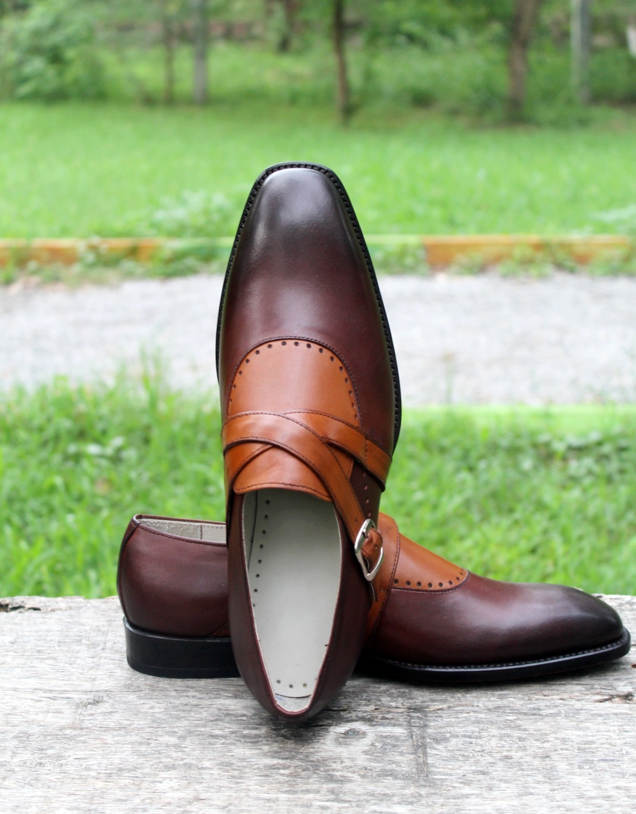 Crafted Leather Bespoke Dark Brown Patina and Tan Leather Cross Buckles Monks Strap Shoes