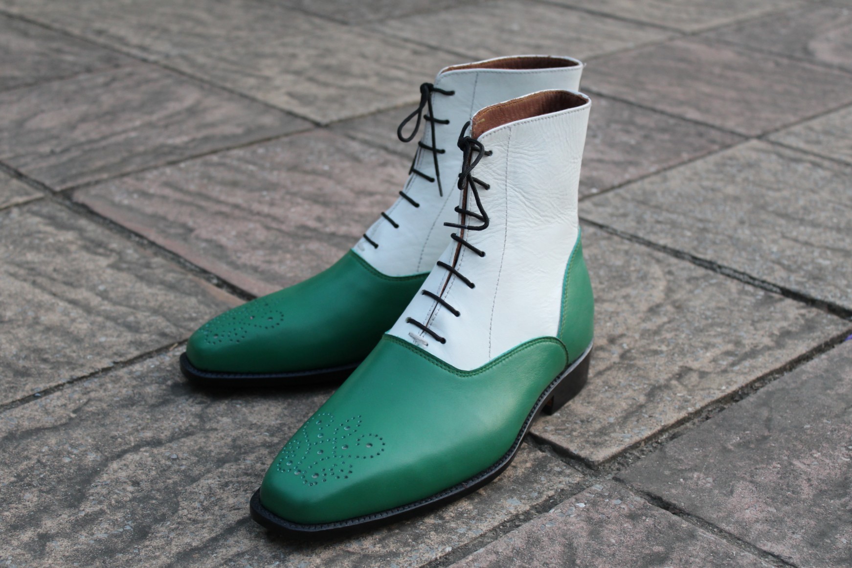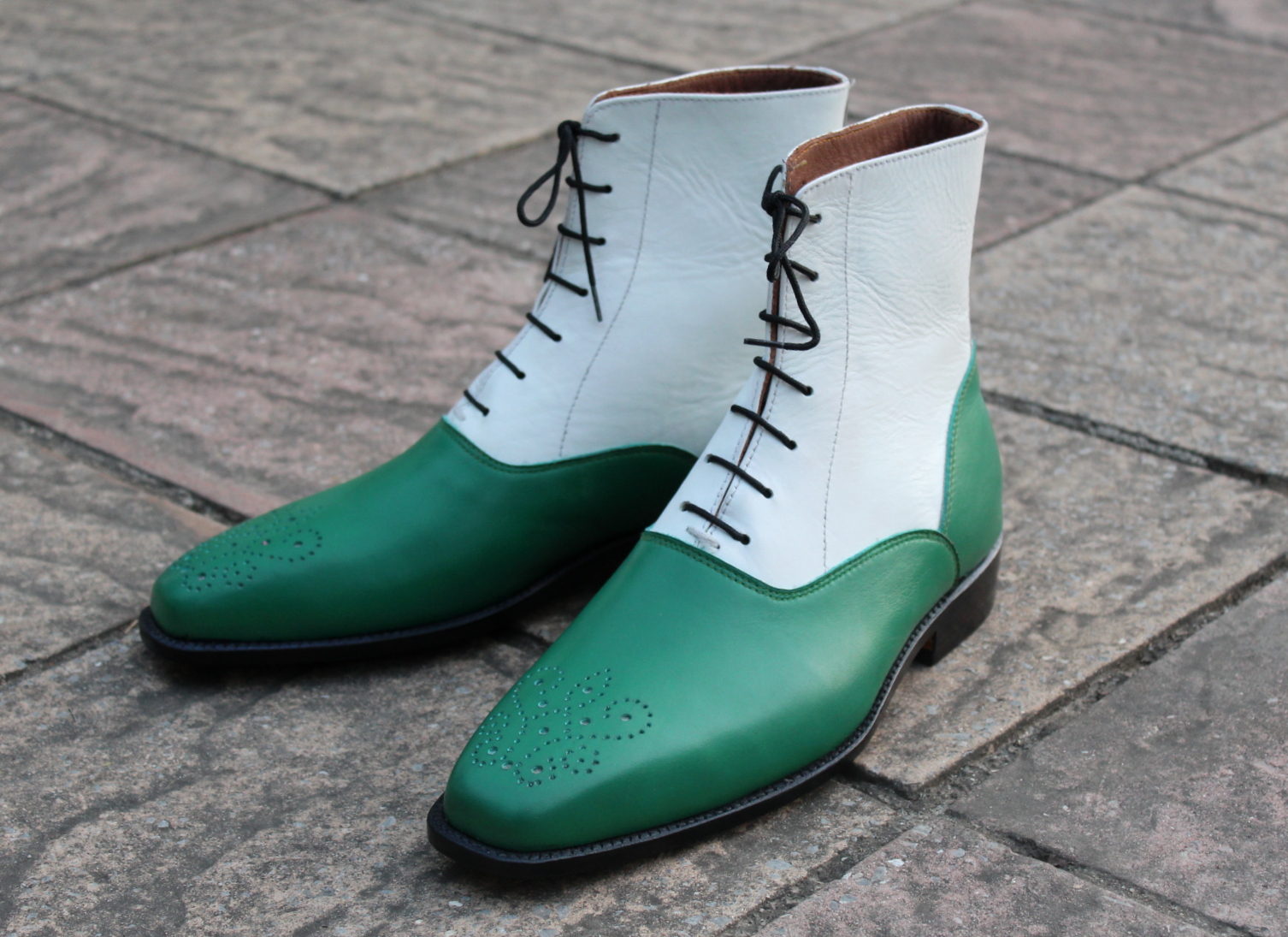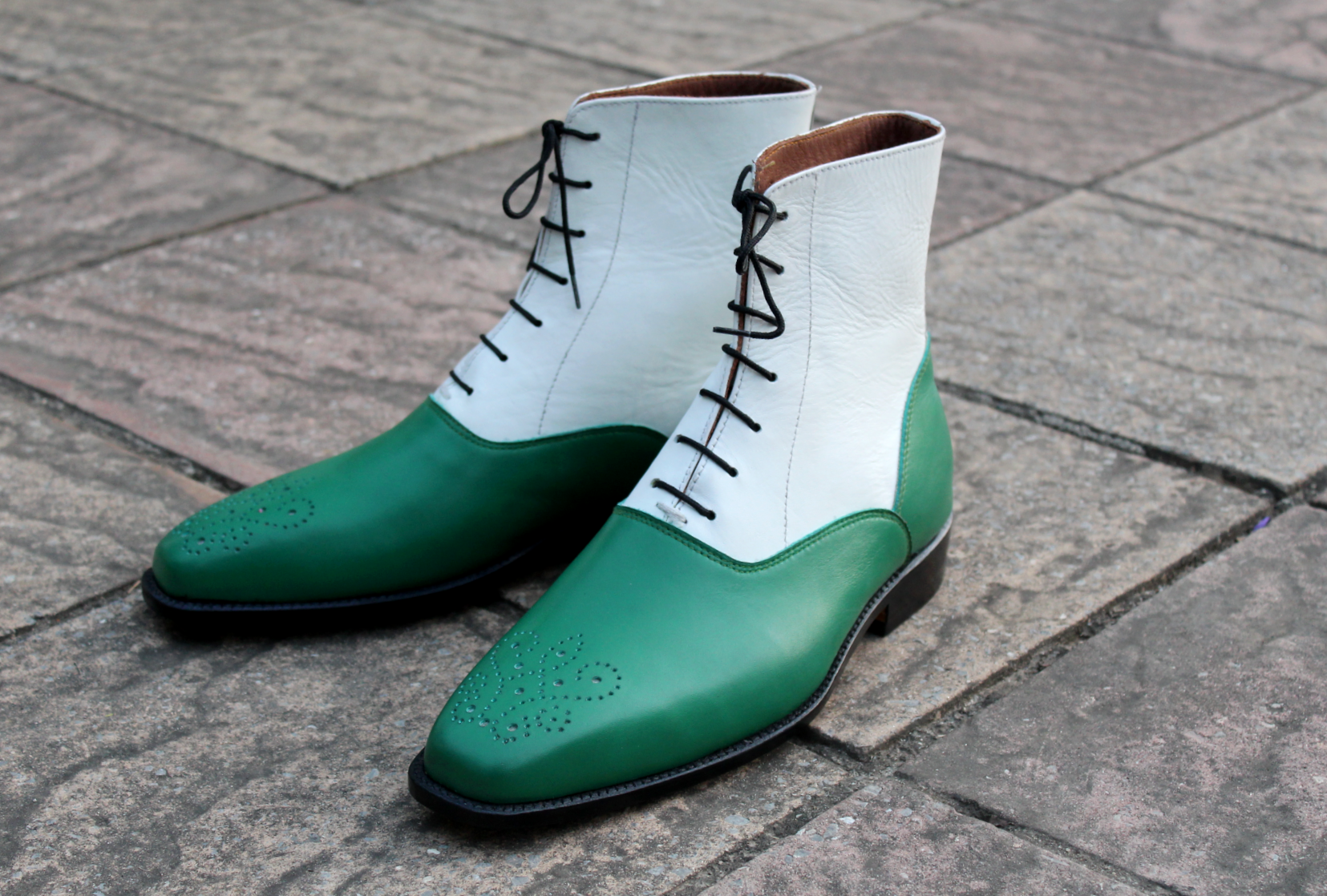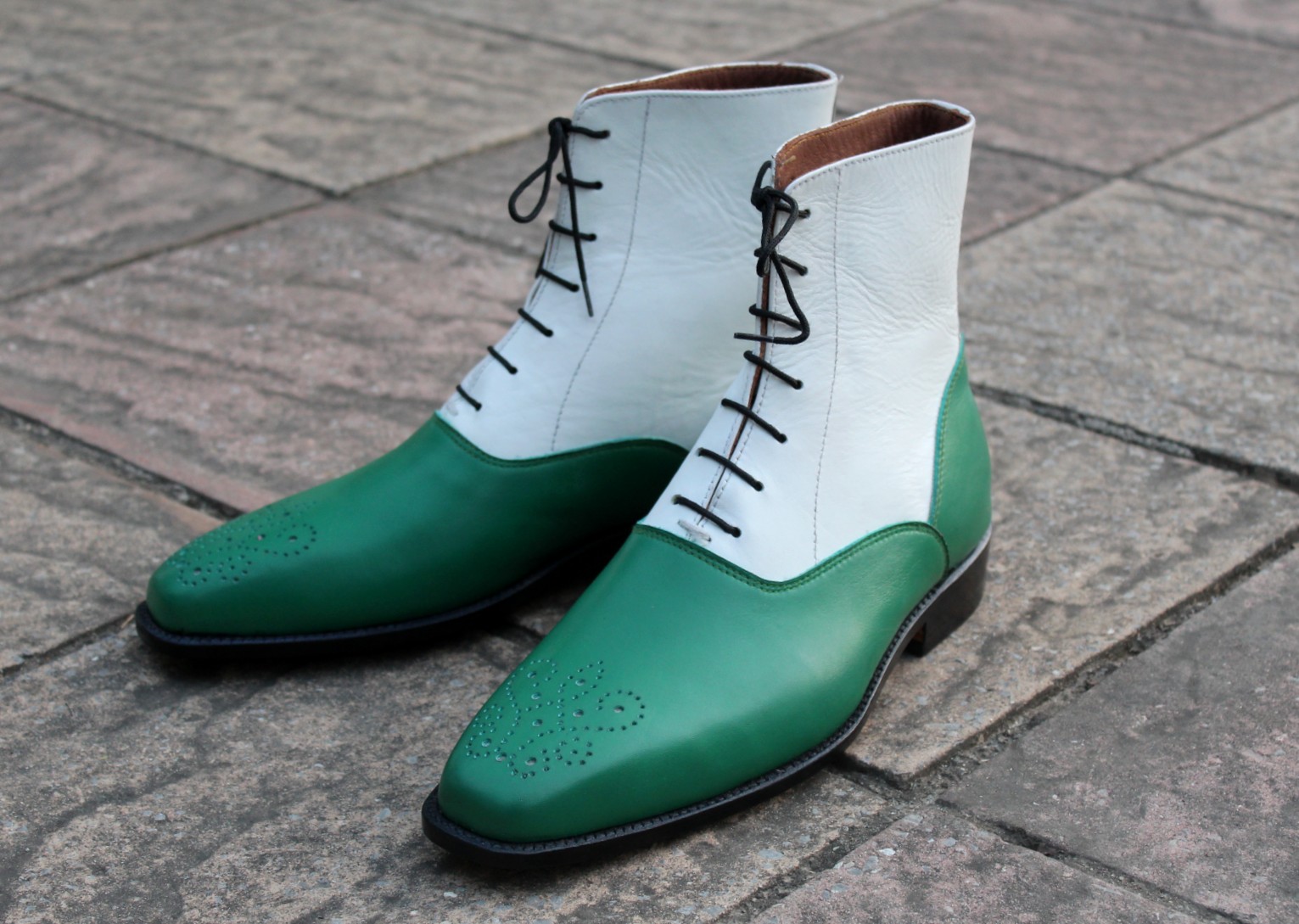 Inner: Soft Leather Sole: Leather Gender : Male Heel: Leather Color: Green / White Style: Ankle High Boot Lining Soft Calf Leather Lining Totally Hand stitched Manufacturing time 7-10 business days If you can’t find your Size/Colorjust send us message we will make for you.